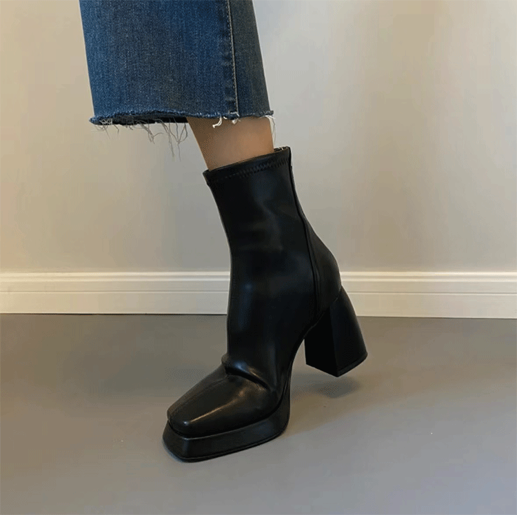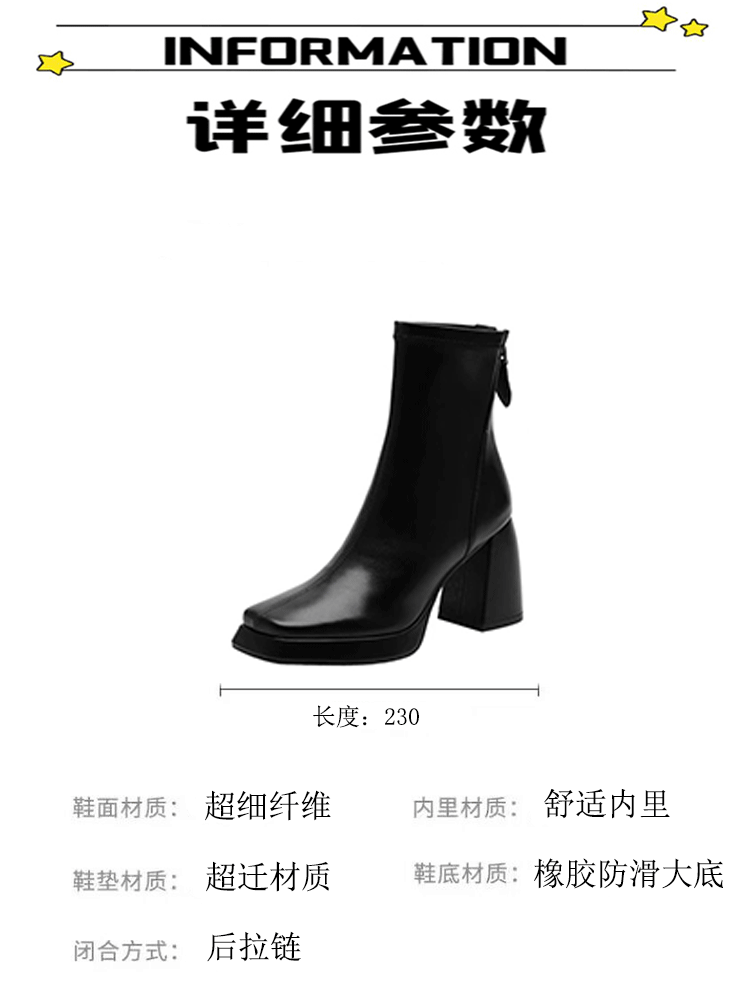 黑色彈力布高跟短靴女秋冬新款短筒方頭粗跟馬丁靴防水台瘦瘦靴女