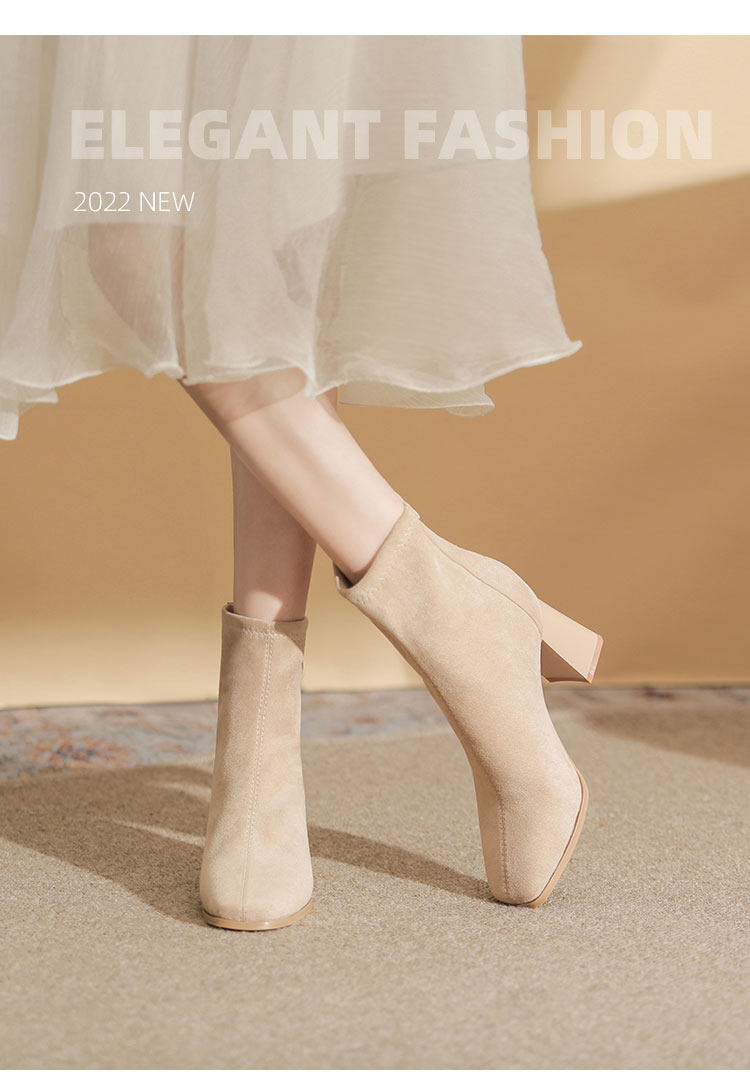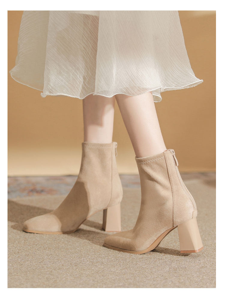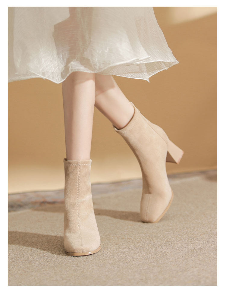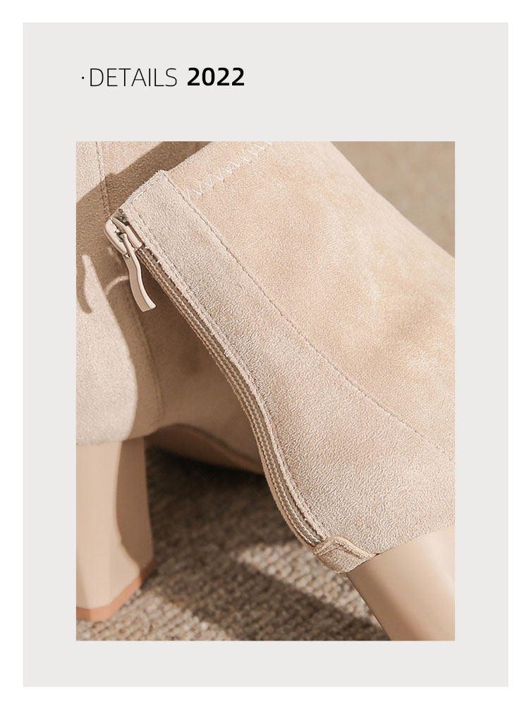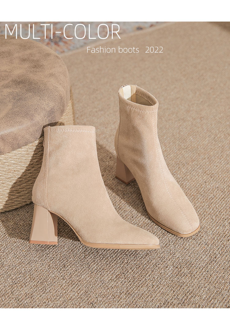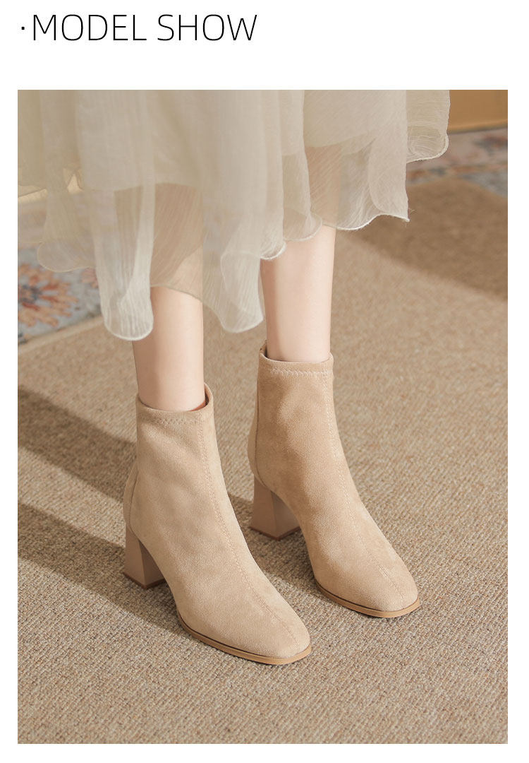 微先生絨面高跟短靴女 顯瘦不累腳短筒靴女 加絨粗跟杏色瘦瘦靴女
