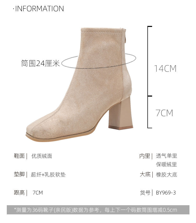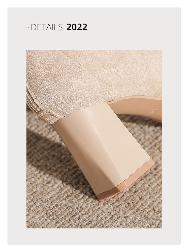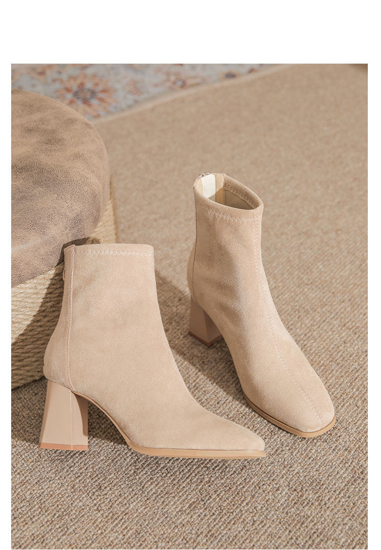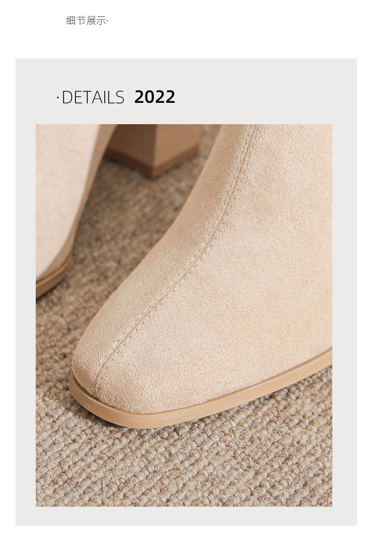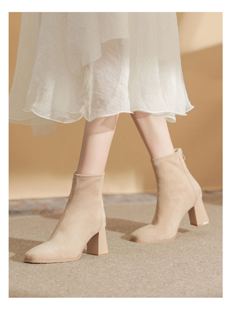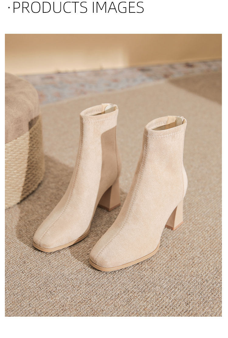 微先生絨面高跟短靴女 顯瘦不累腳短筒靴女 加絨粗跟杏色瘦瘦靴女