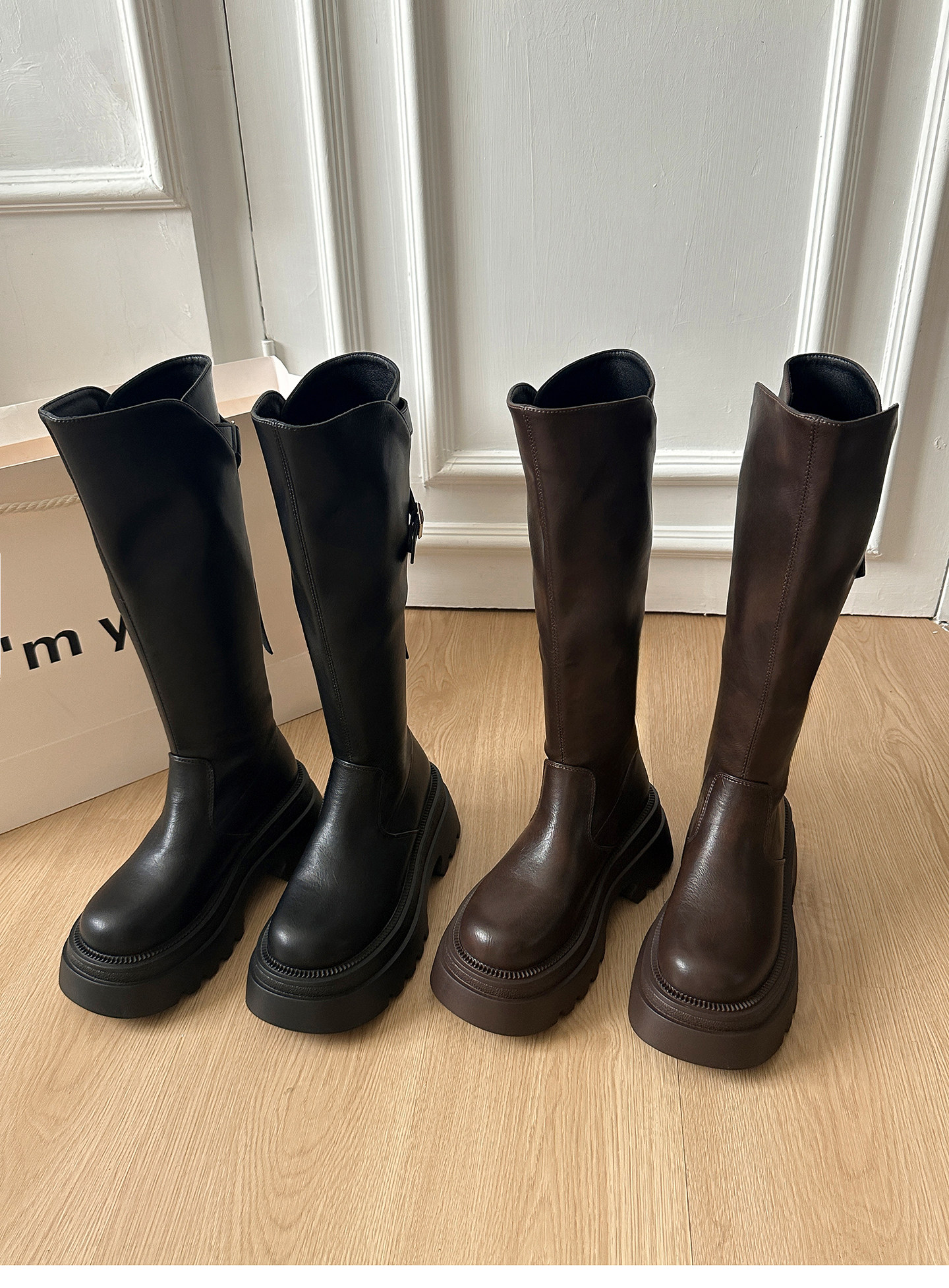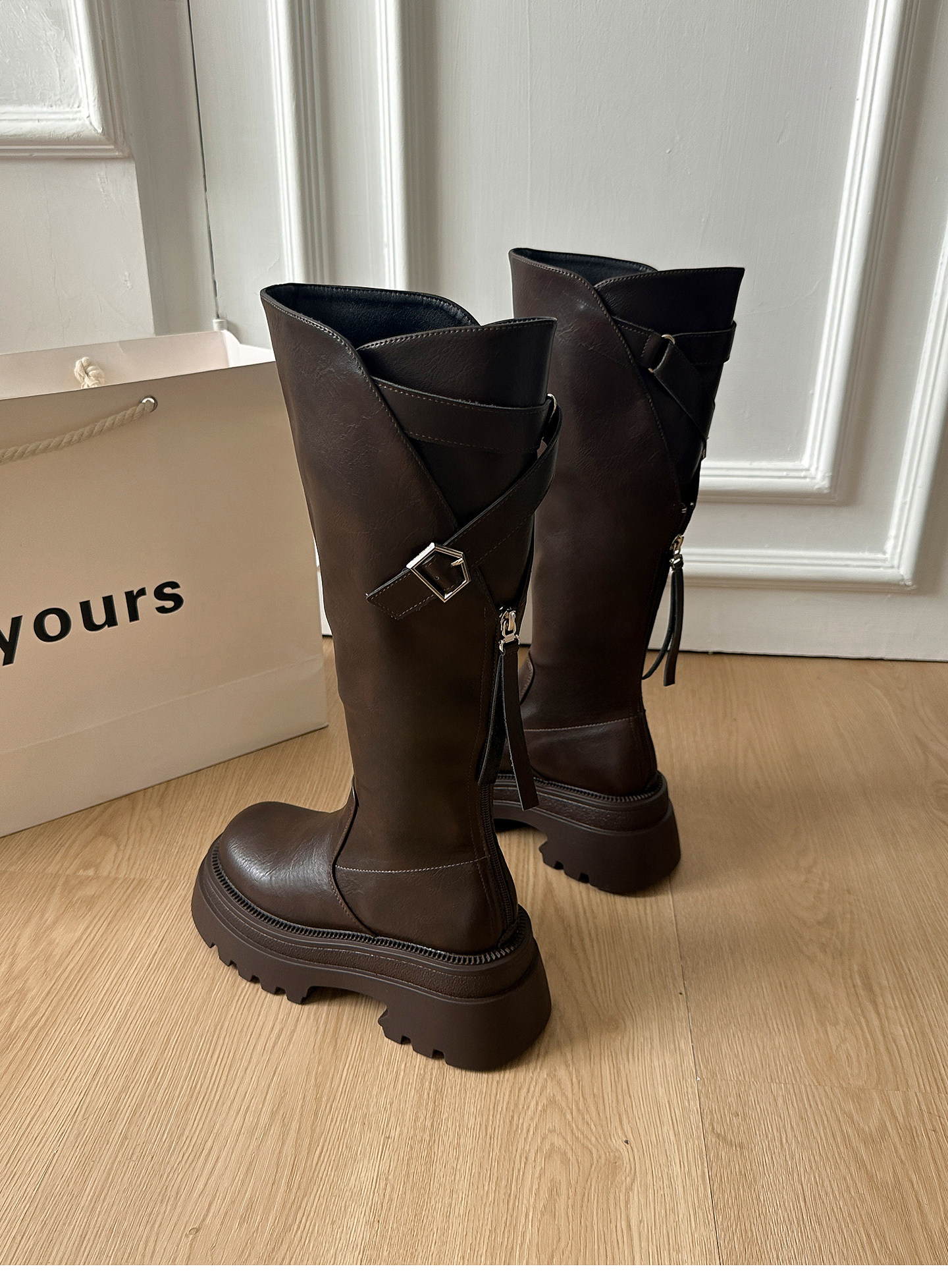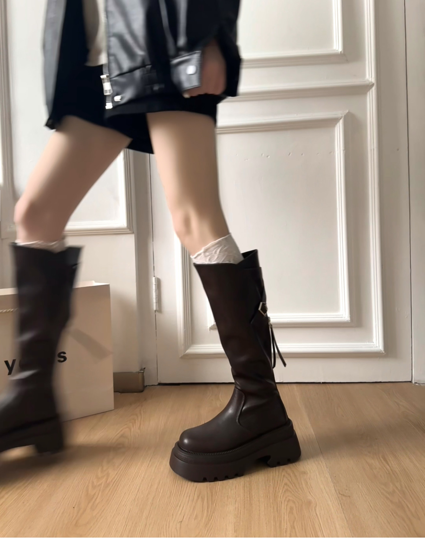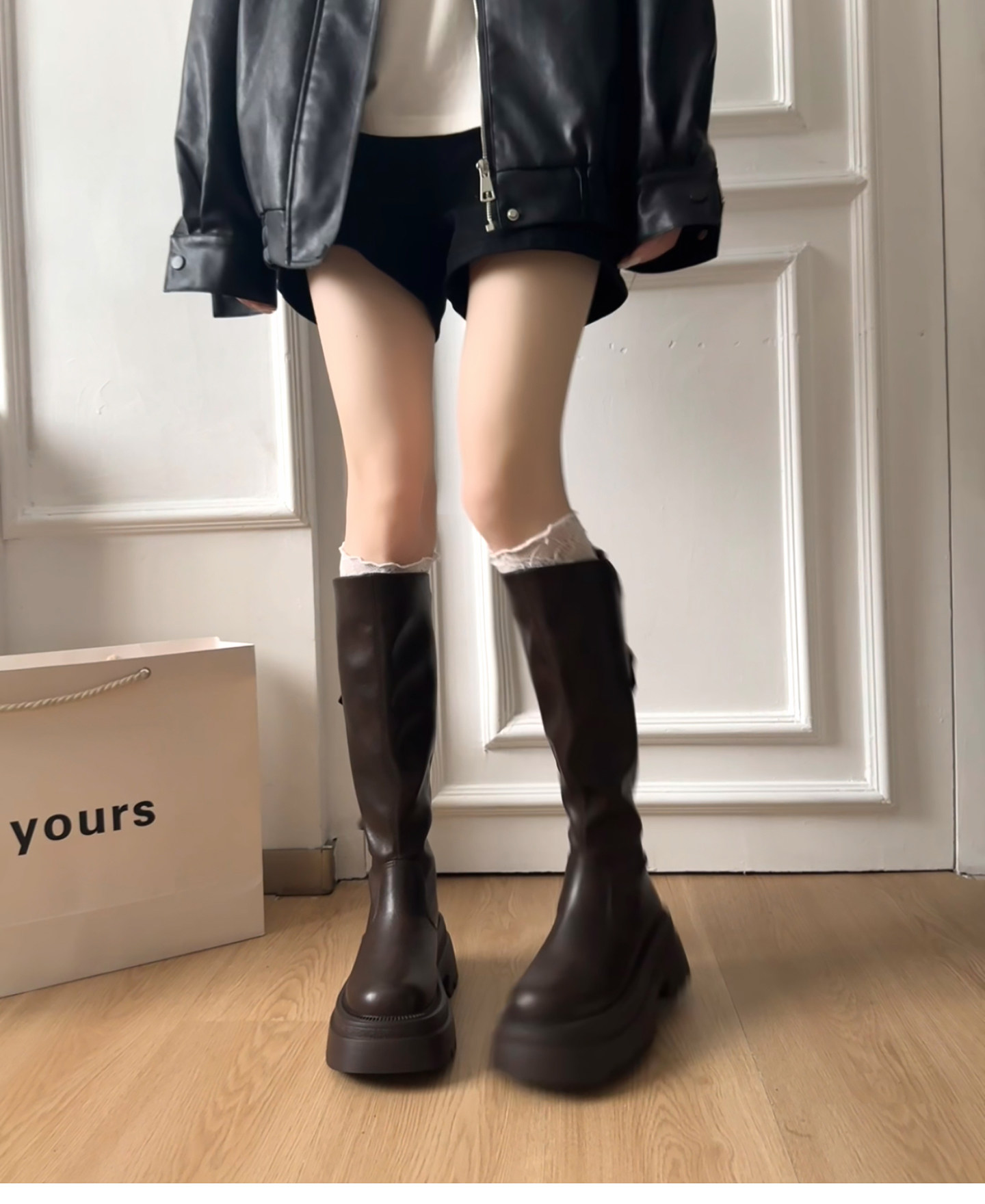 棕色小個子厚底長筒靴女2026年新款春秋顯瘦高筒騎士靴不過膝長靴