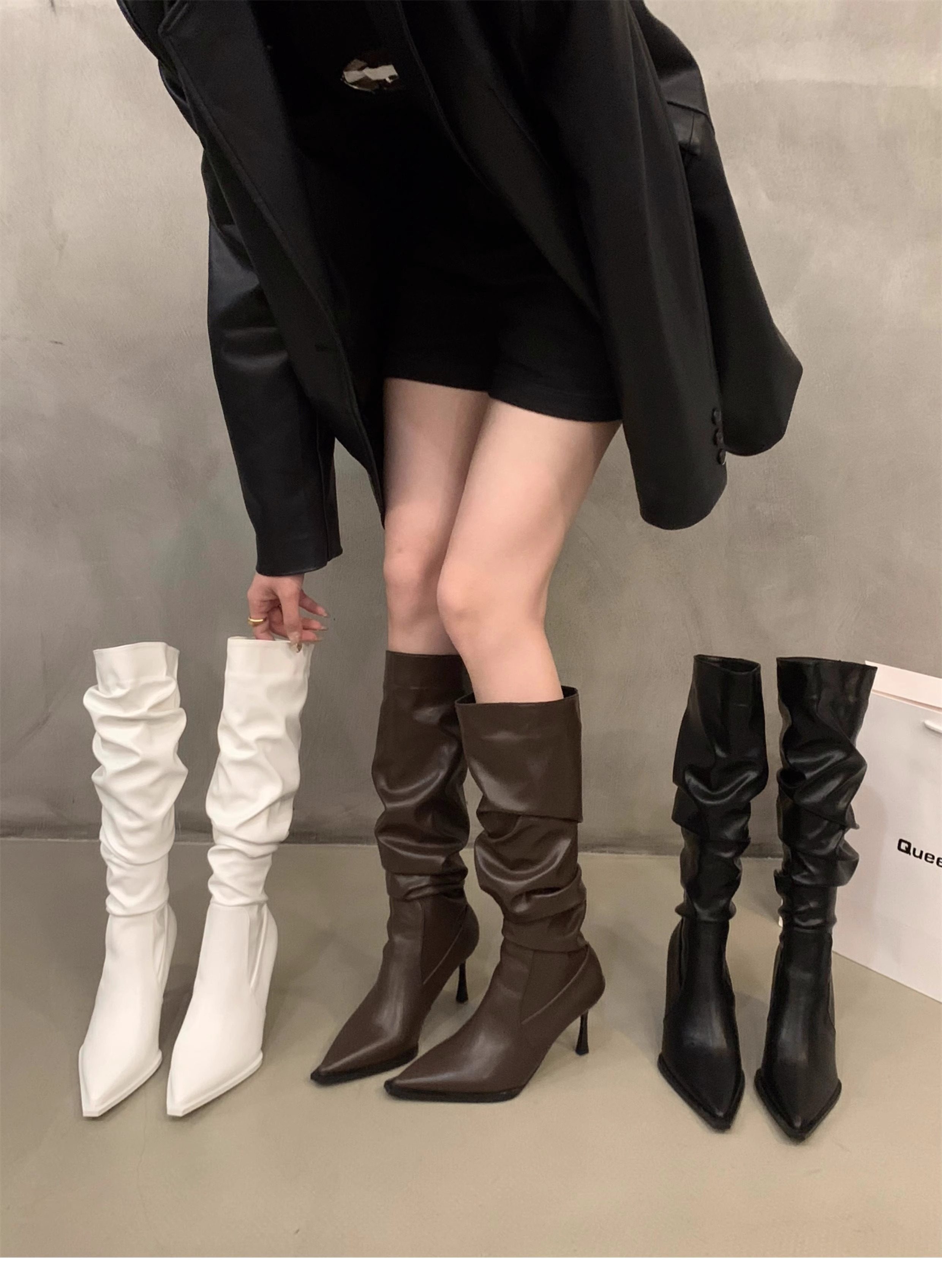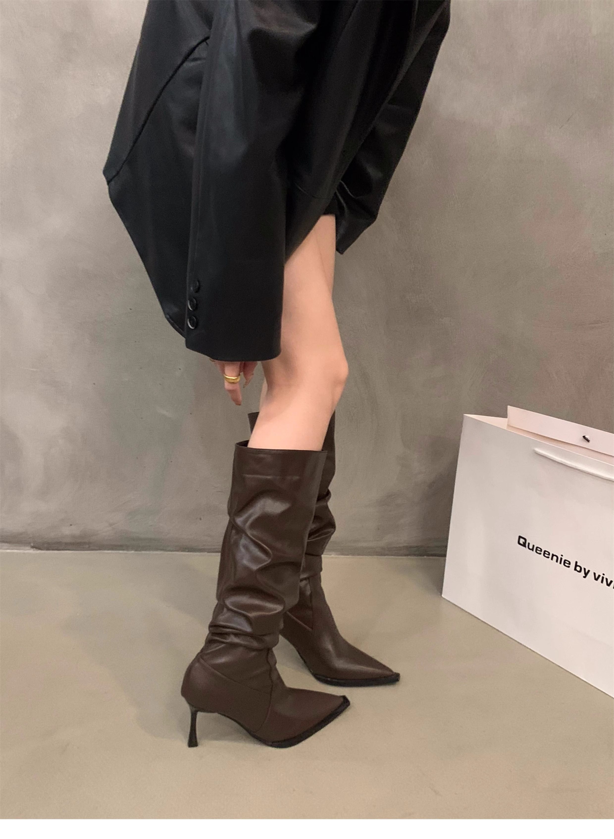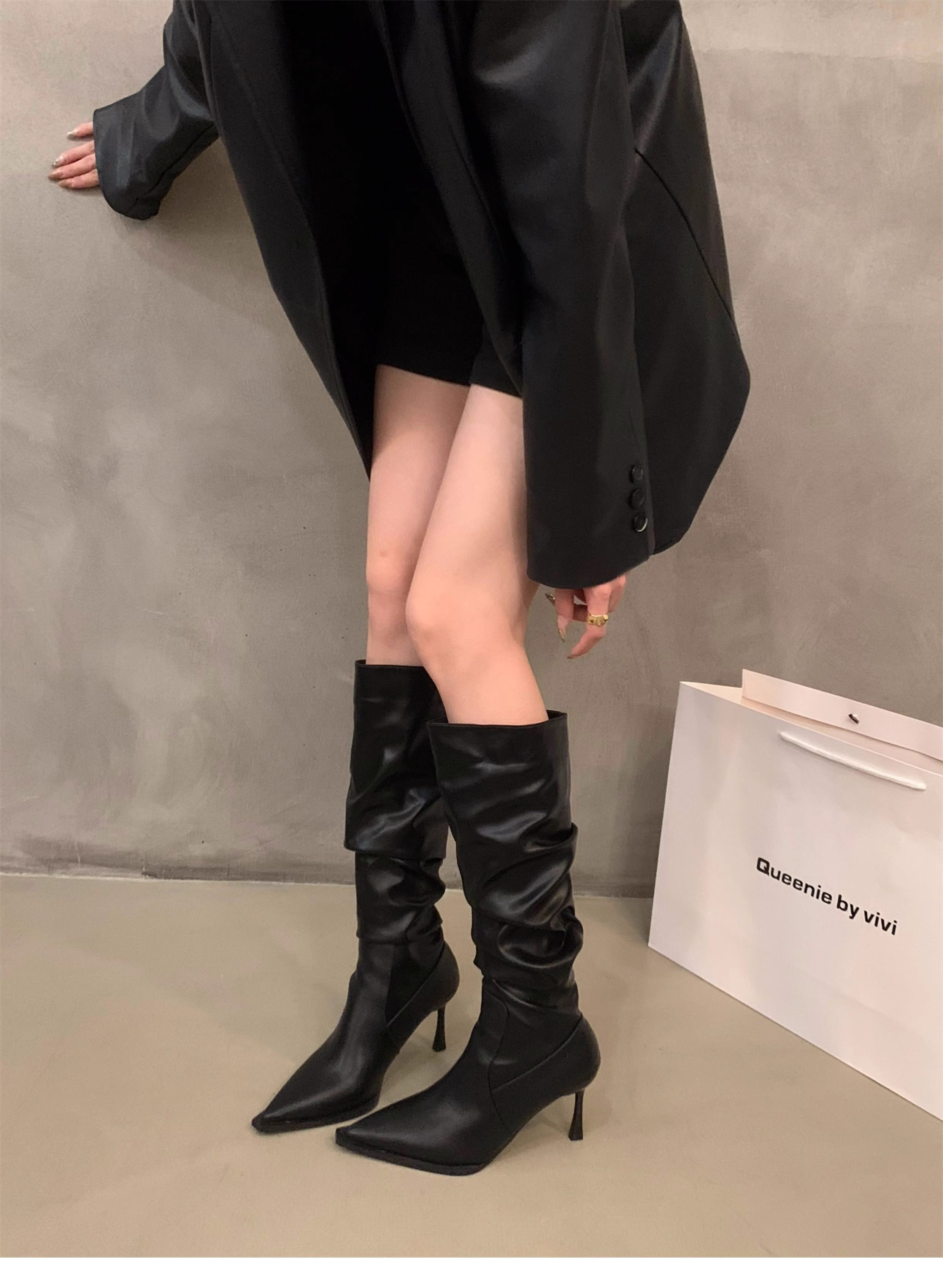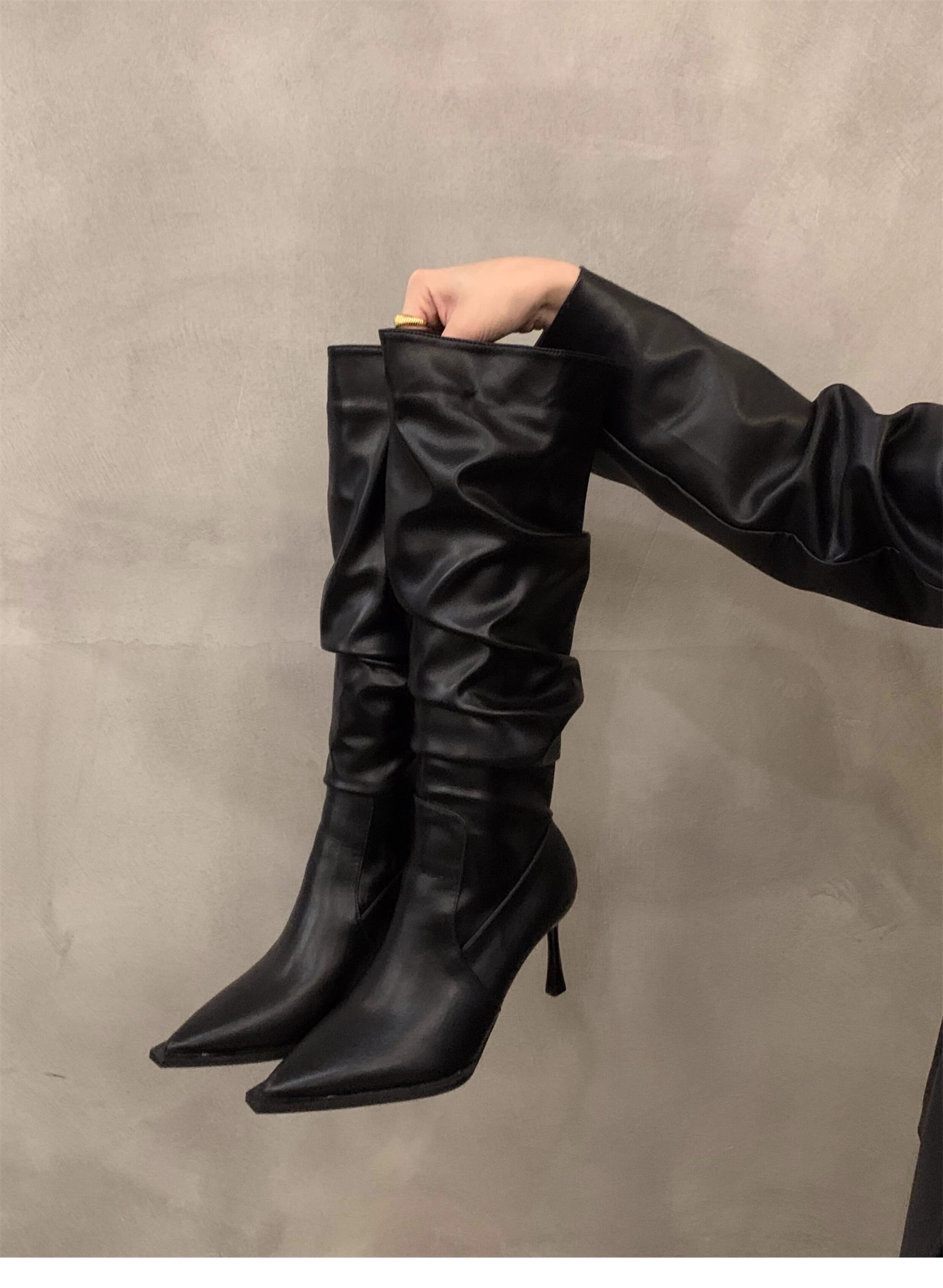軟皮高跟鞋秋冬女細跟堆堆靴子2025新款小腿顯瘦尖頭長筒靴女