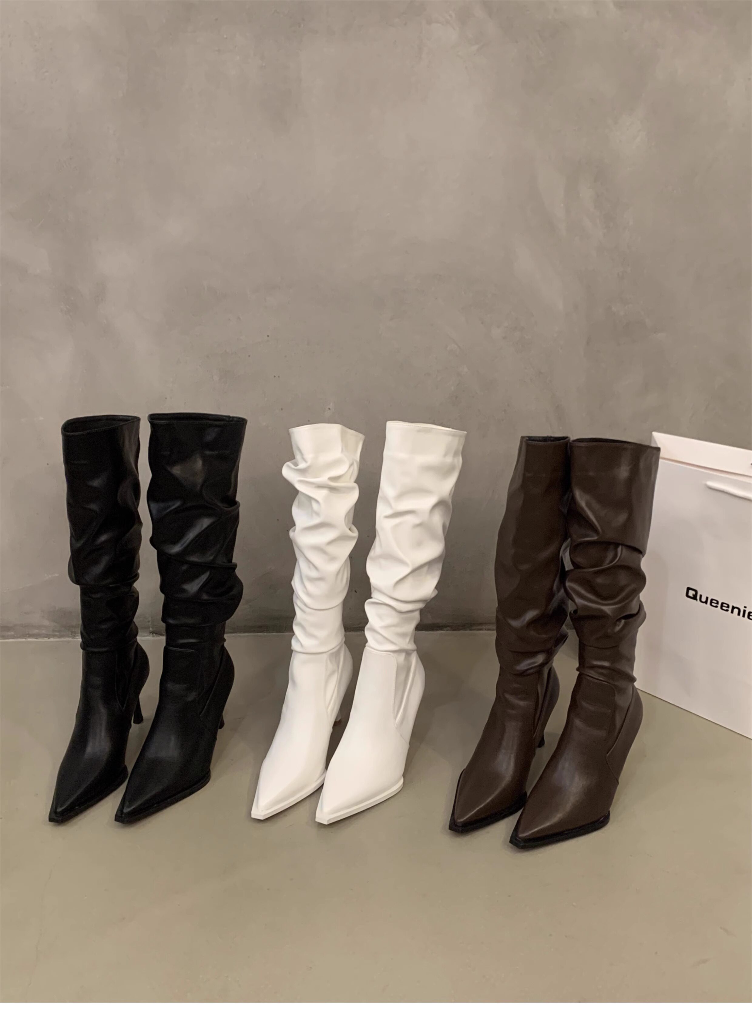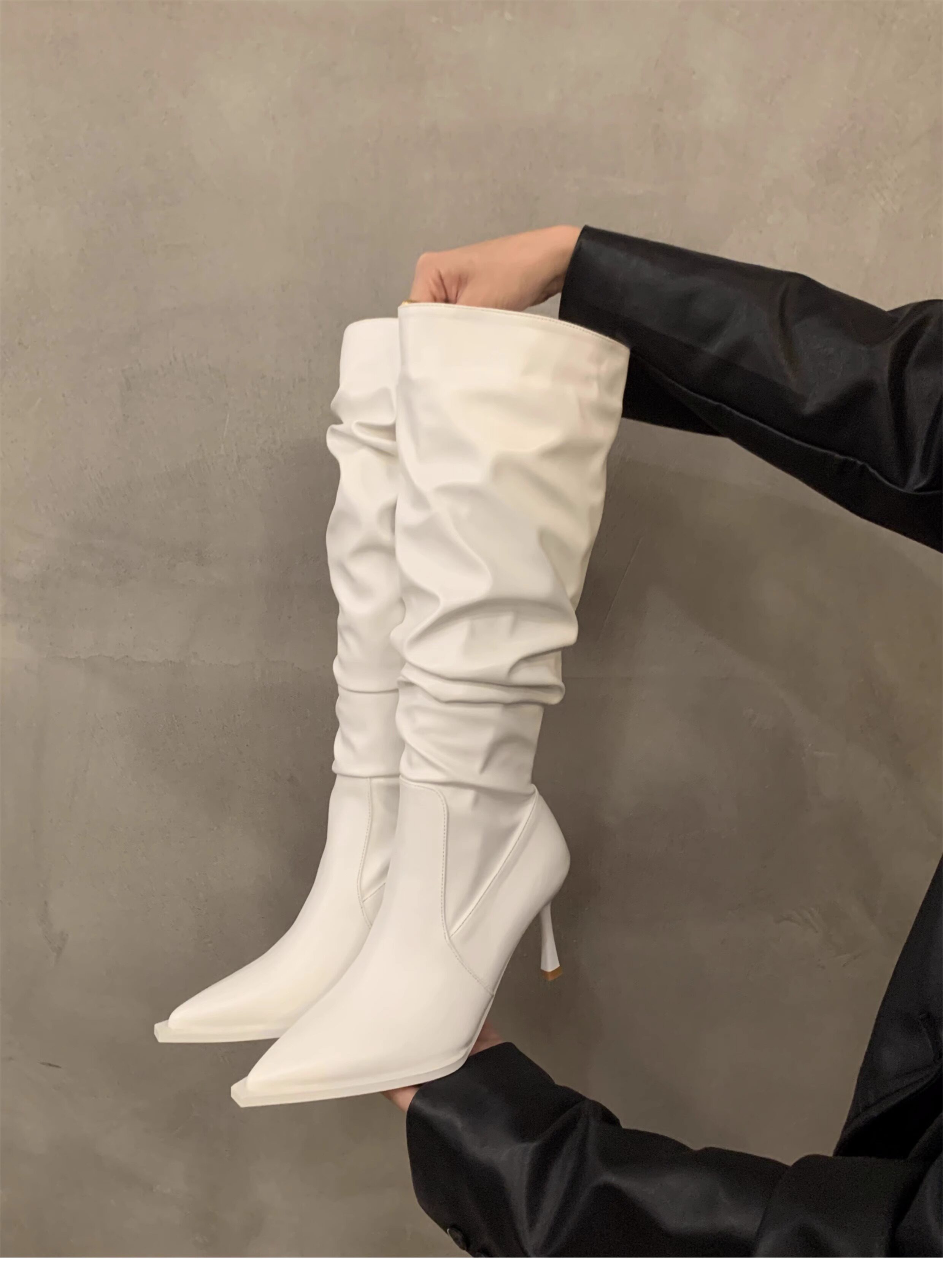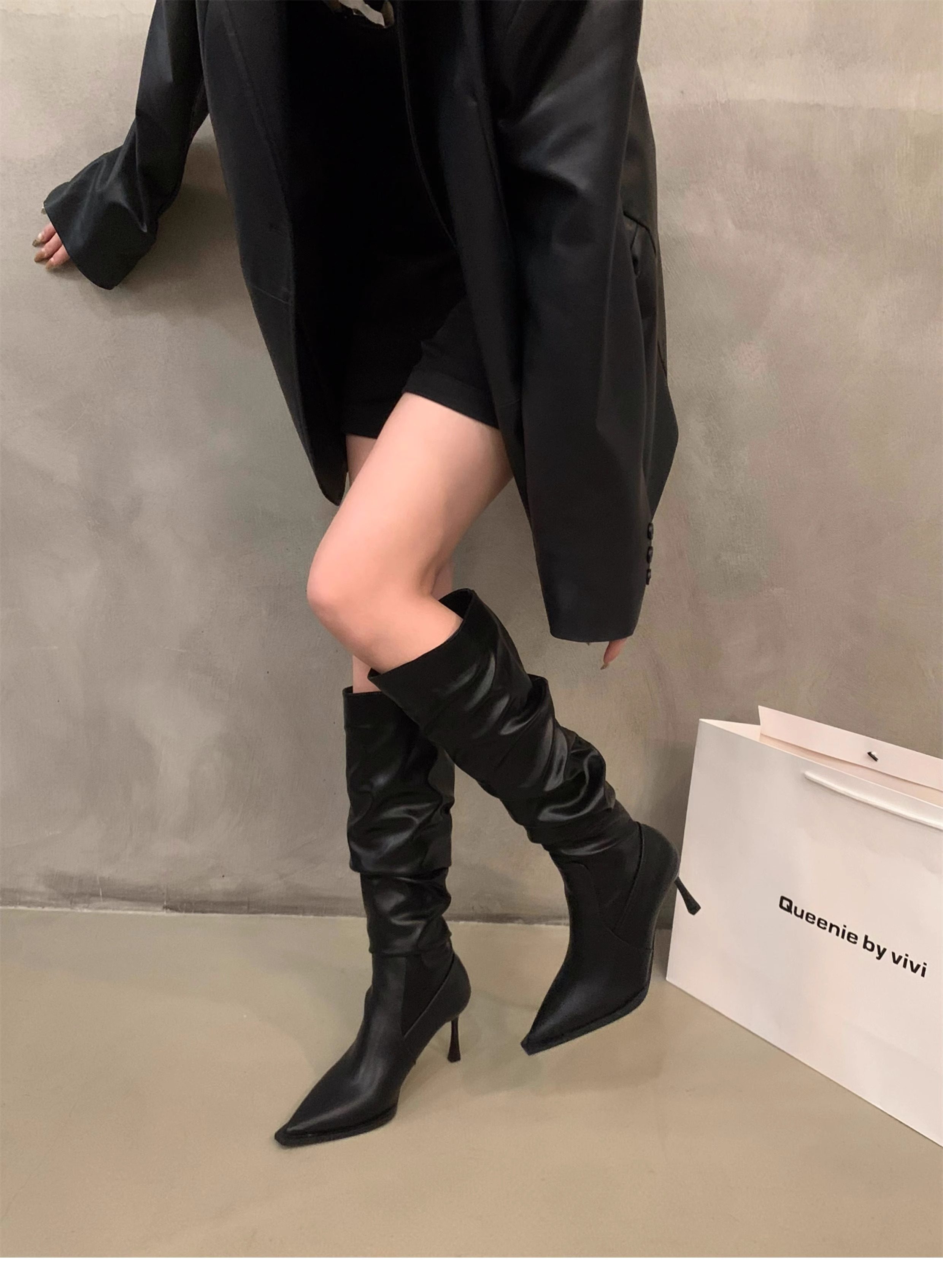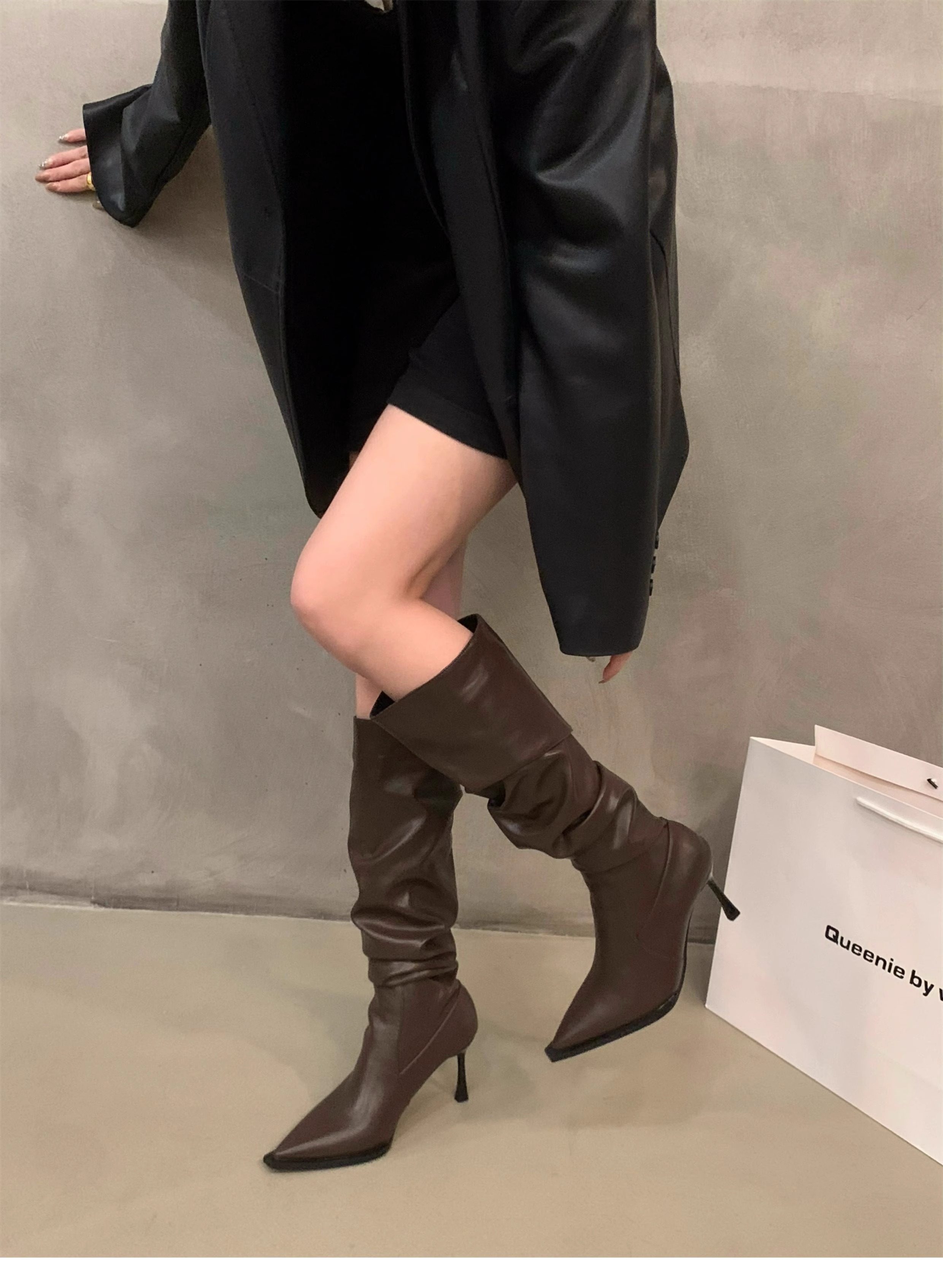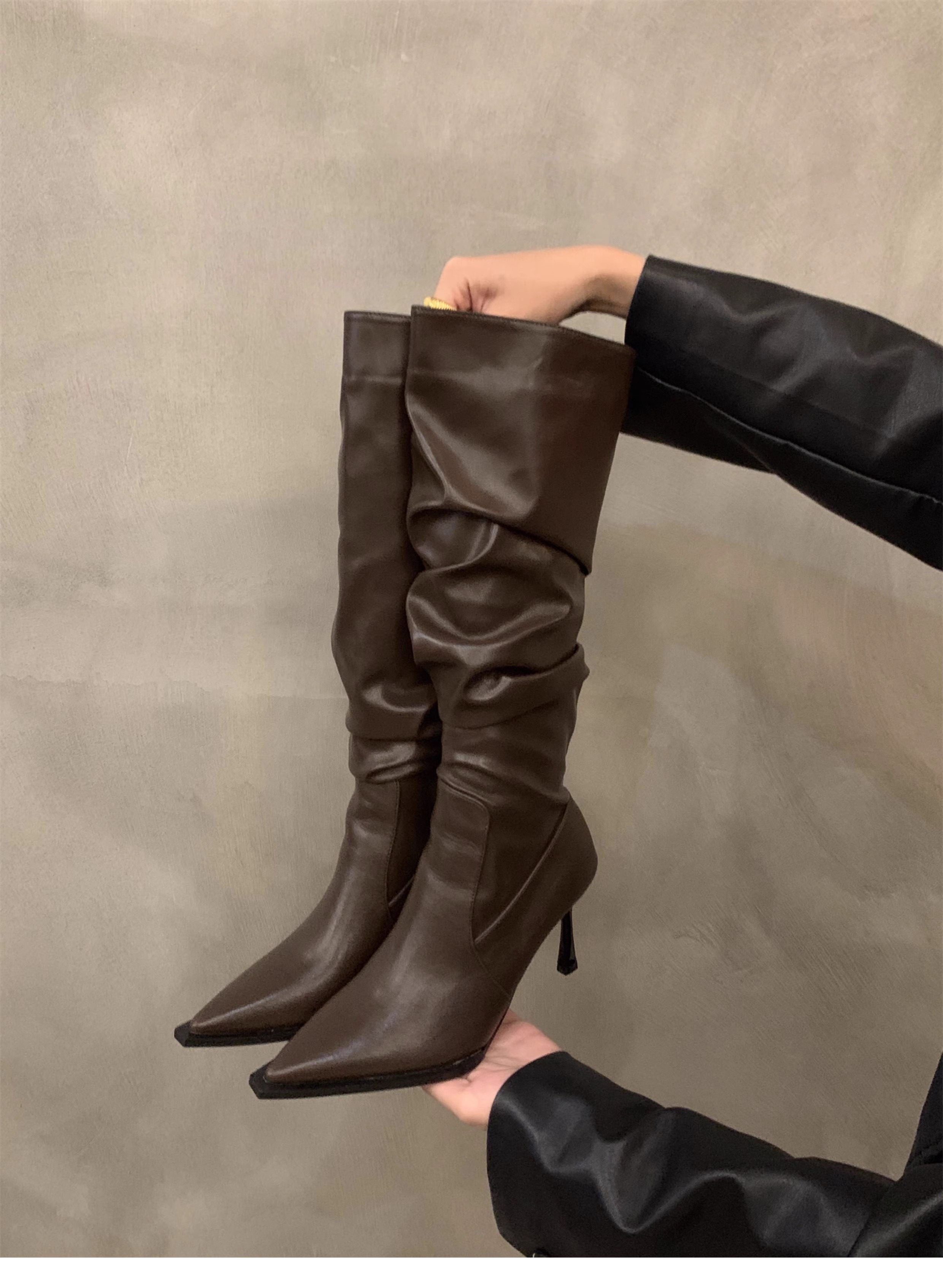 軟皮高跟鞋秋冬女細跟堆堆靴子2025新款小腿顯瘦尖頭長筒靴女