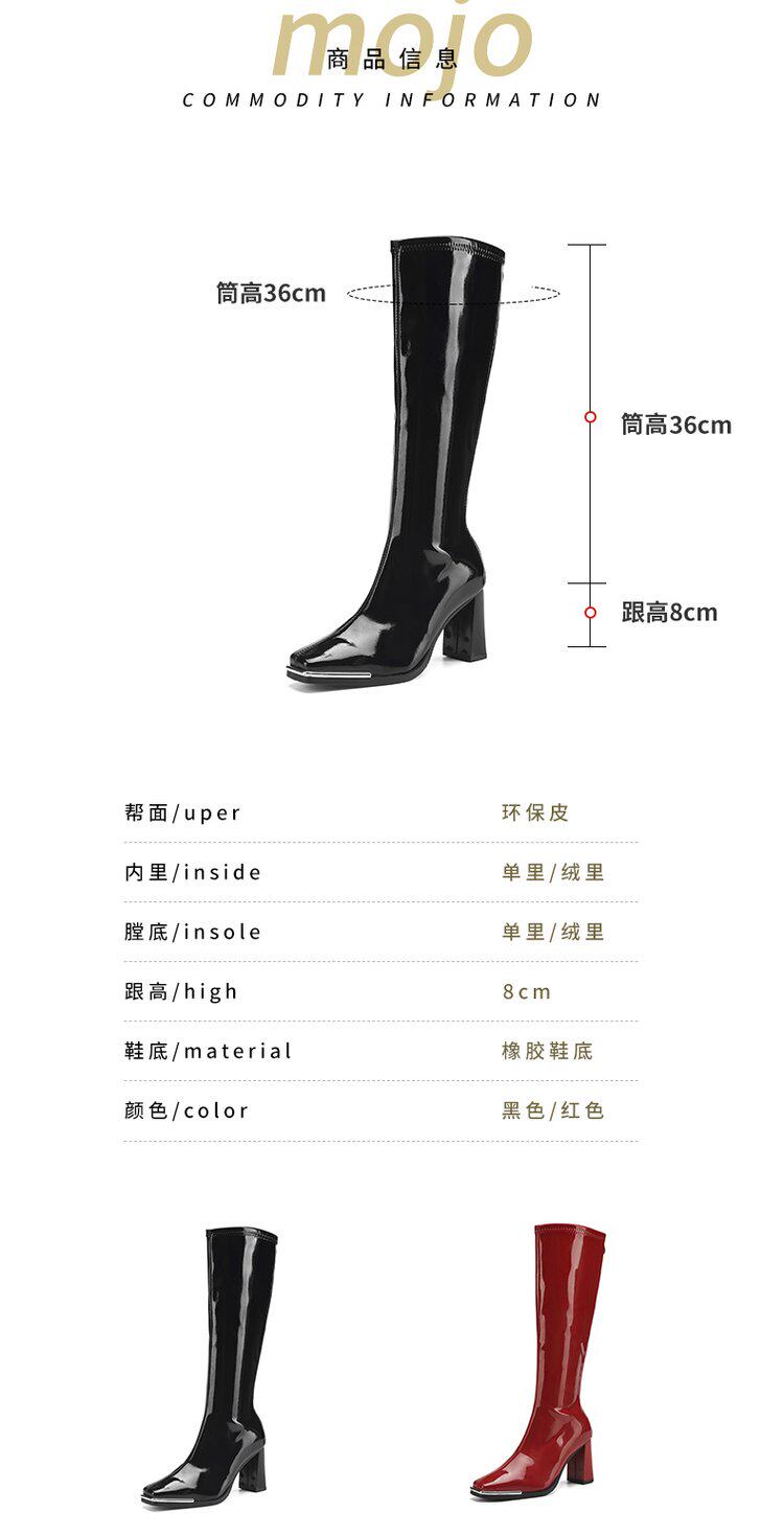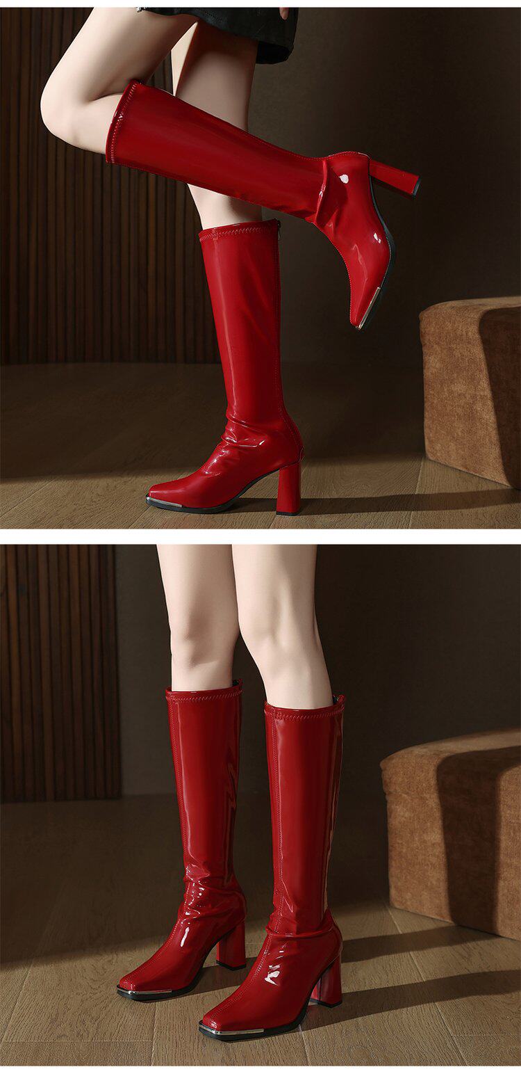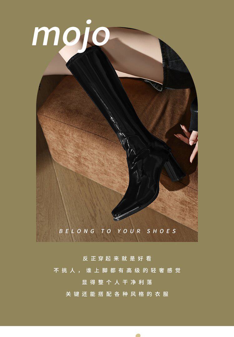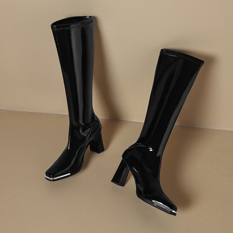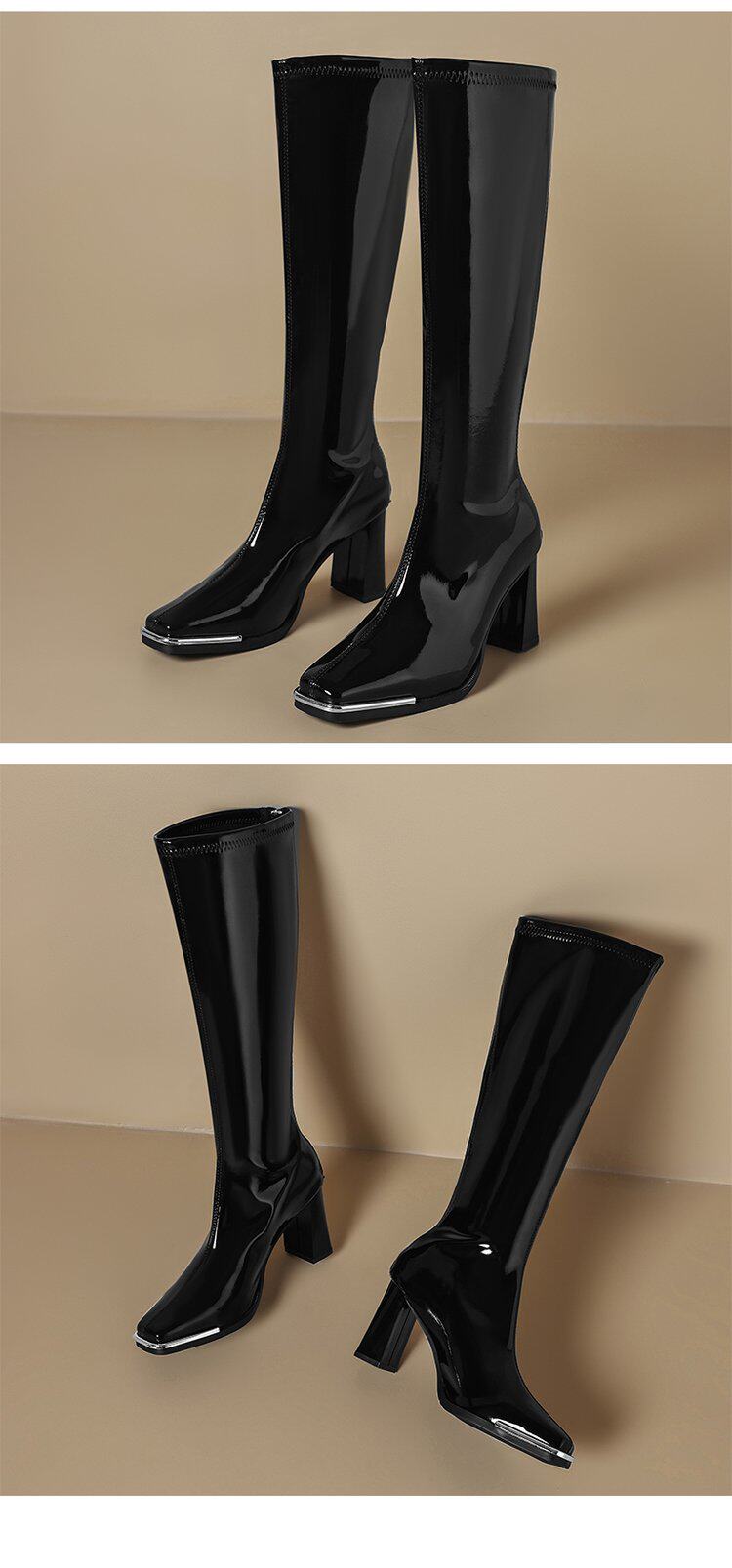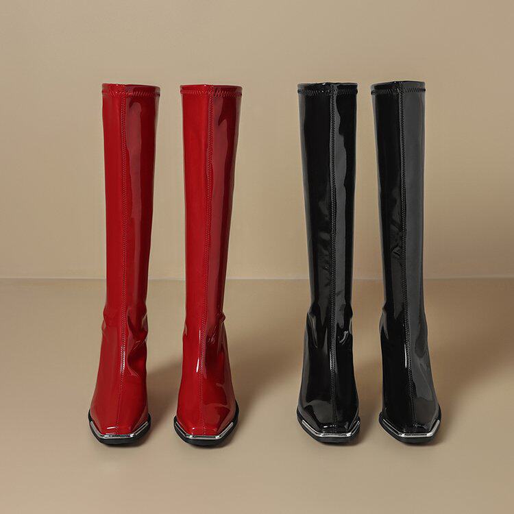 2025秋新款歐美風性感粗跟不過膝長筒靴漆皮方頭大碼高跟騎士靴女