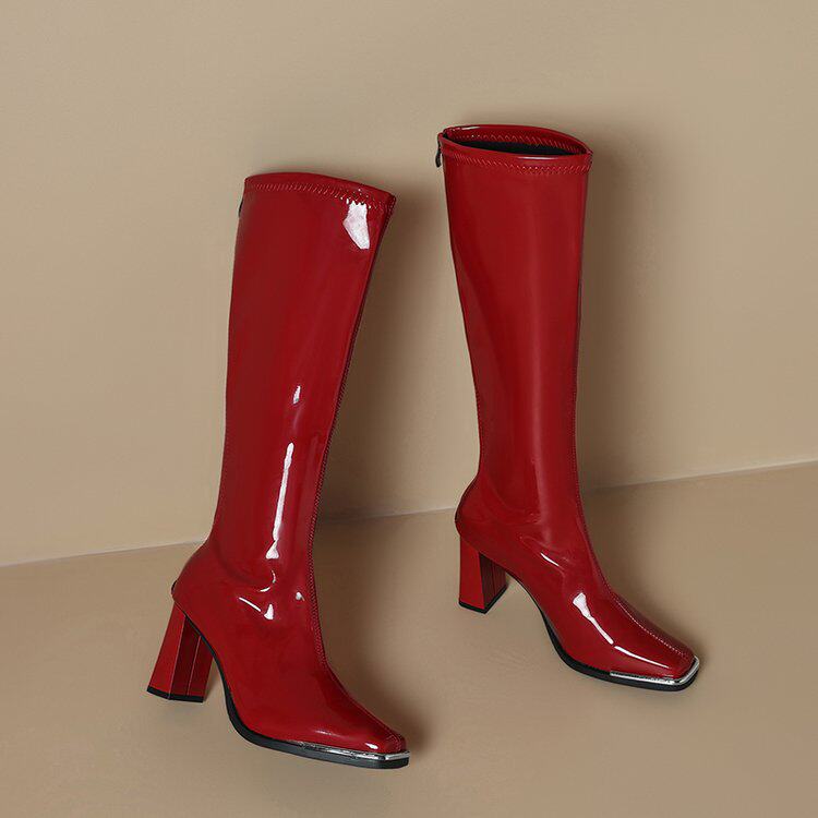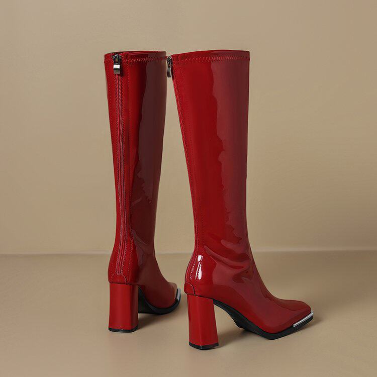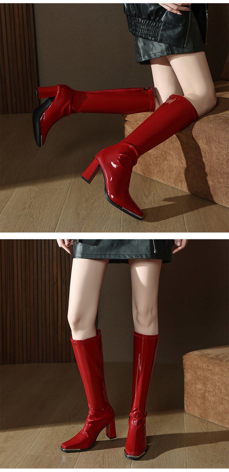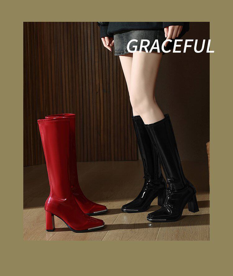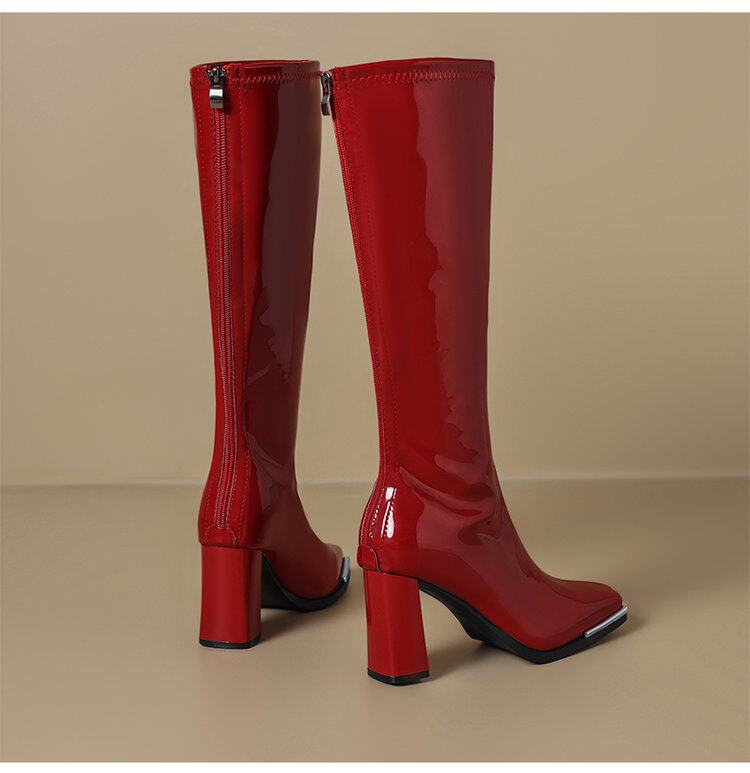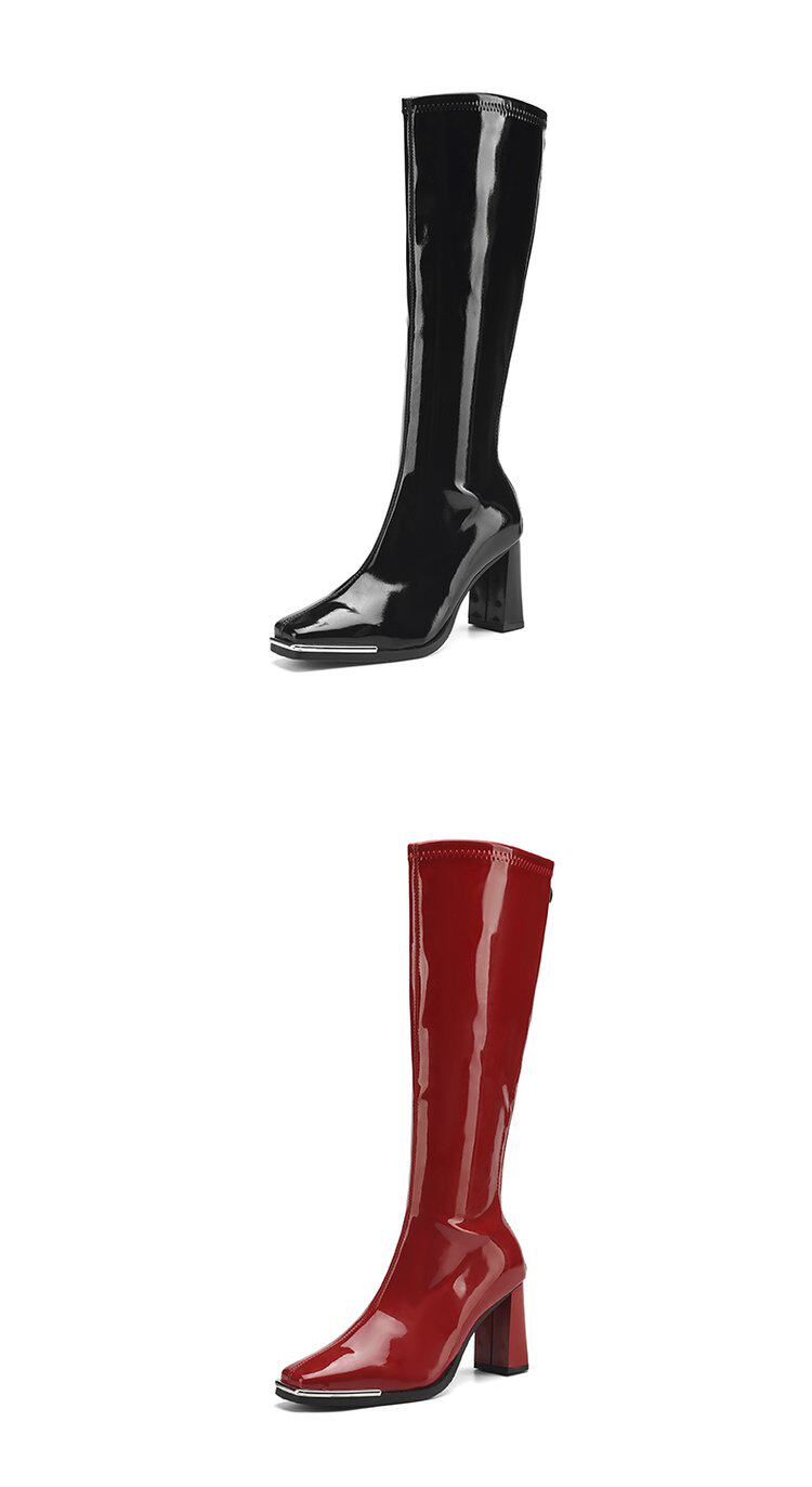 2025秋新款歐美風性感粗跟不過膝長筒靴漆皮方頭大碼高跟騎士靴女