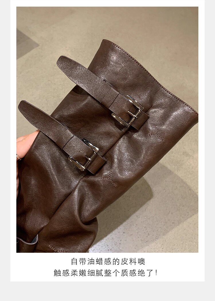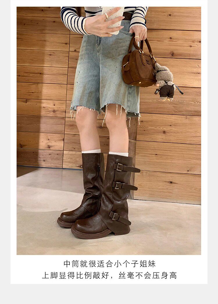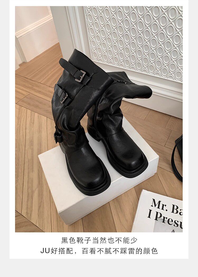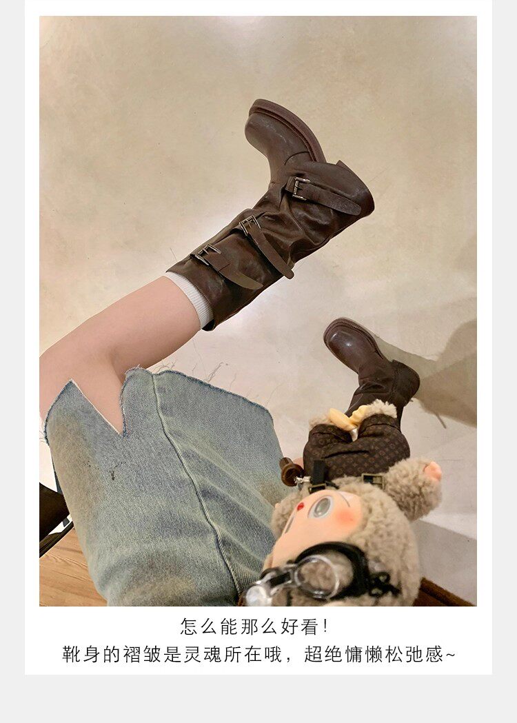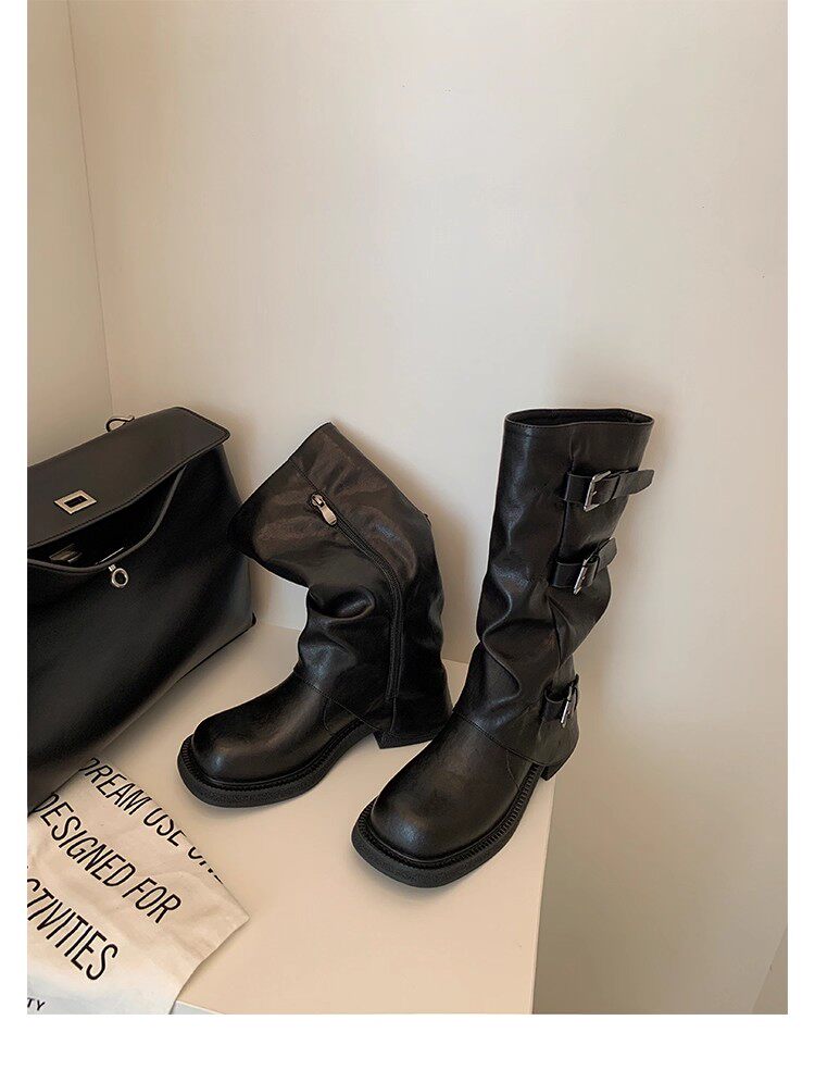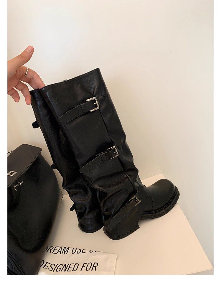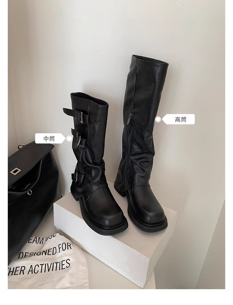 褲琯靴女粗腿胖mm大筒圍長筒靴皮帶釦褶皺中筒堆堆騎士靴大碼長靴
