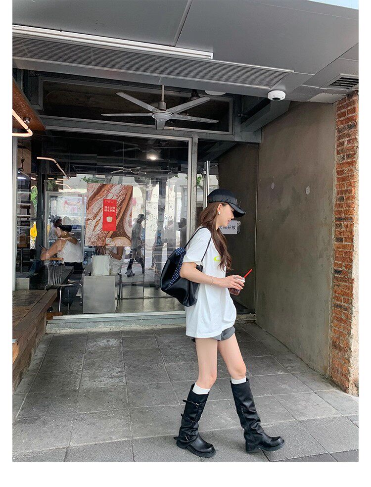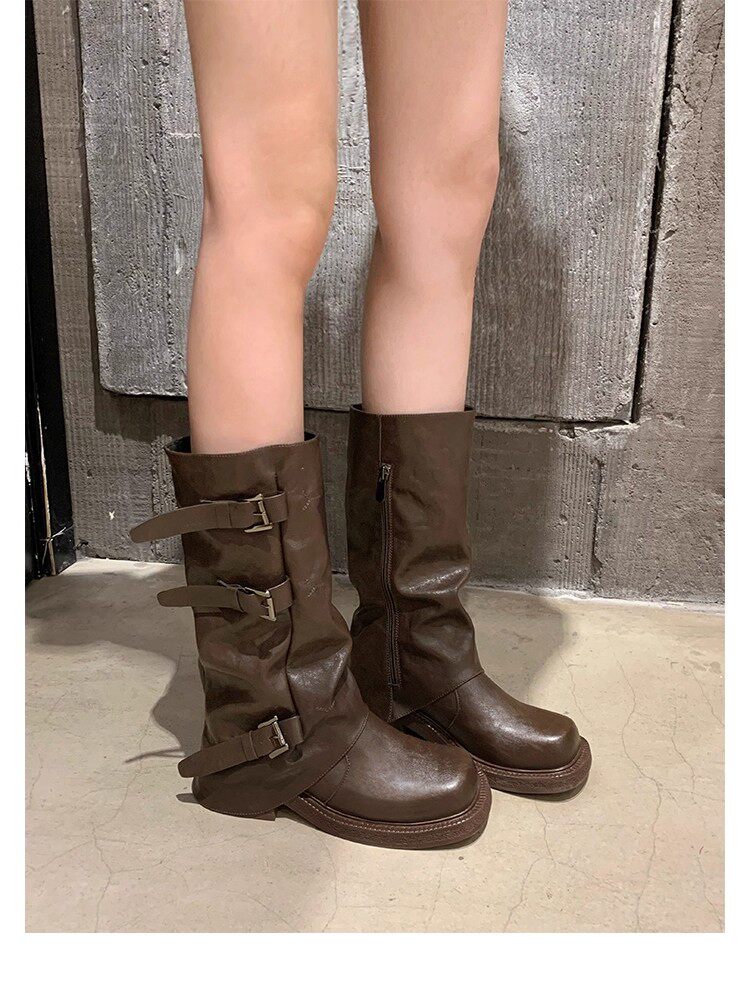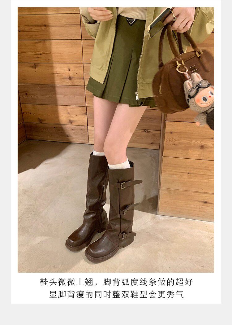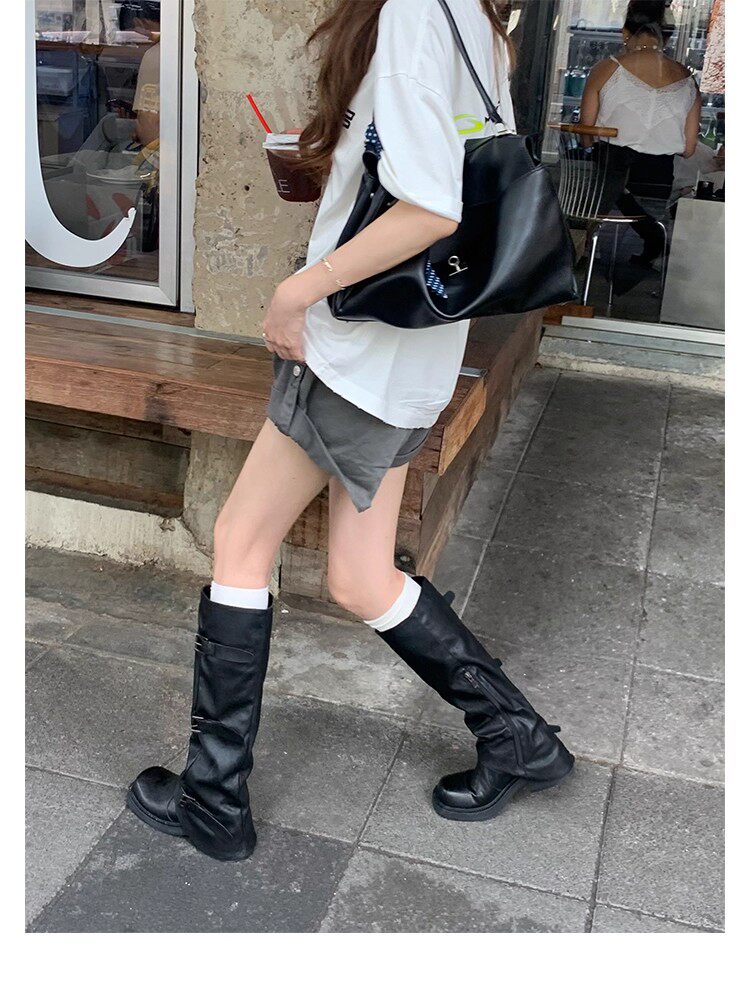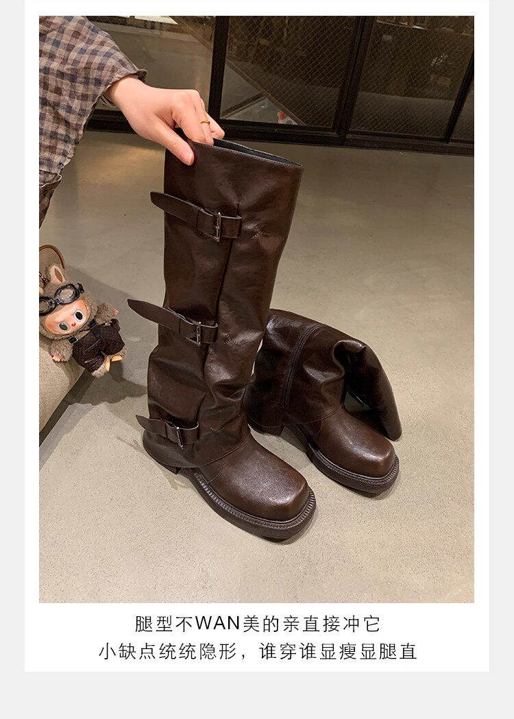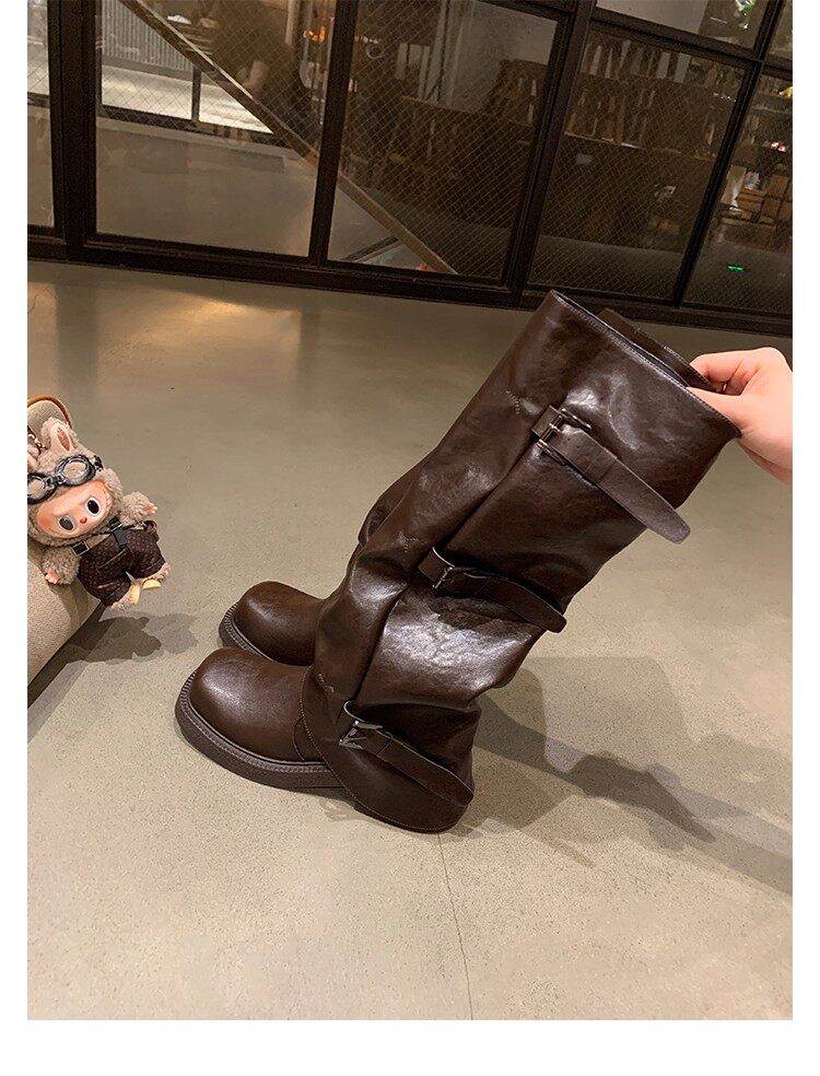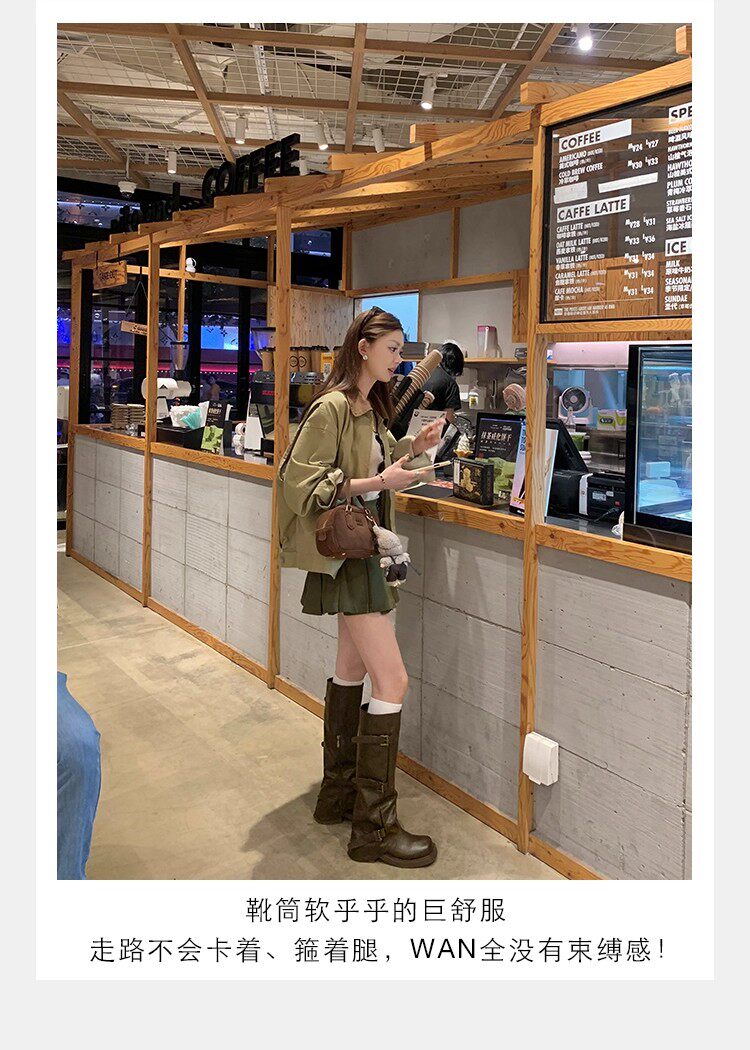 褲琯靴女粗腿胖mm大筒圍長筒靴皮帶釦褶皺中筒堆堆騎士靴大碼長靴
