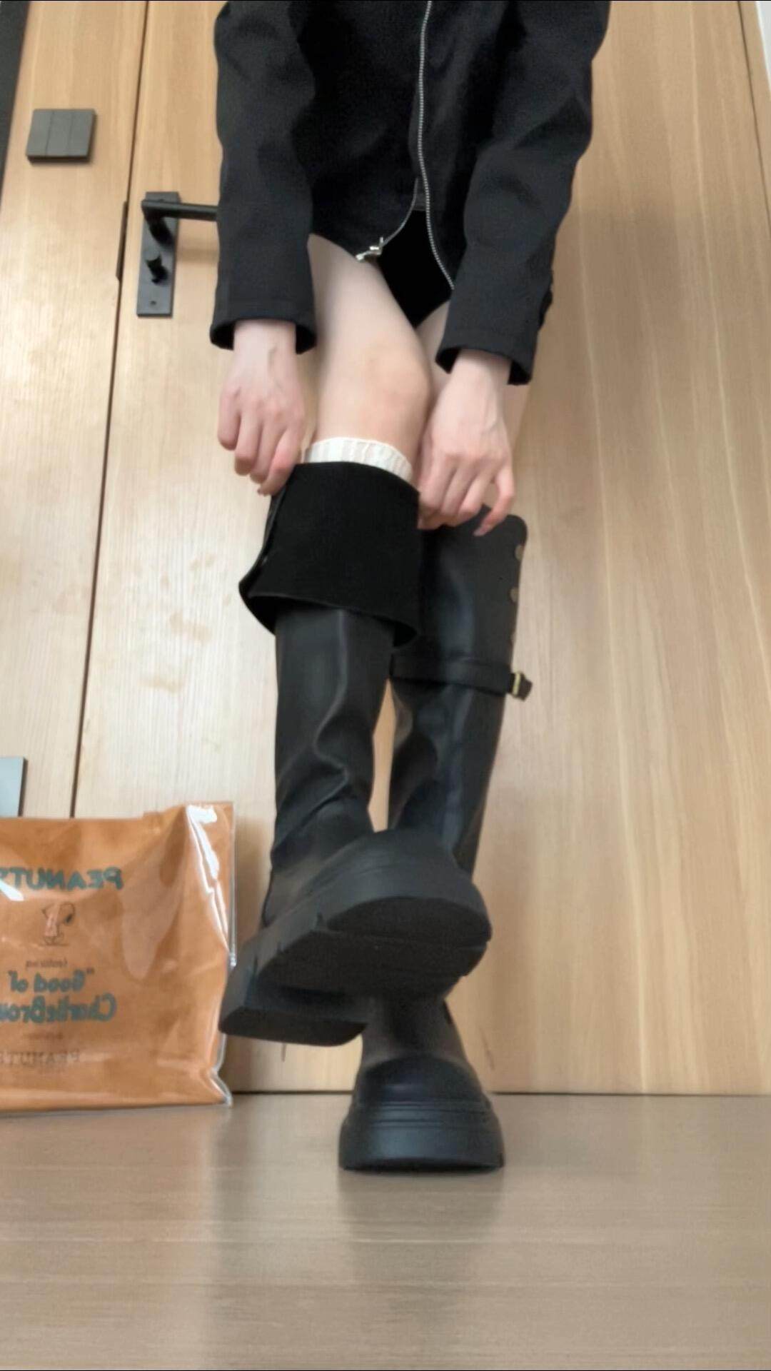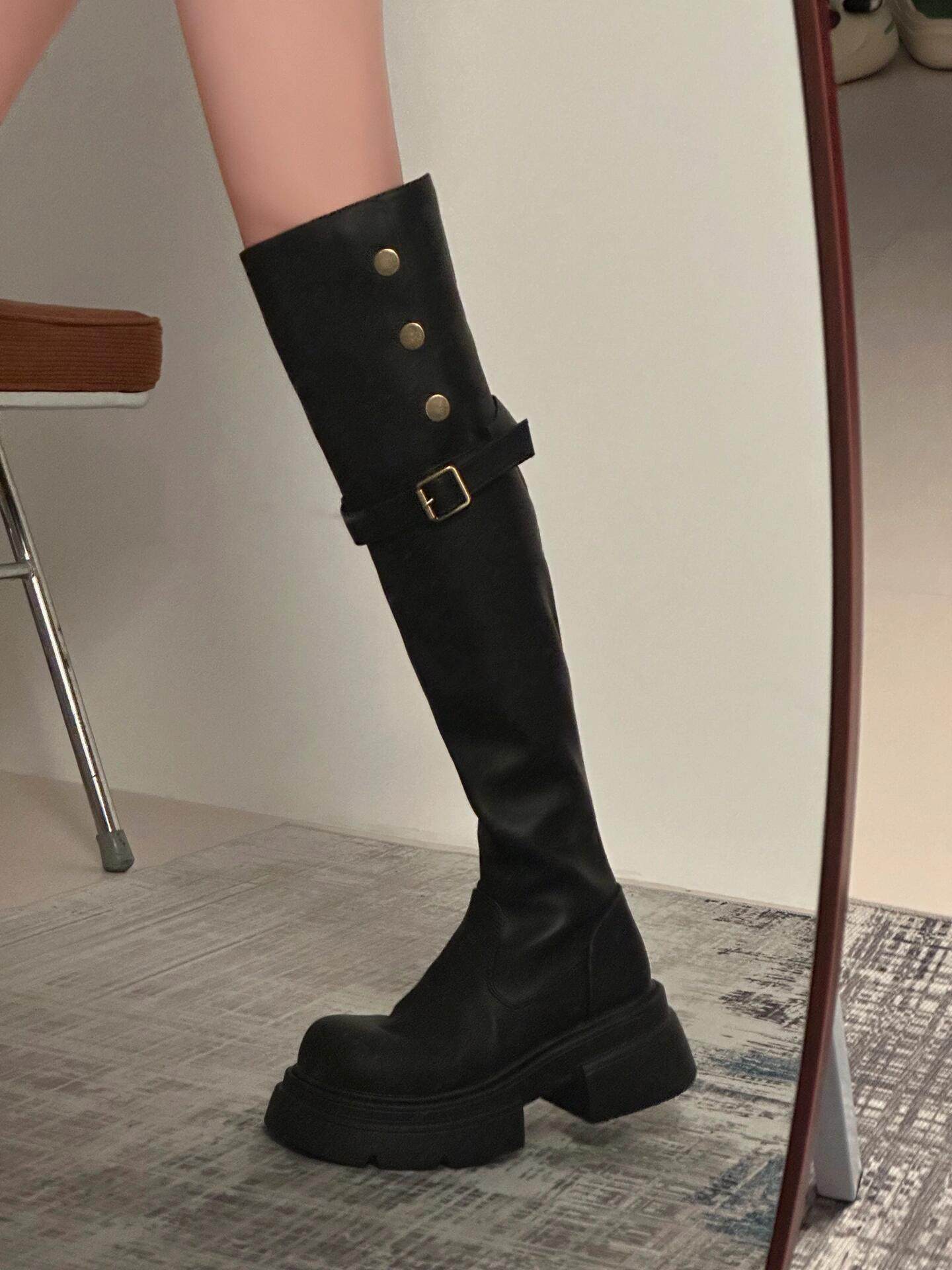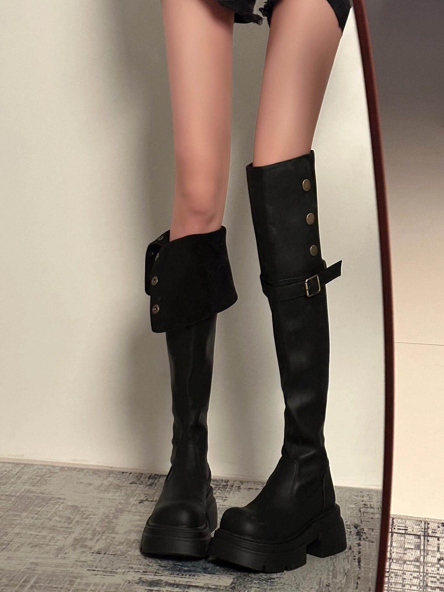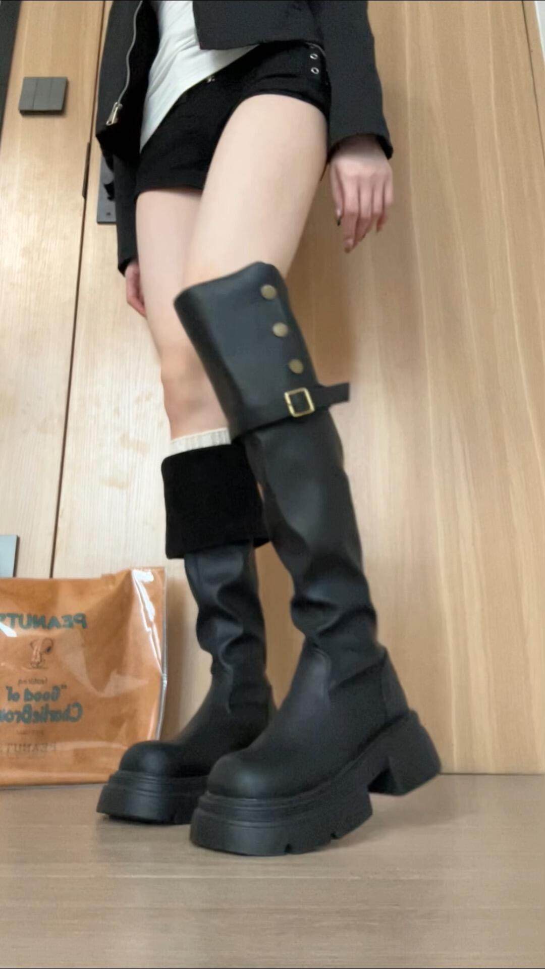 黑色兩穿厚底過膝長筒靴女2026春季新款粗跟增高靴子顯瘦騎士靴