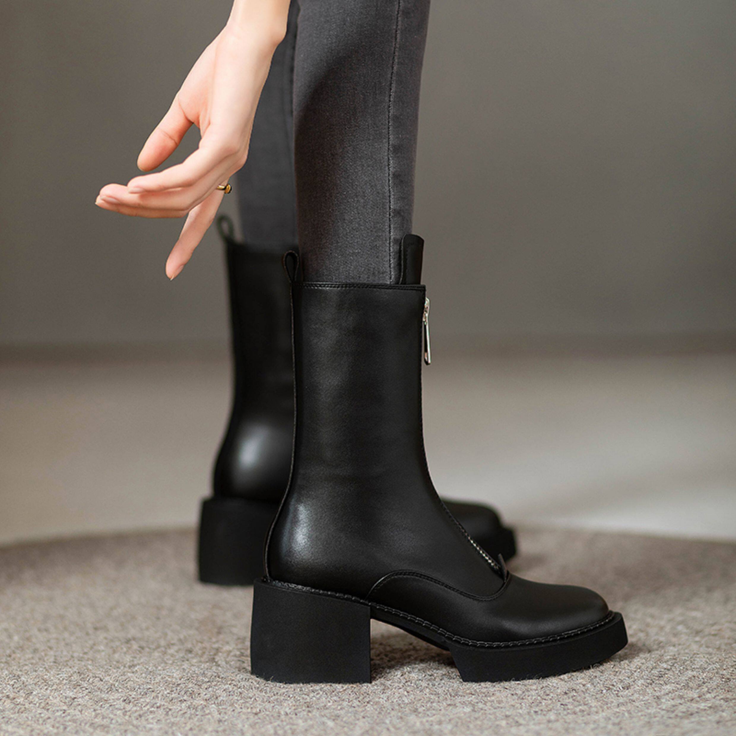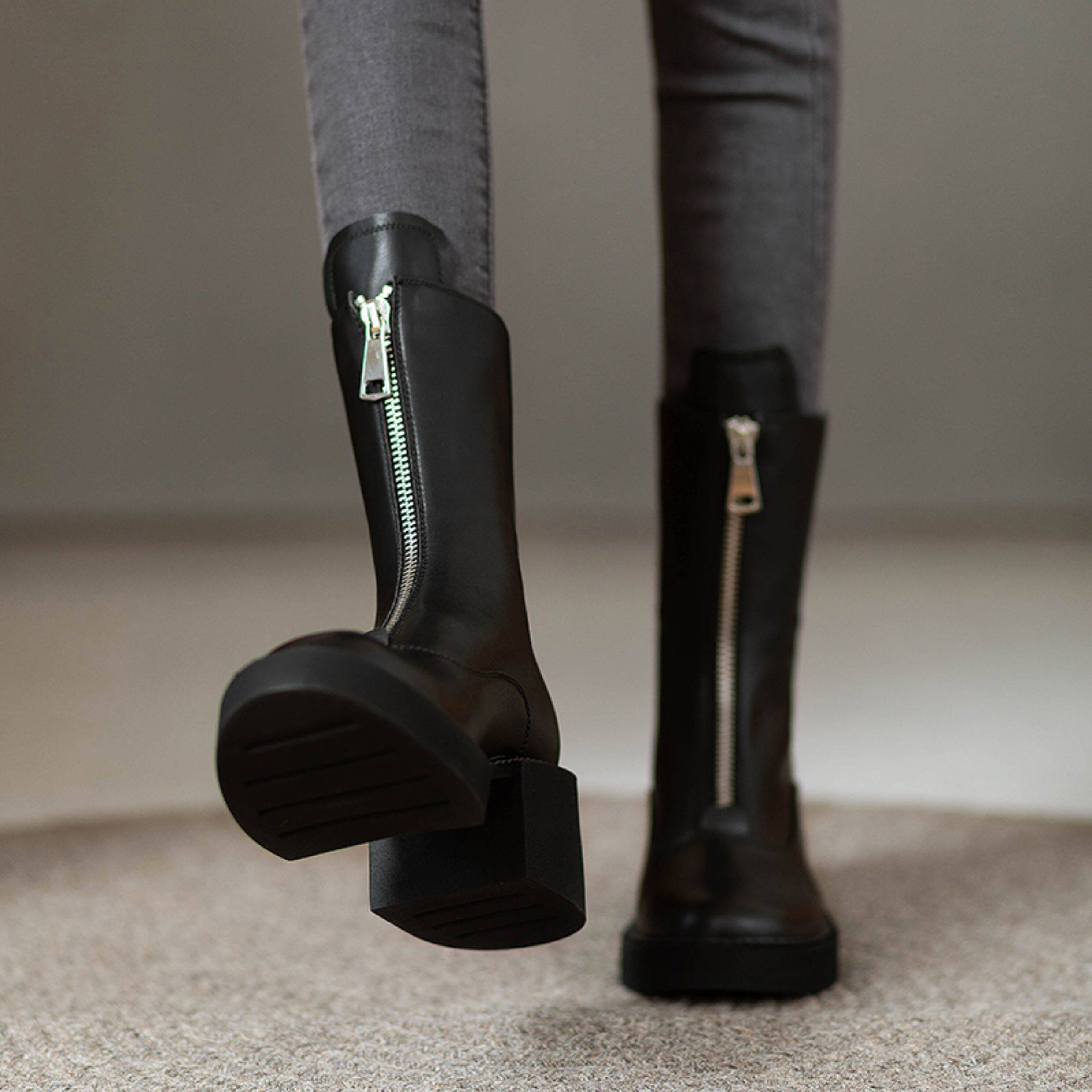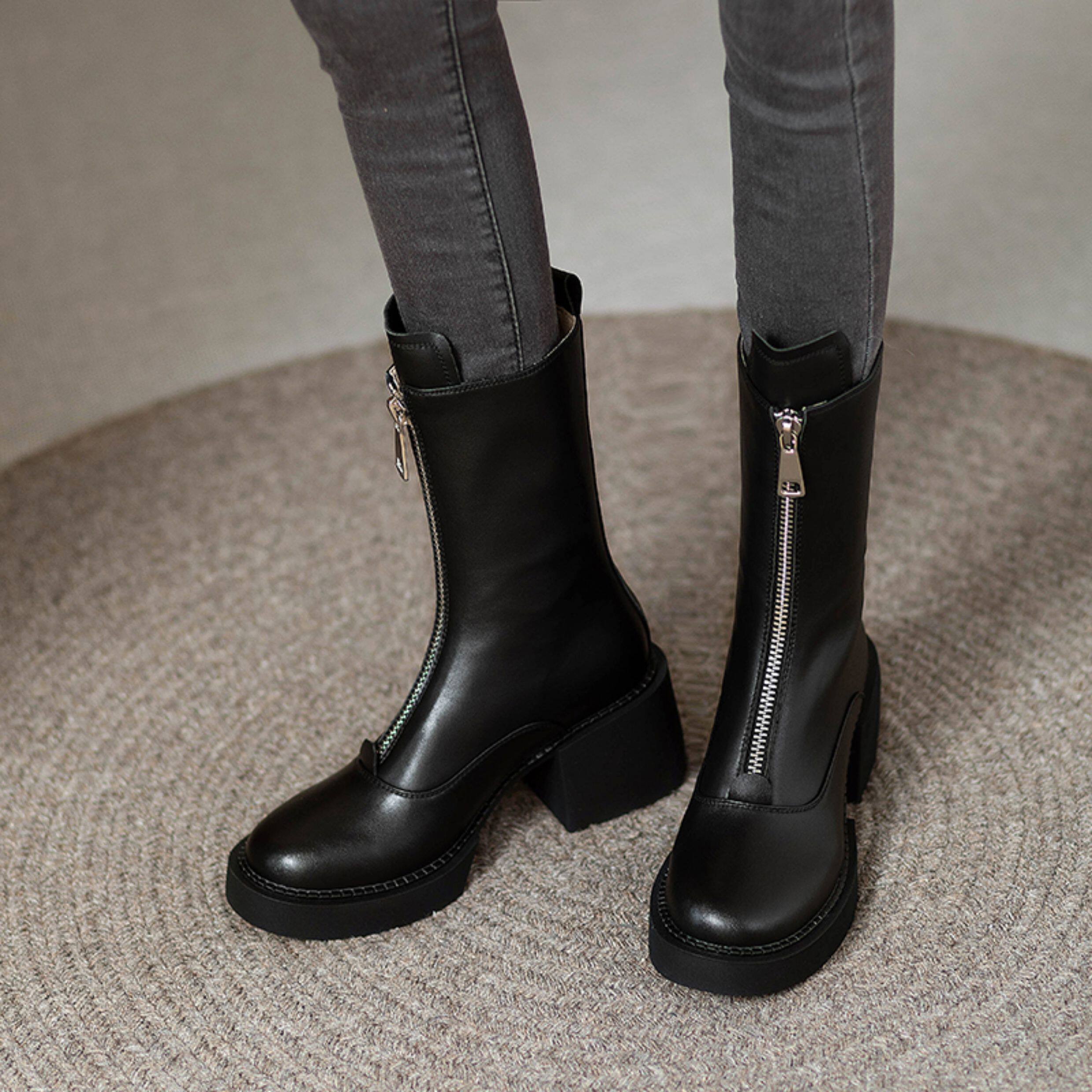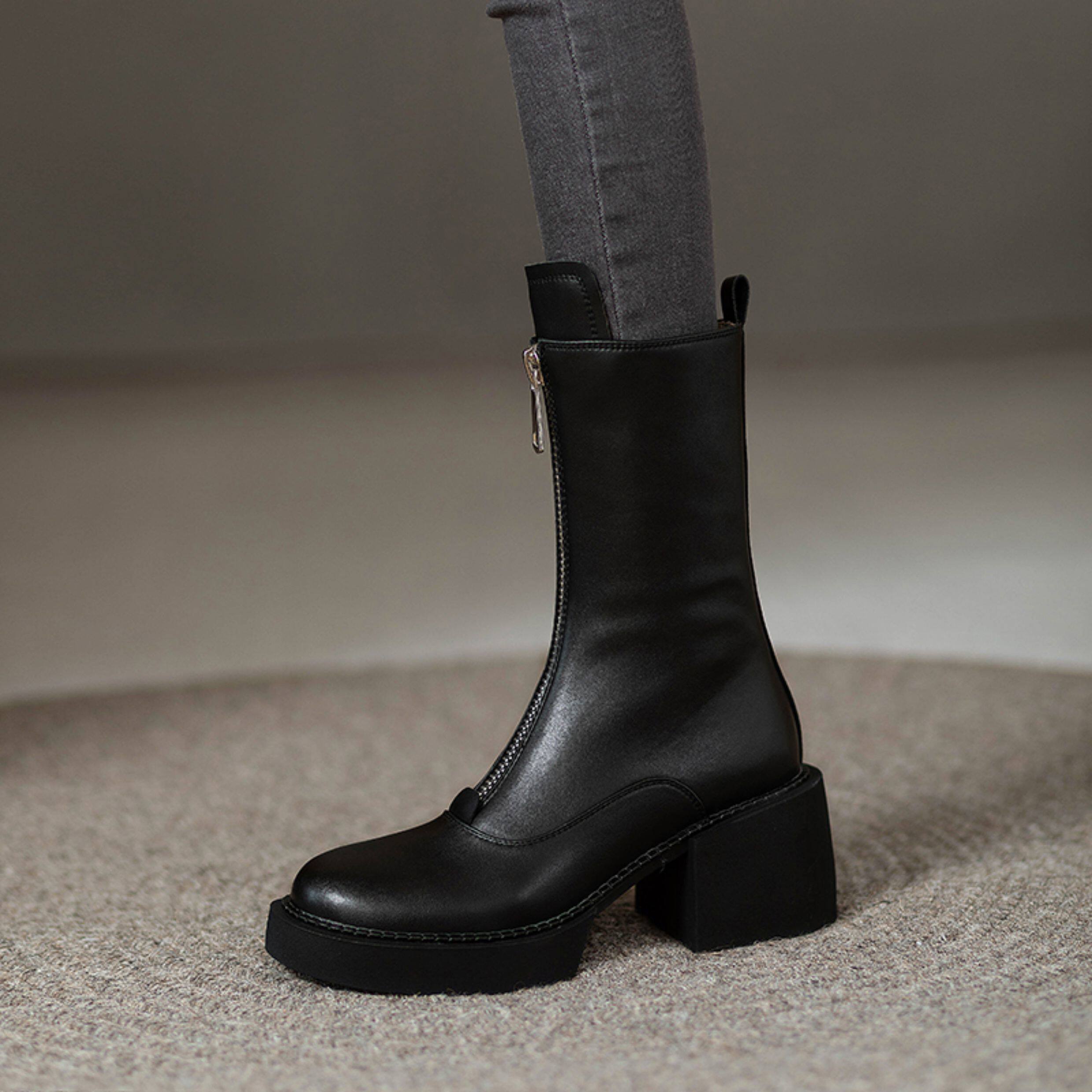 2025秋冬單靴真皮小個子前拉鍊中筒馬丁靴厚底靴子女瘦瘦高跟短靴