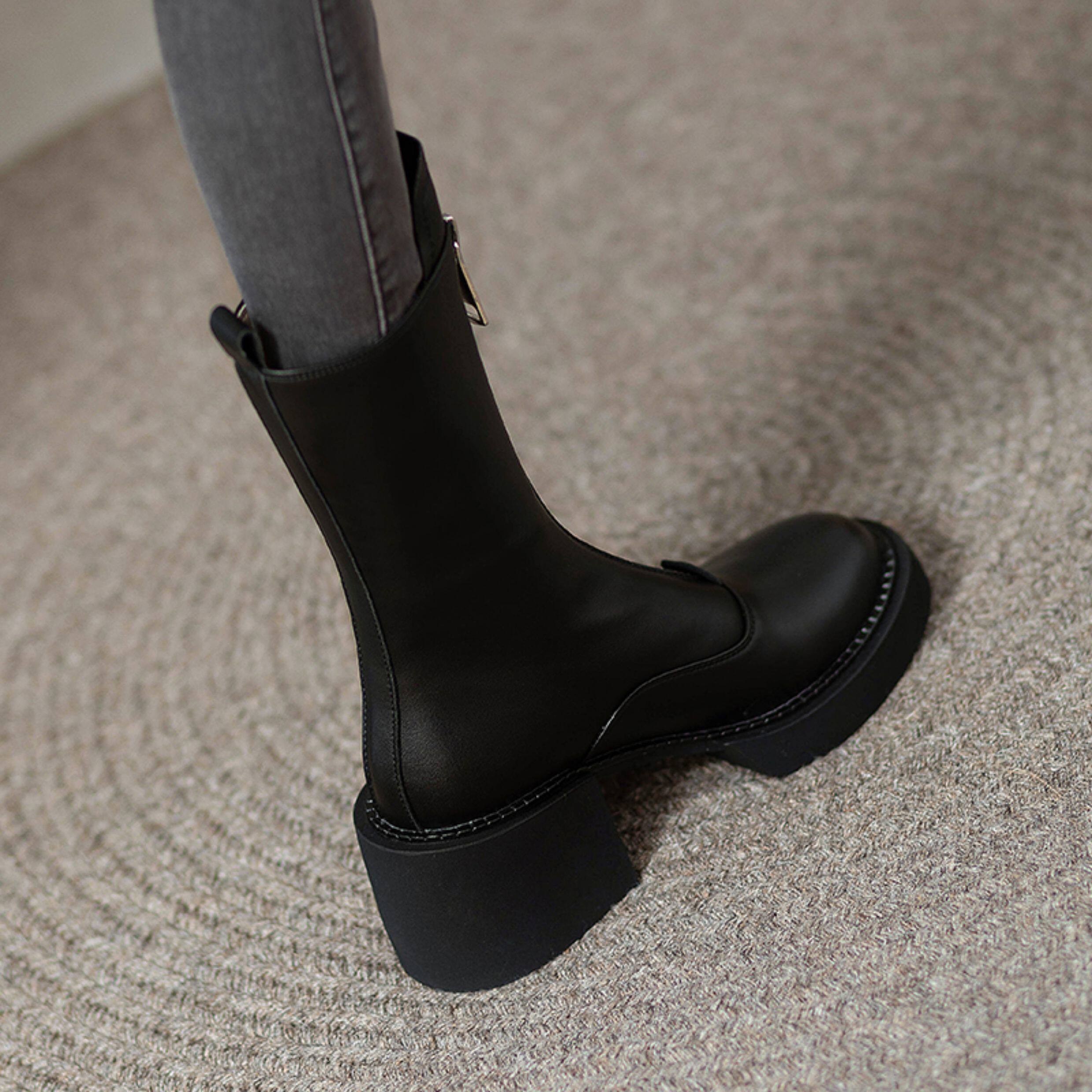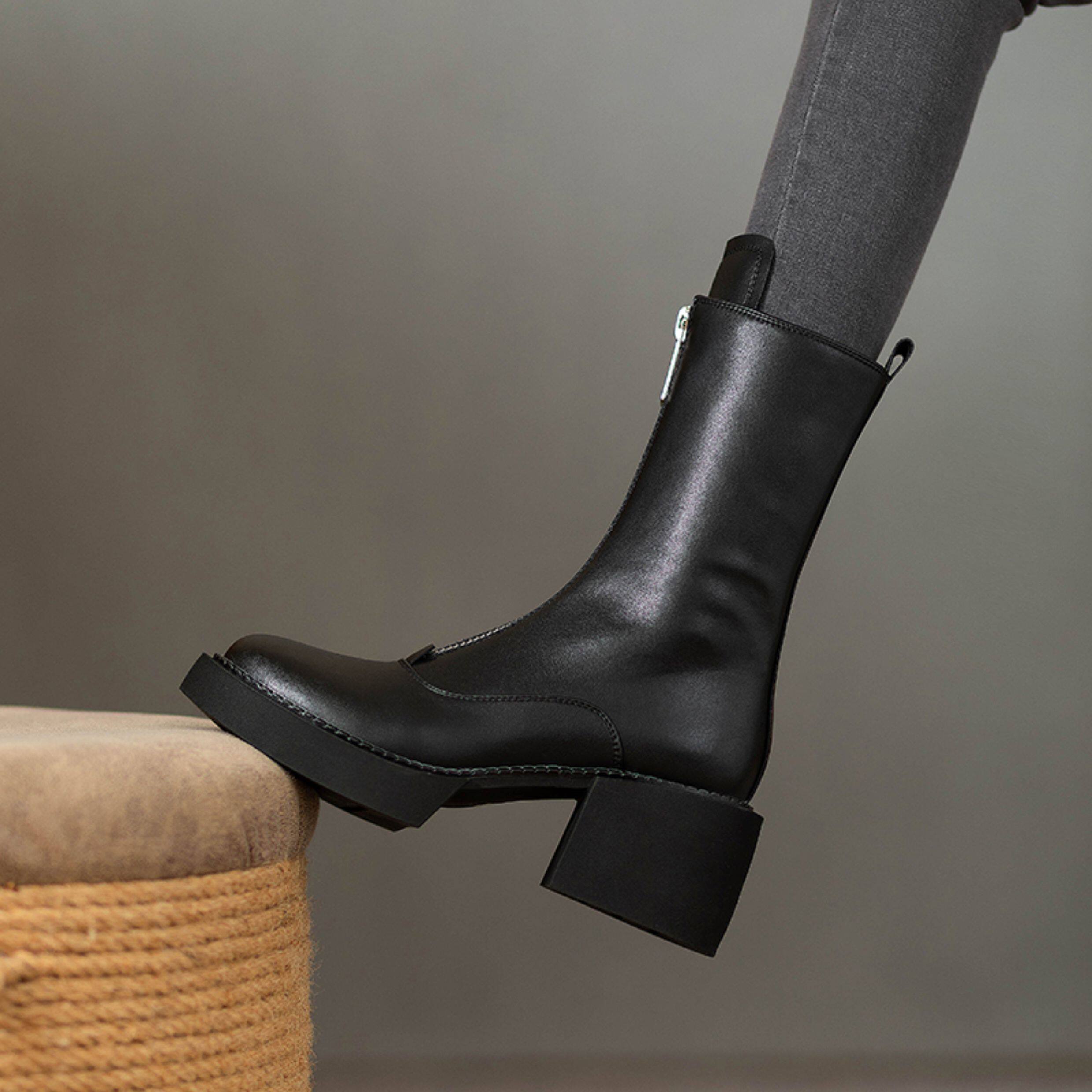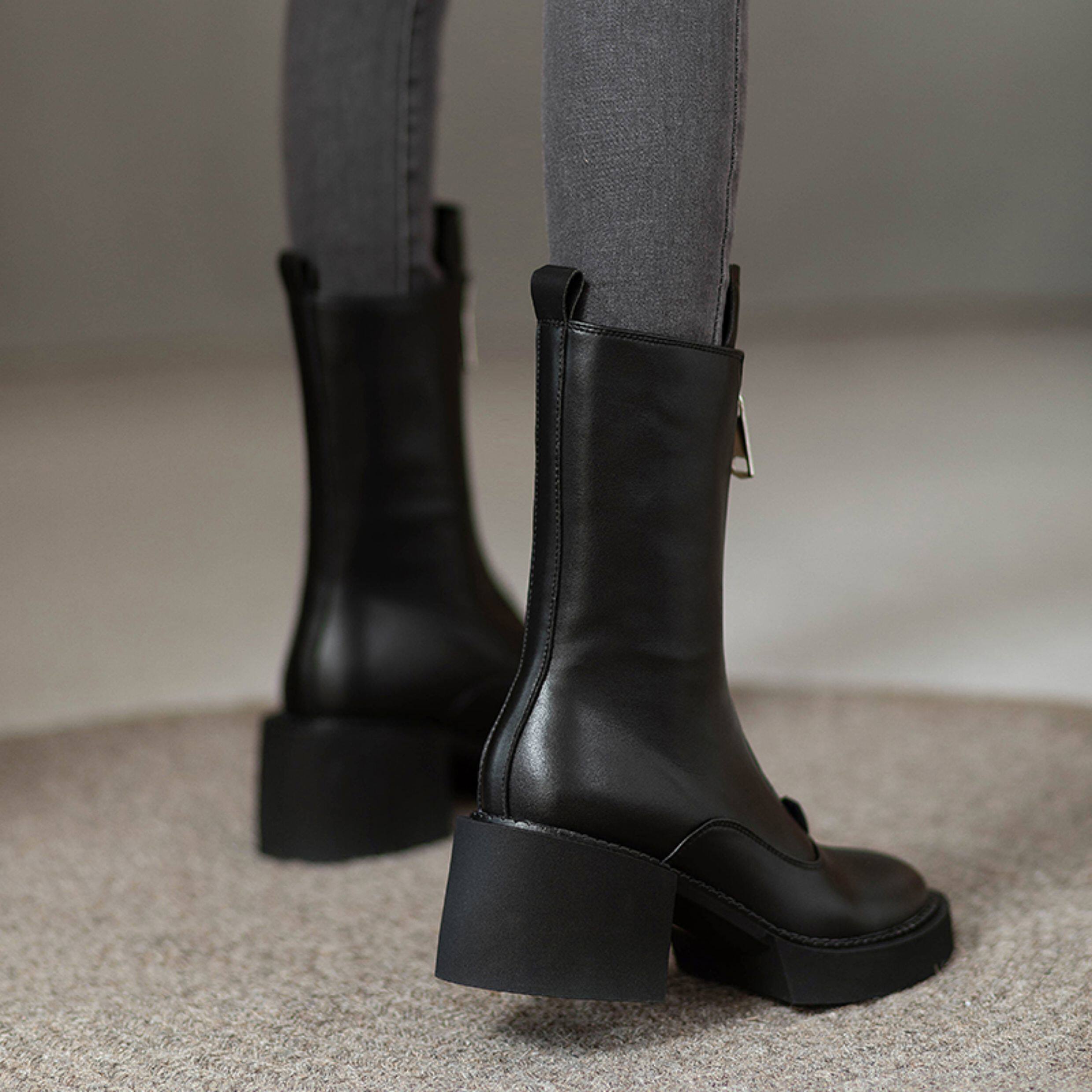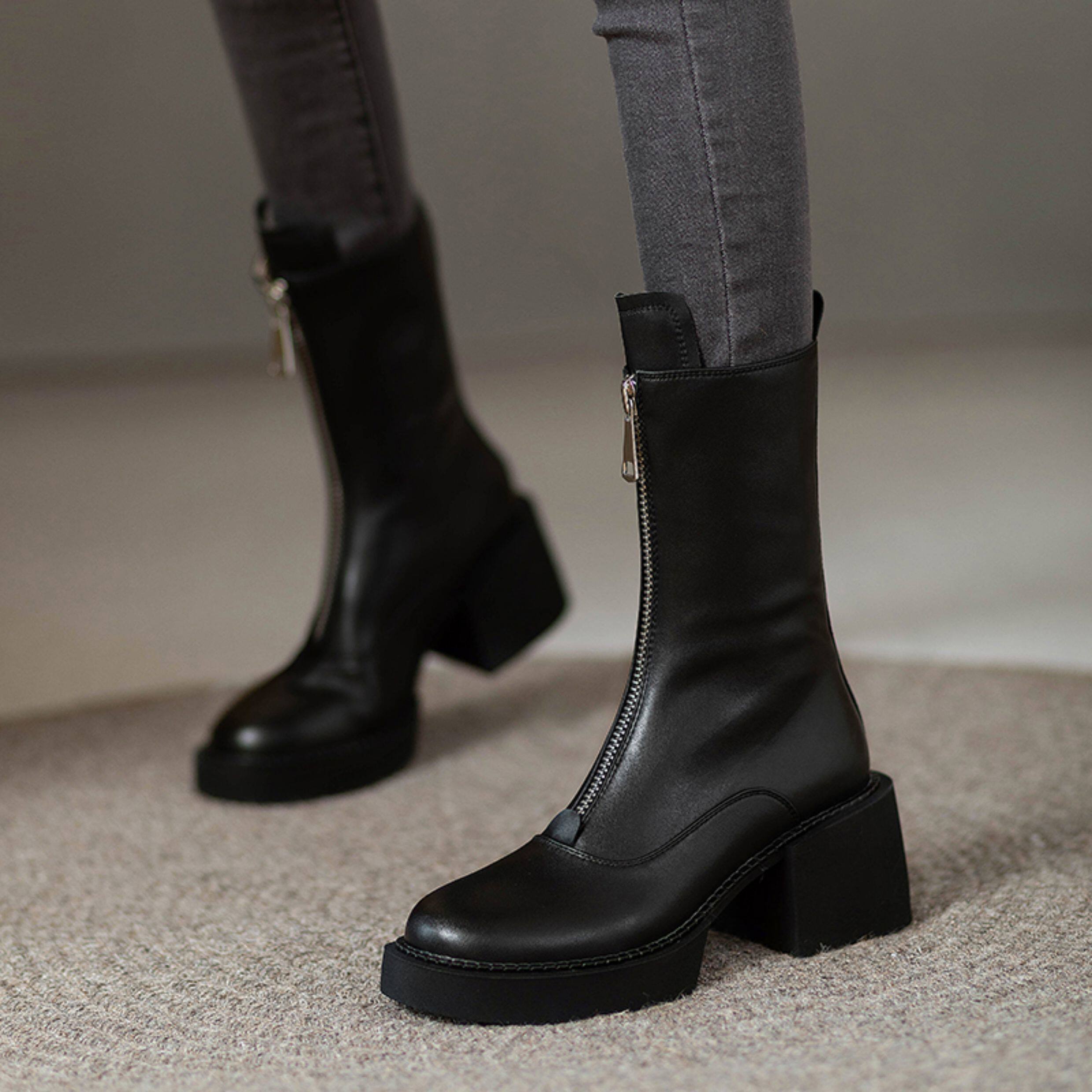 2025秋冬單靴真皮小個子前拉鍊中筒馬丁靴厚底靴子女瘦瘦高跟短靴