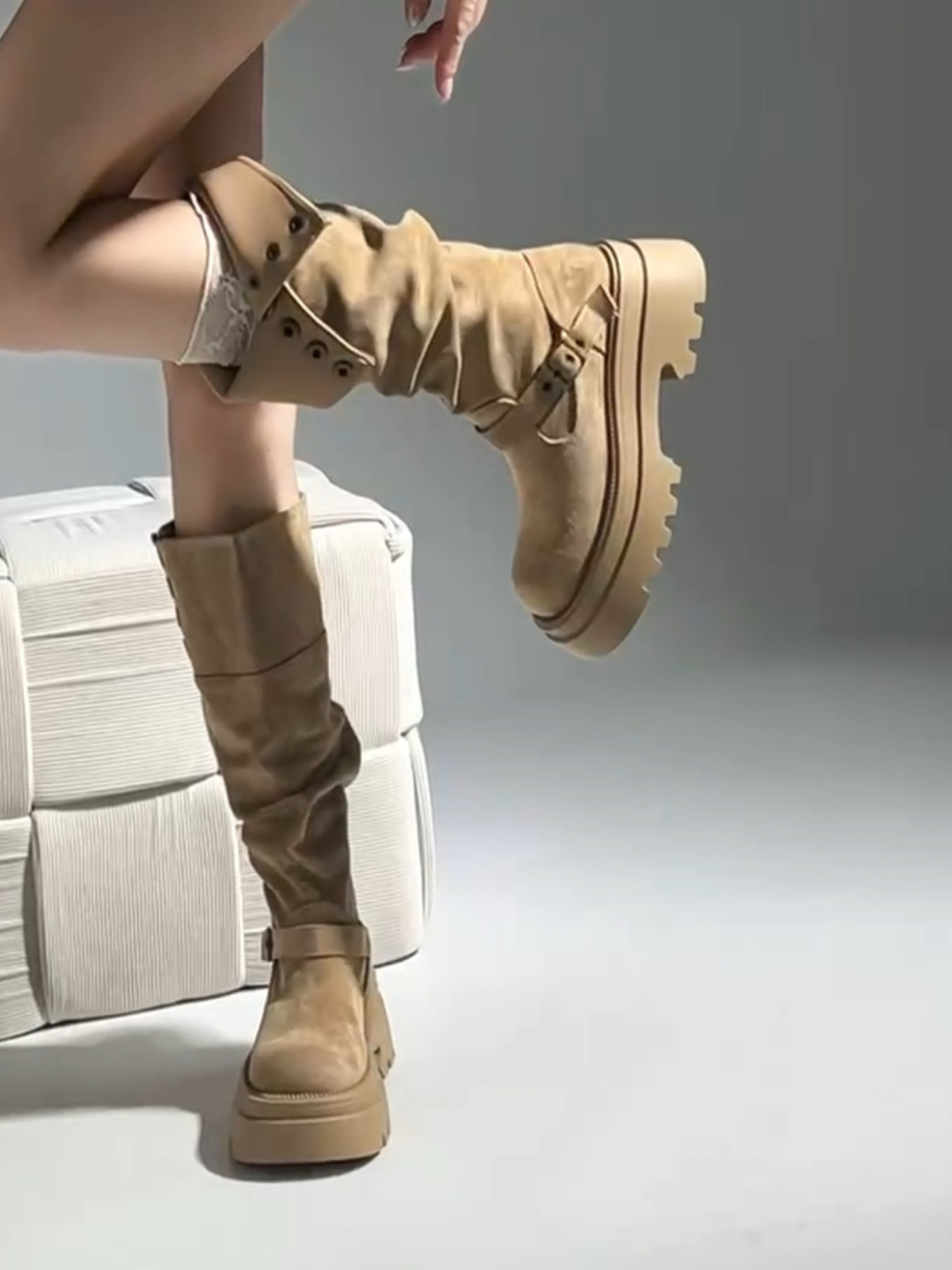牛皮版~美拉德兩穿厚底長靴女高筒騎士靴皮帶釦顯瘦小個子堆堆靴