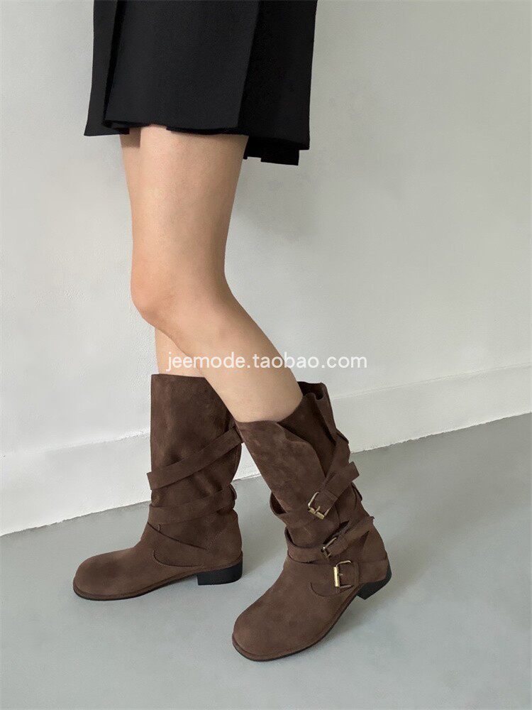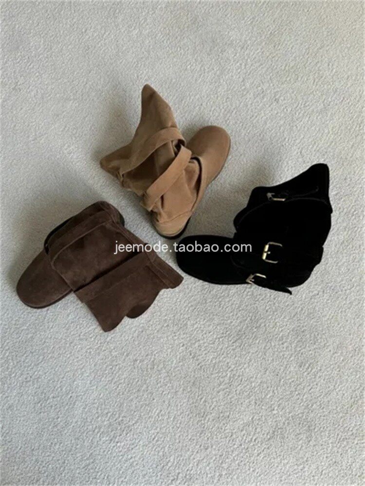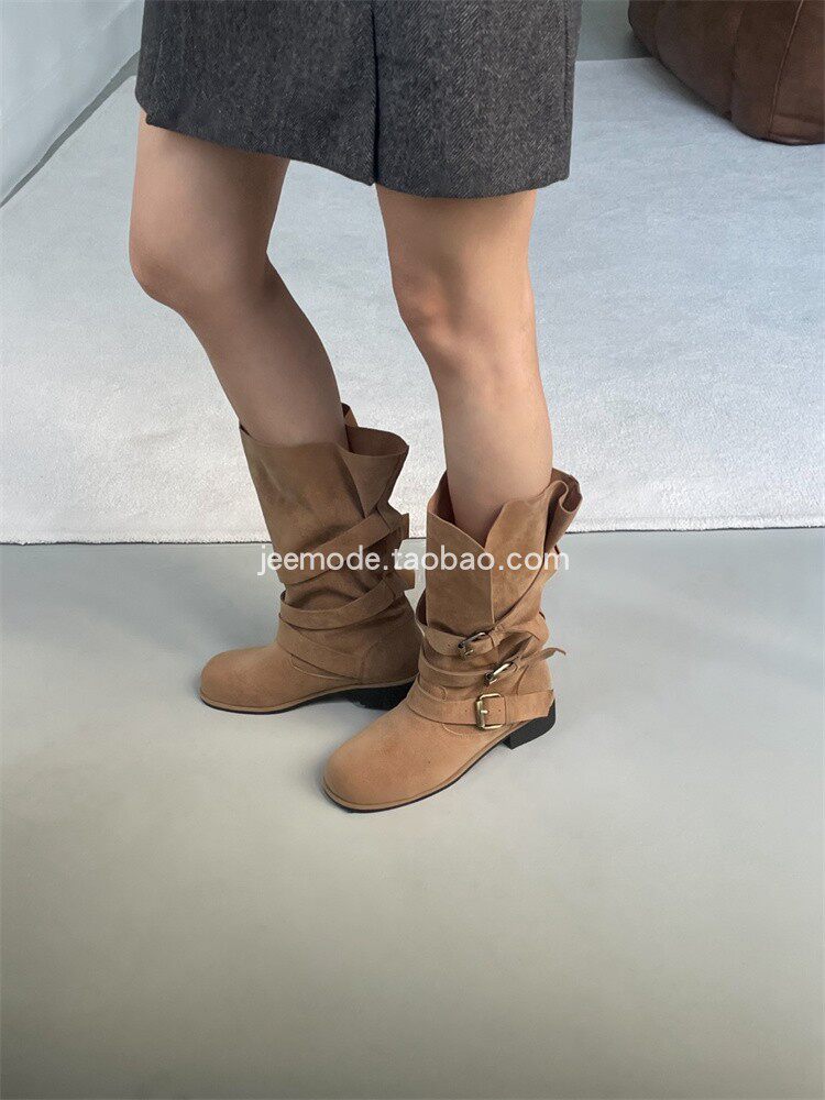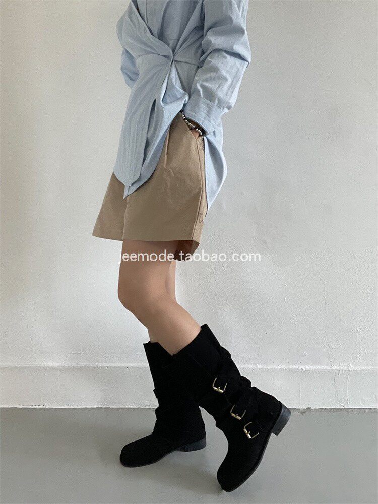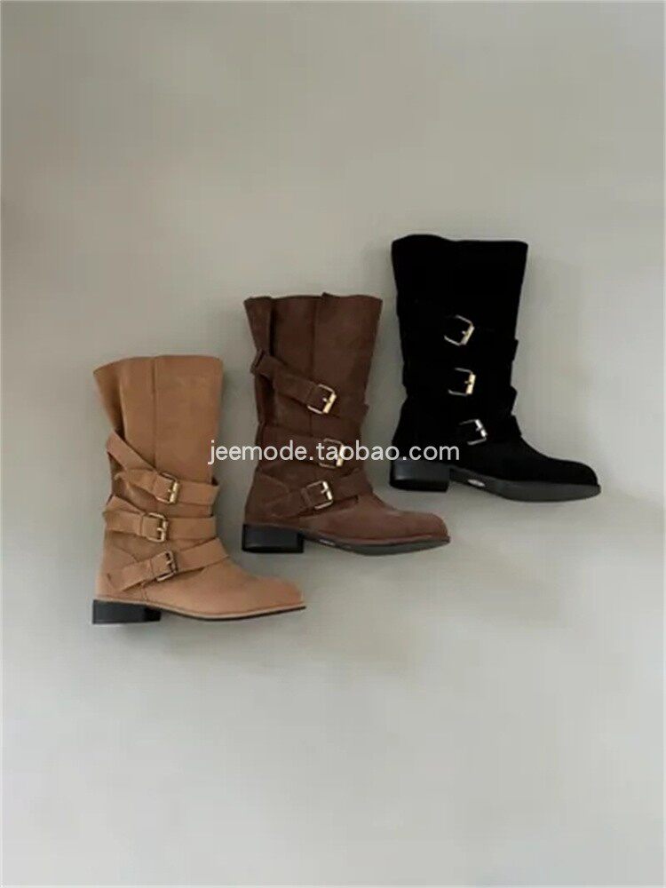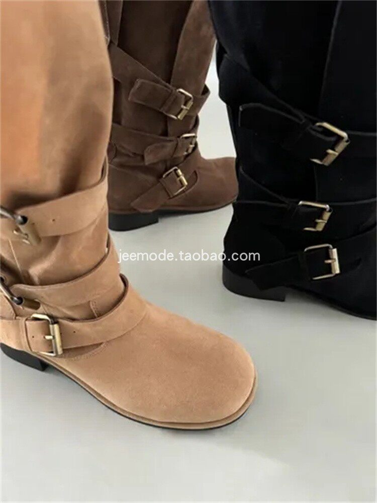 小池在首爾25年秋冬新款圓頭方跟皮帶釦騎士機車中筒絨面韓版女靴
