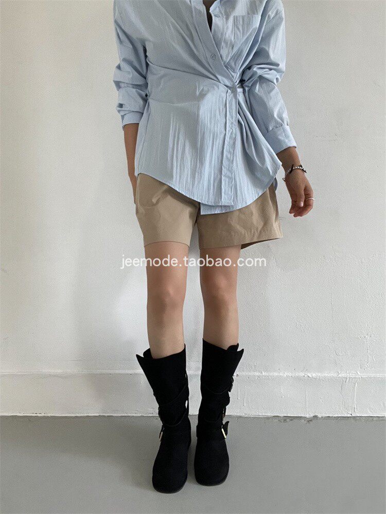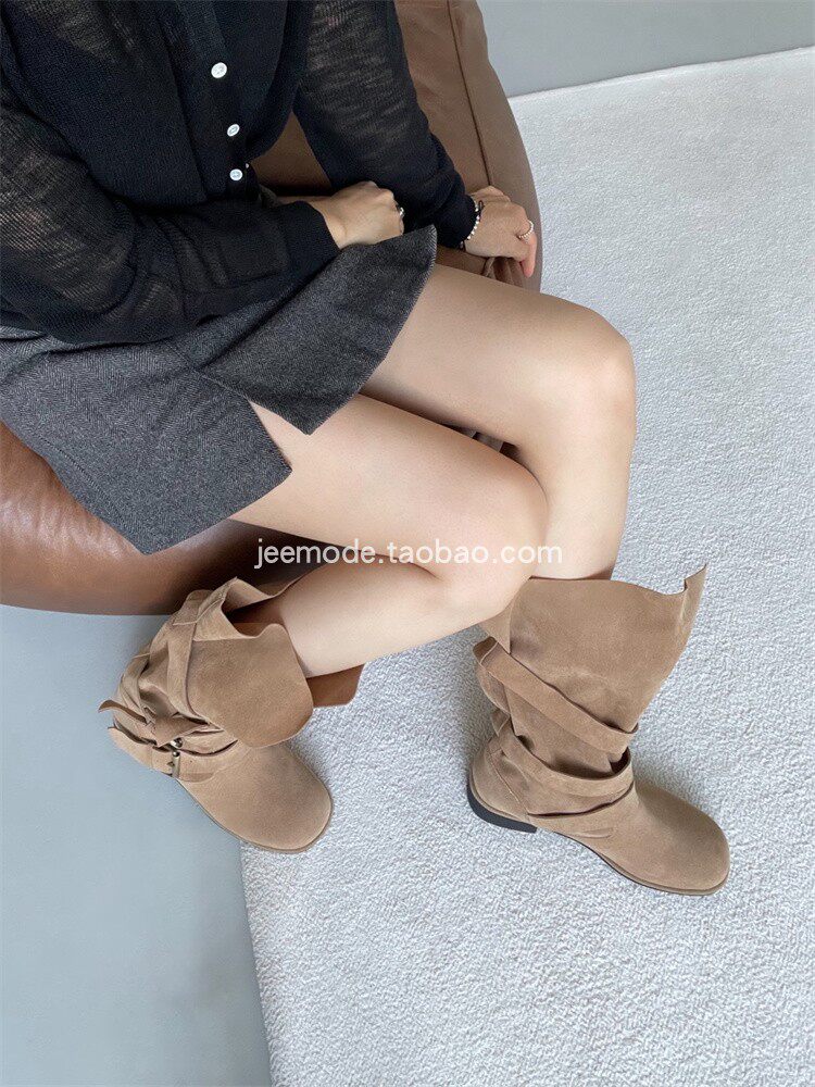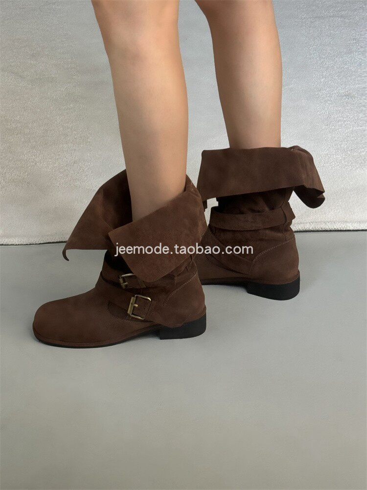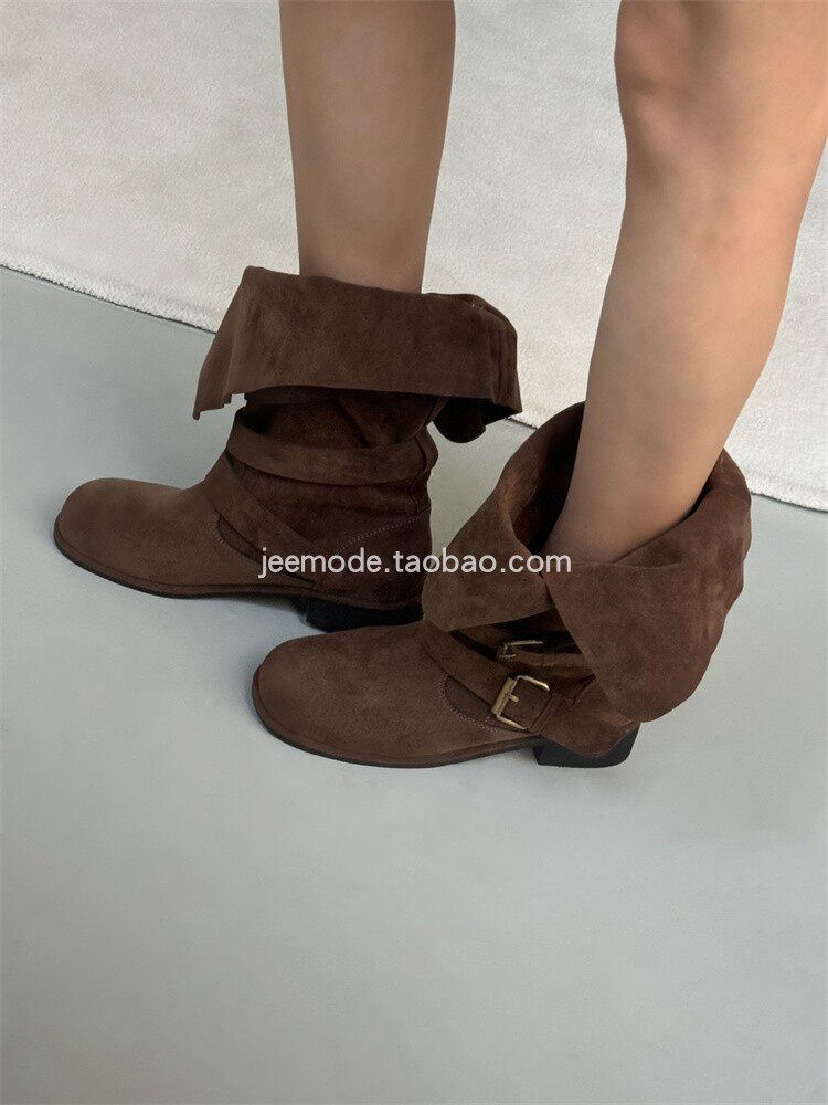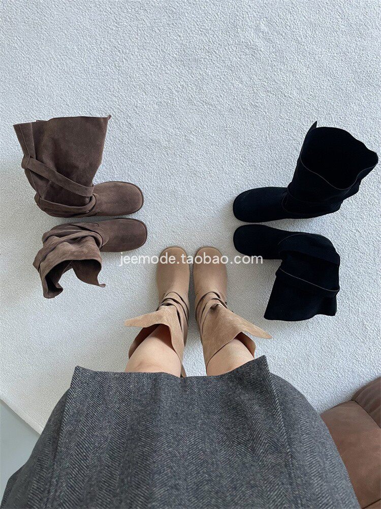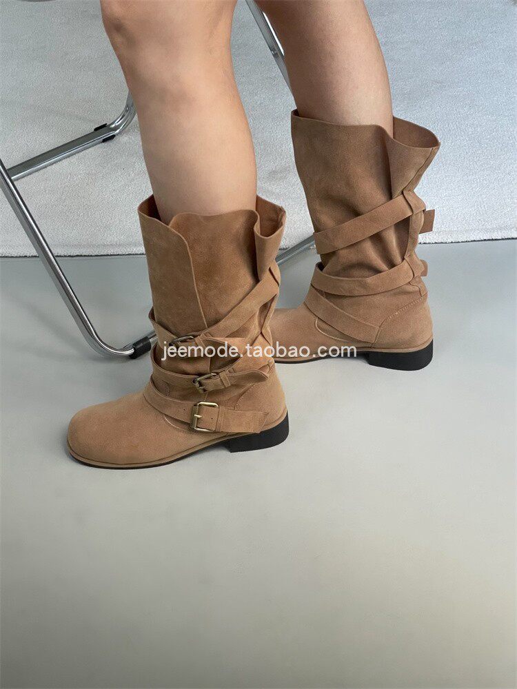 小池在首爾25年秋冬新款圓頭方跟皮帶釦騎士機車中筒絨面韓版女靴