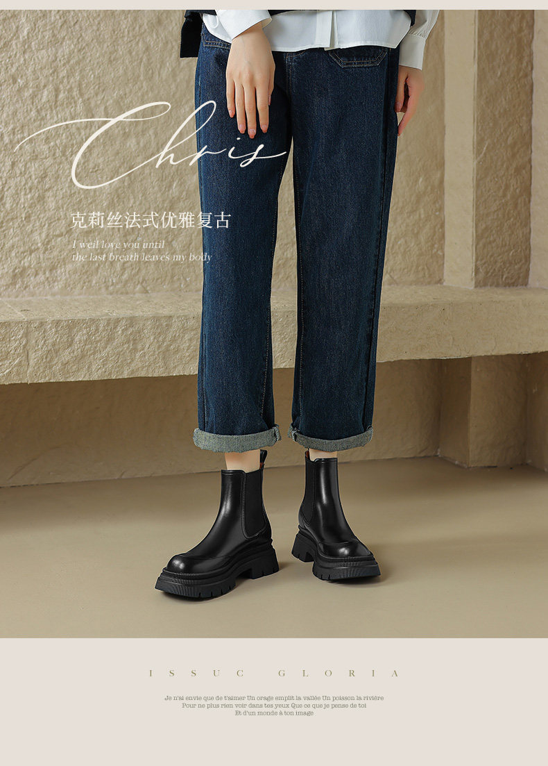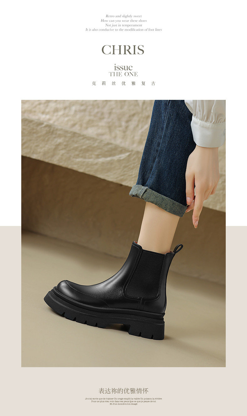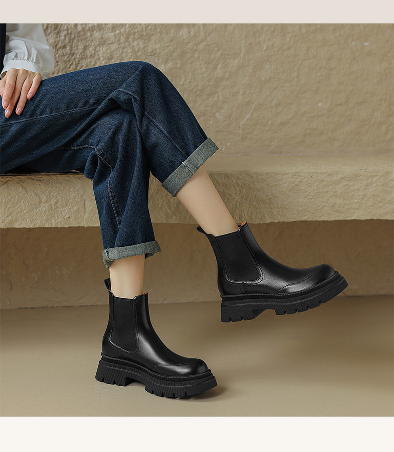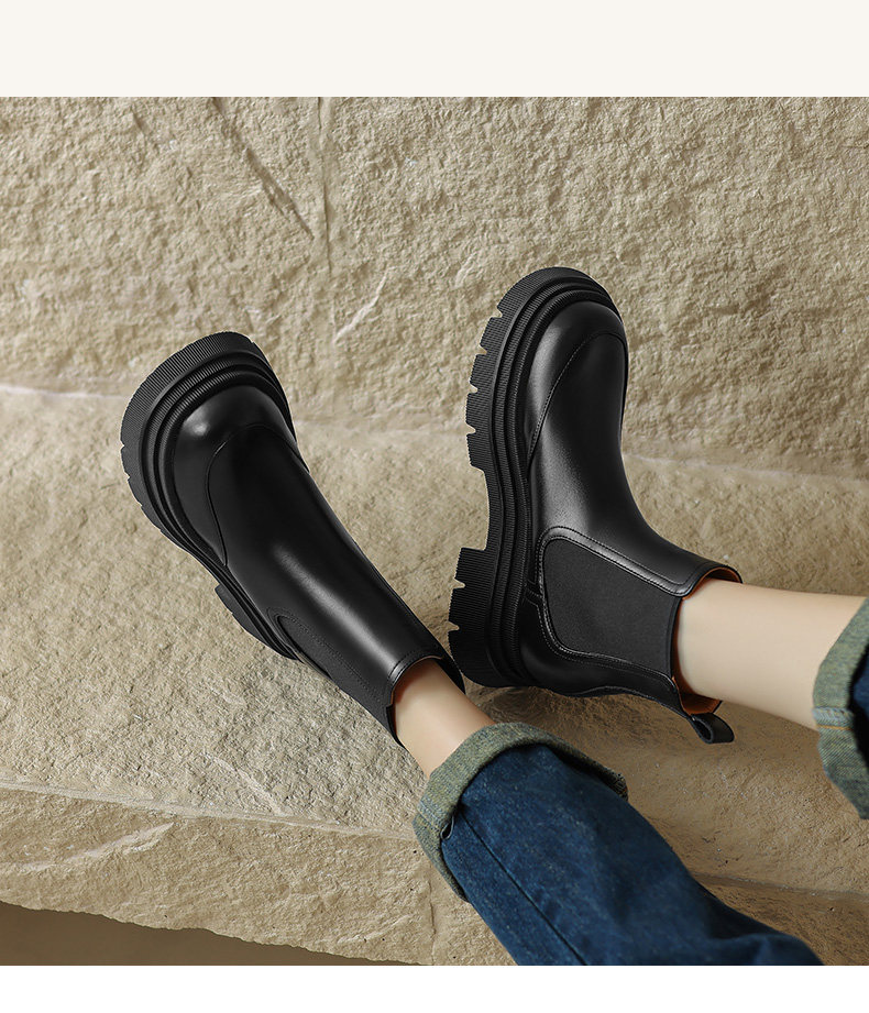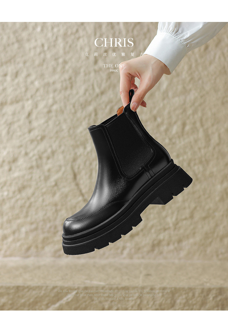 Kmeizu擦色厚底短靴女秋冬馬丁靴真皮菸筒靴真皮機車靴切爾西踝靴