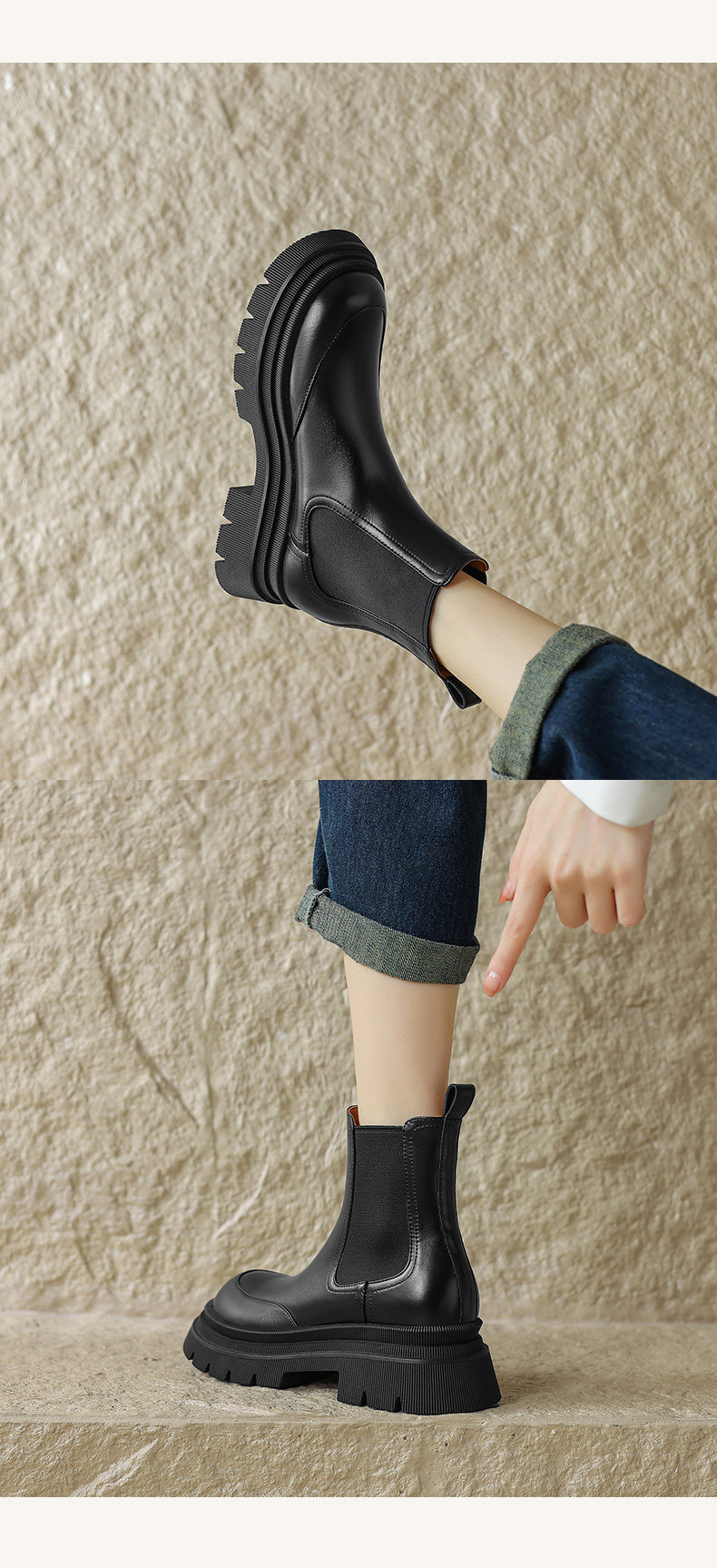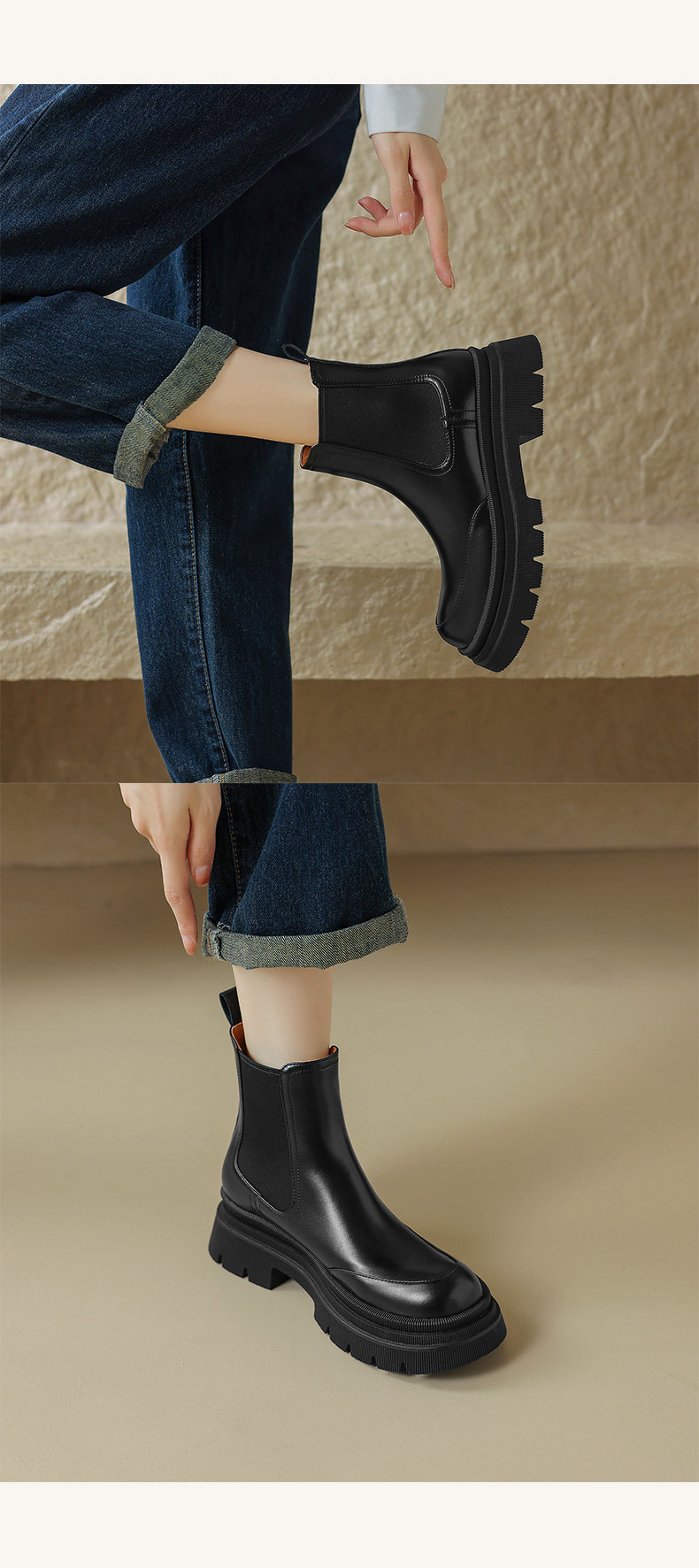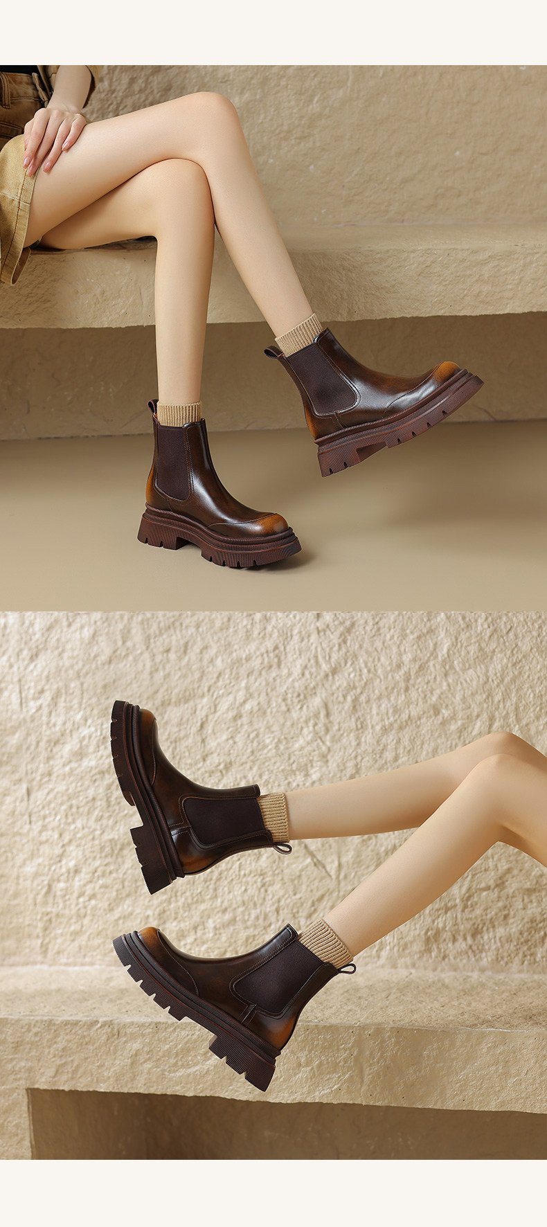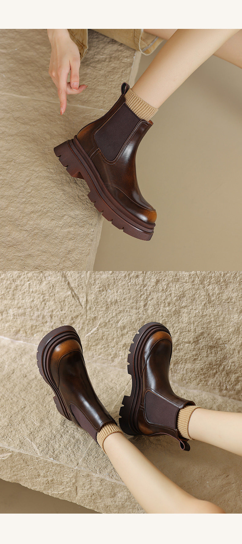Kmeizu擦色厚底短靴女秋冬馬丁靴真皮菸筒靴真皮機車靴切爾西踝靴