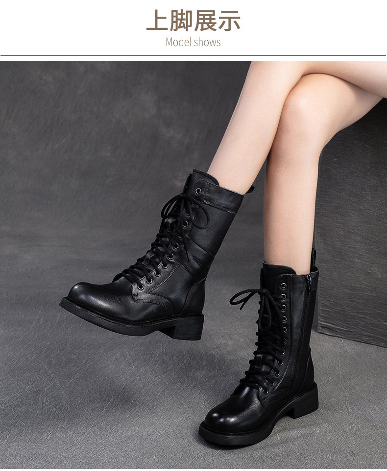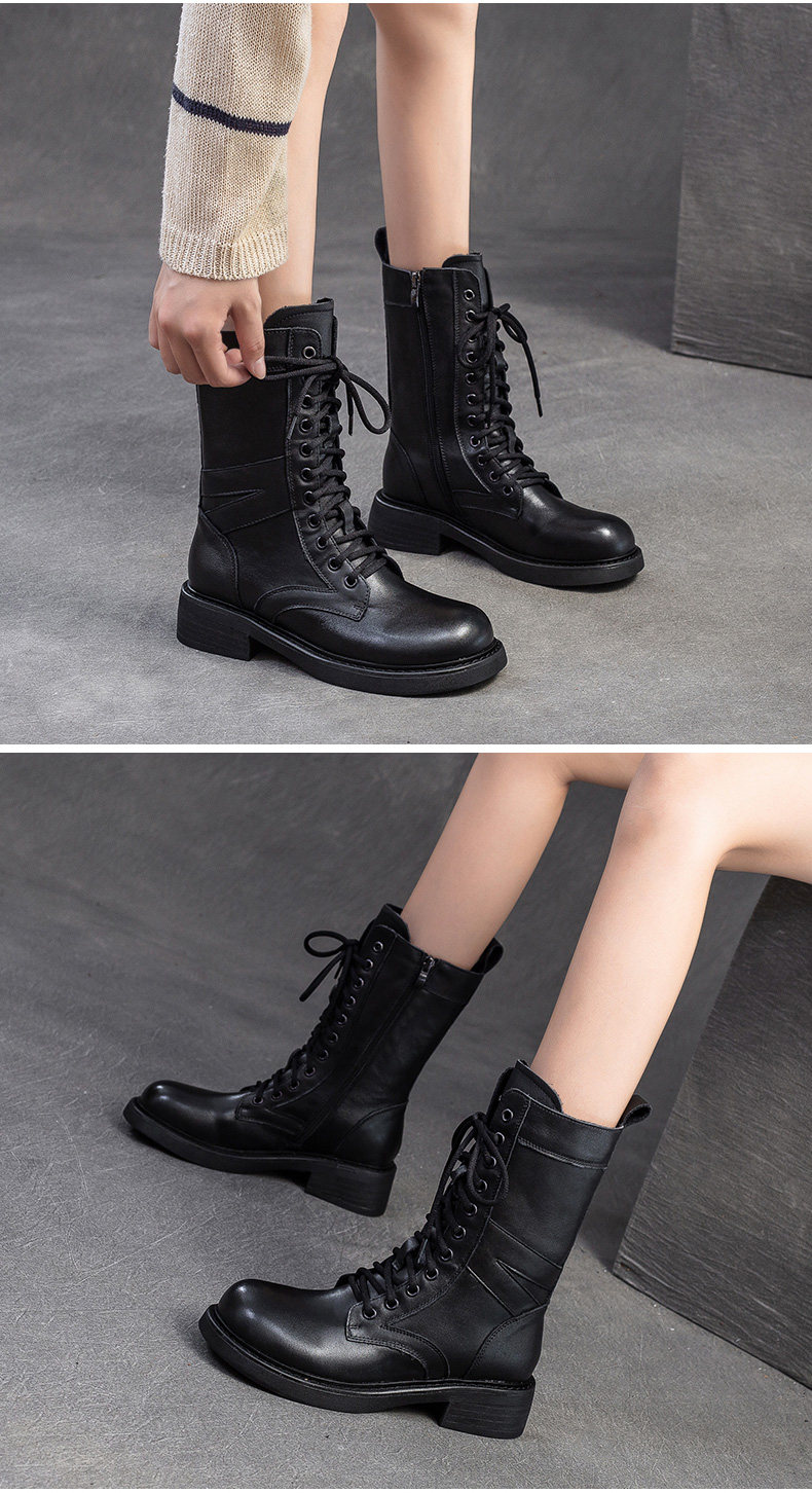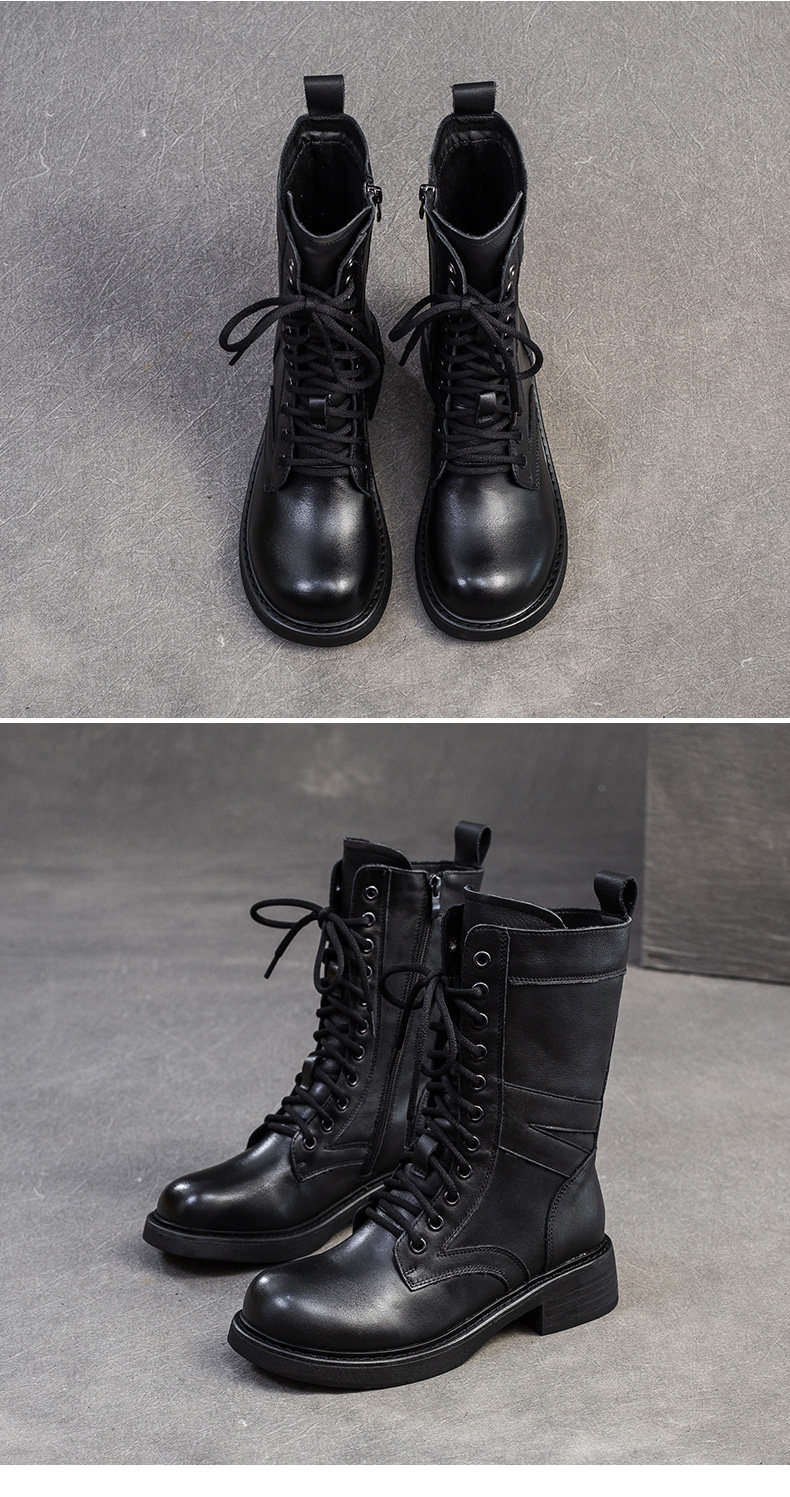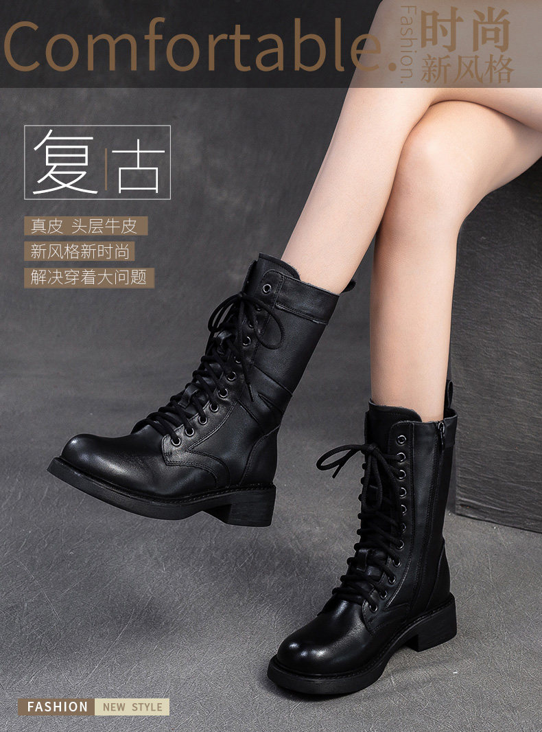 千秦秋冬全牛皮粗跟中筒黑色靴子時尚高筒靴厚底真皮復古馬丁靴女