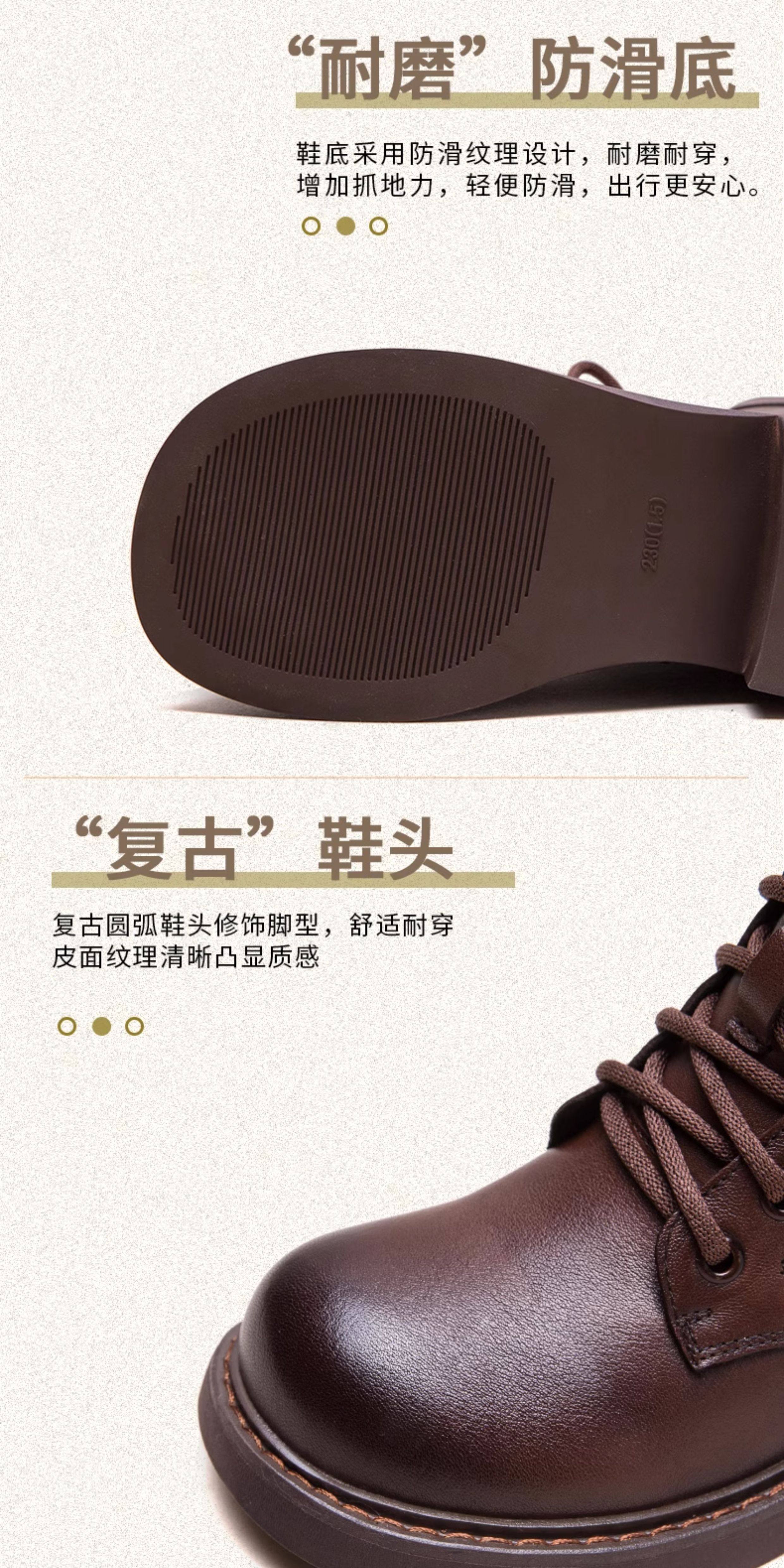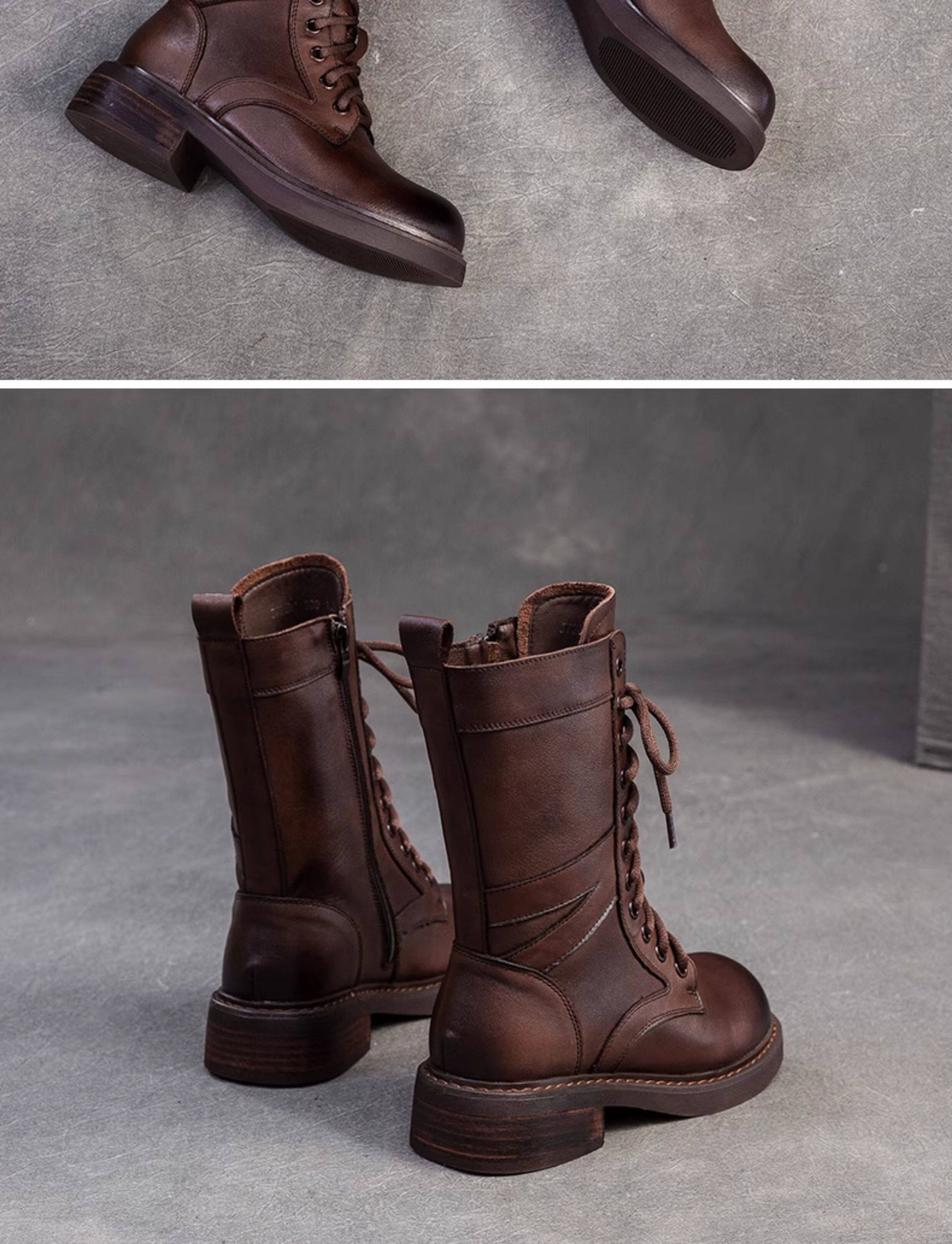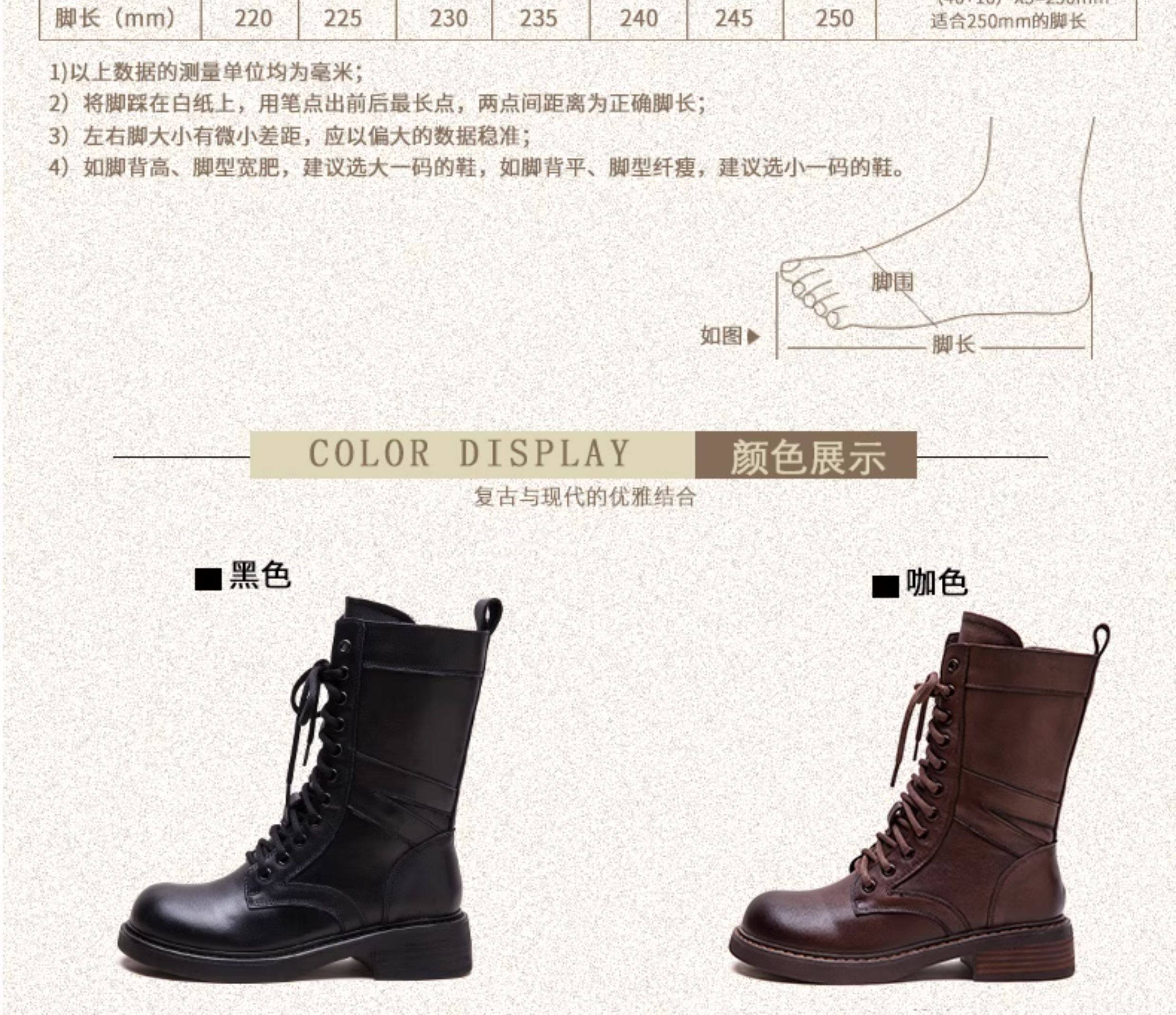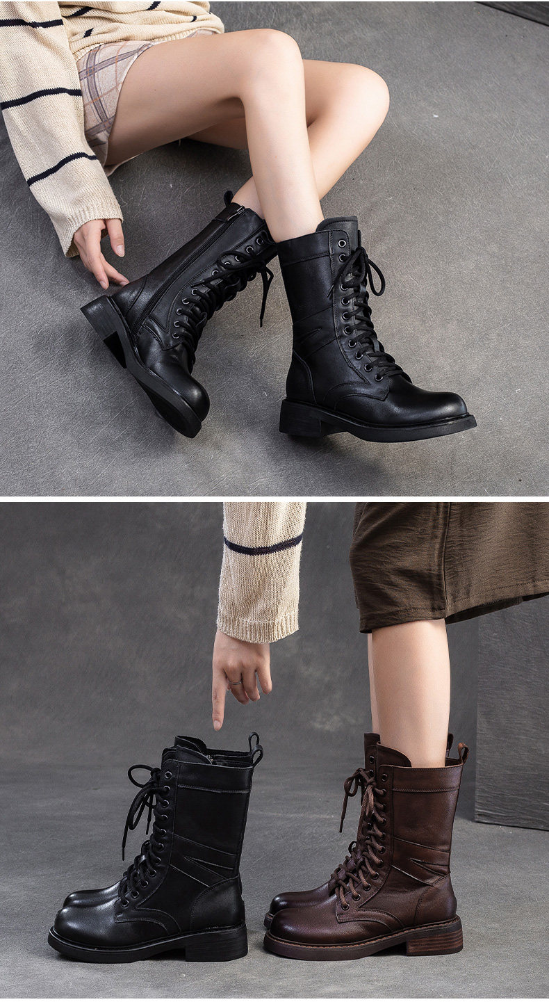 千秦秋冬全牛皮粗跟中筒黑色靴子時尚高筒靴厚底真皮復古馬丁靴女
