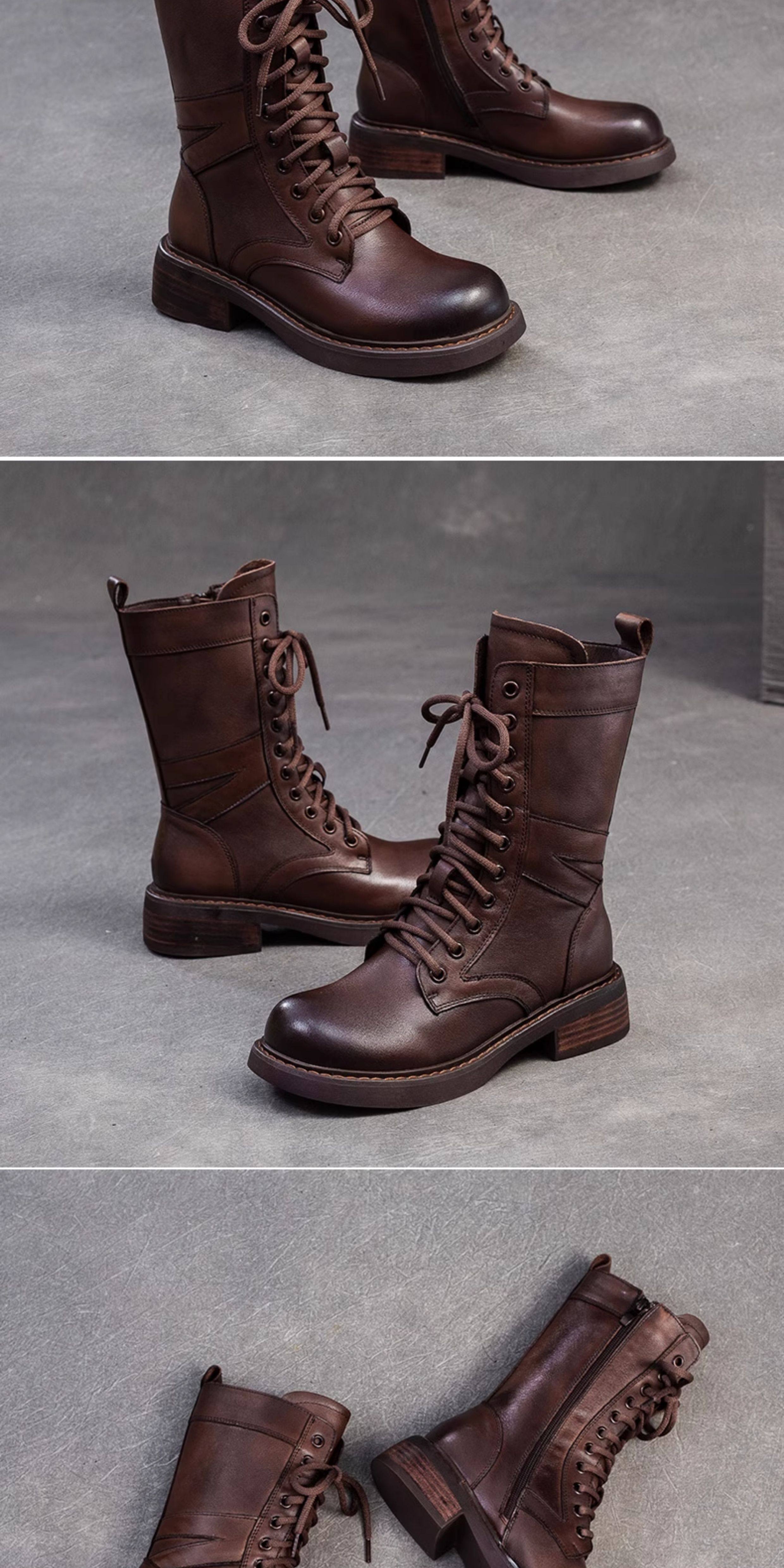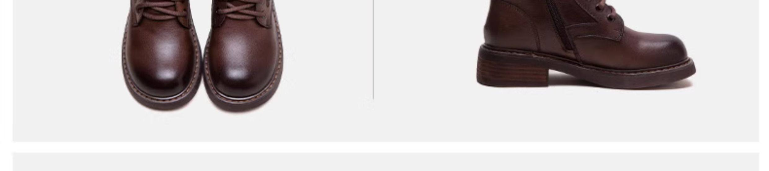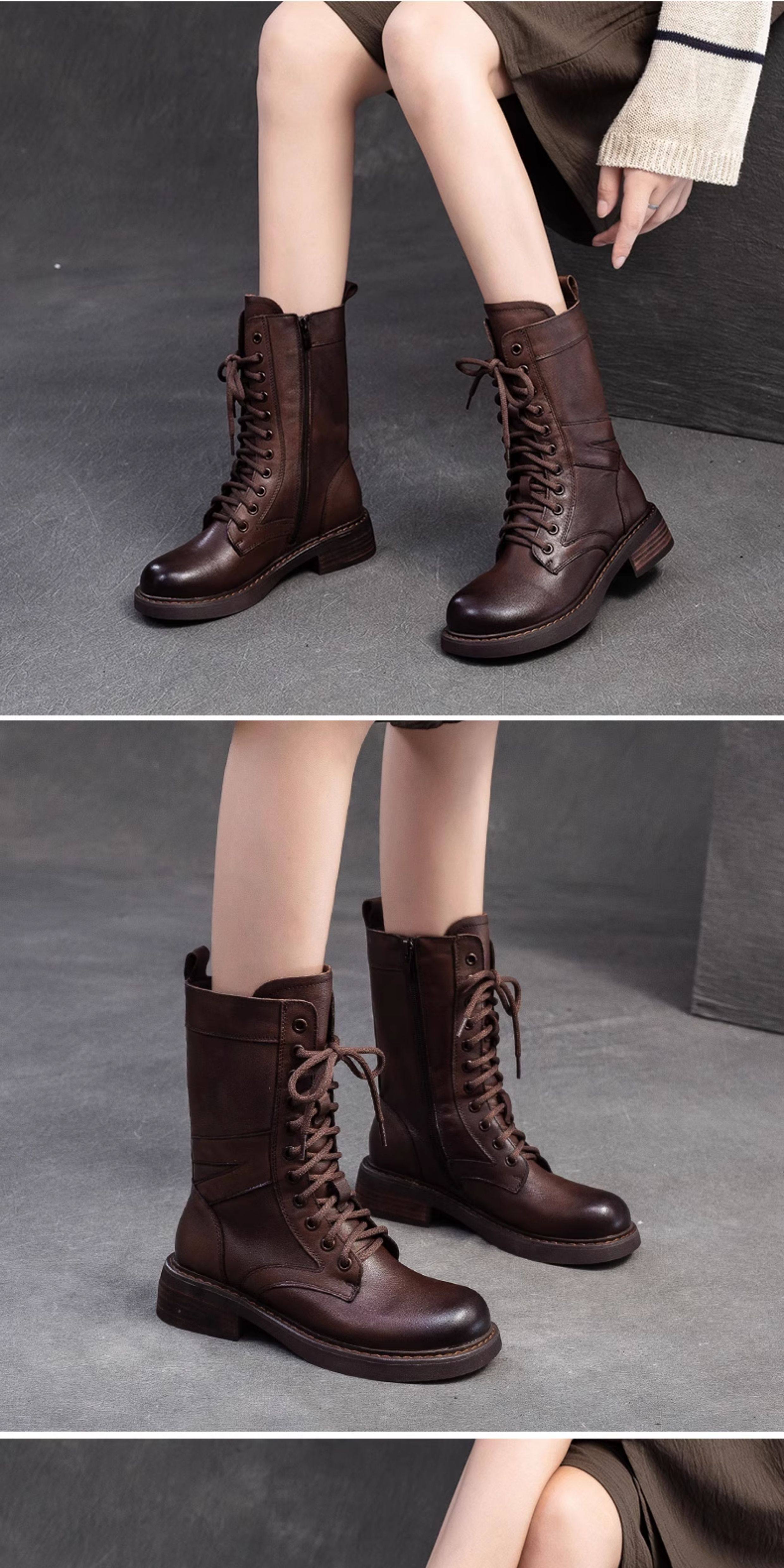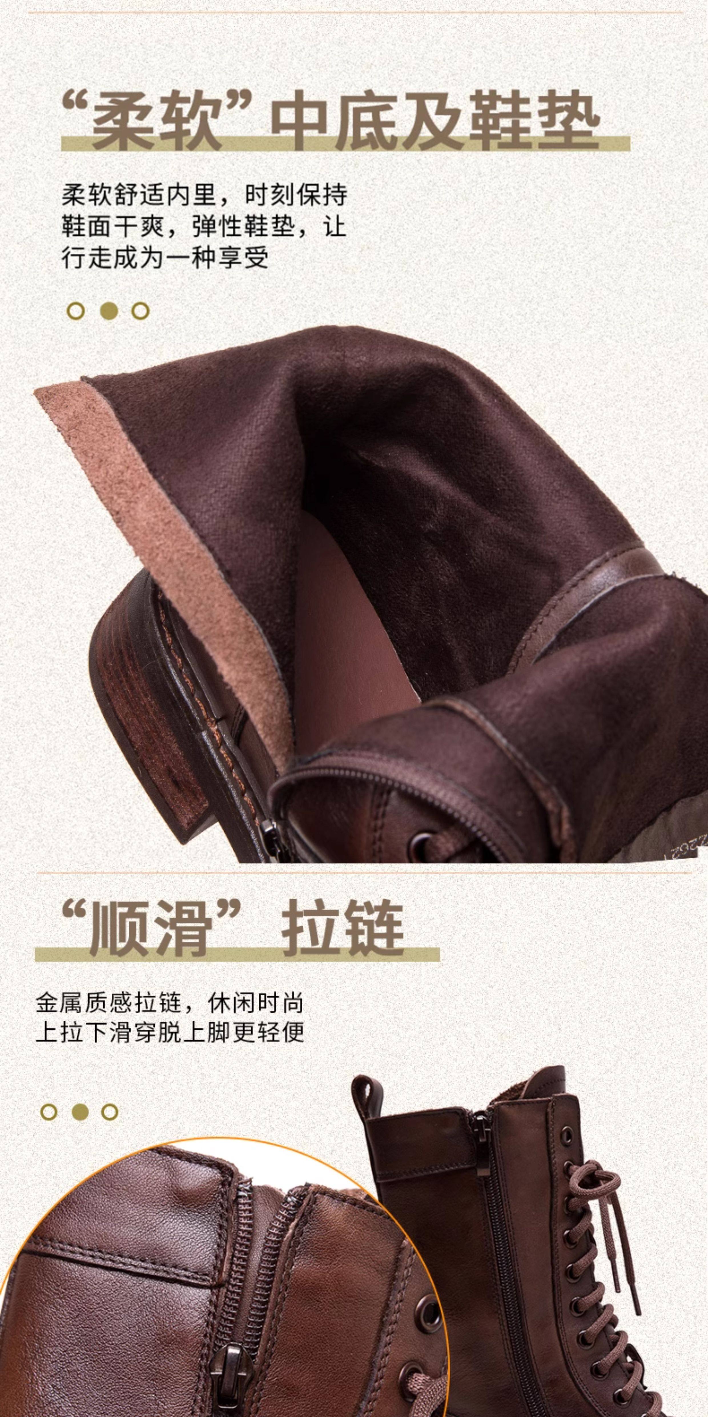 千秦秋冬全牛皮粗跟中筒黑色靴子時尚高筒靴厚底真皮復古馬丁靴女