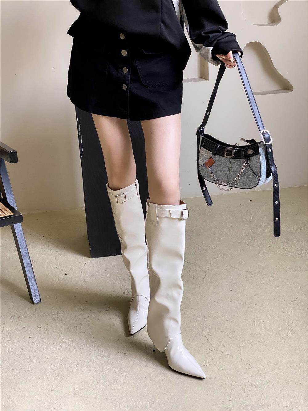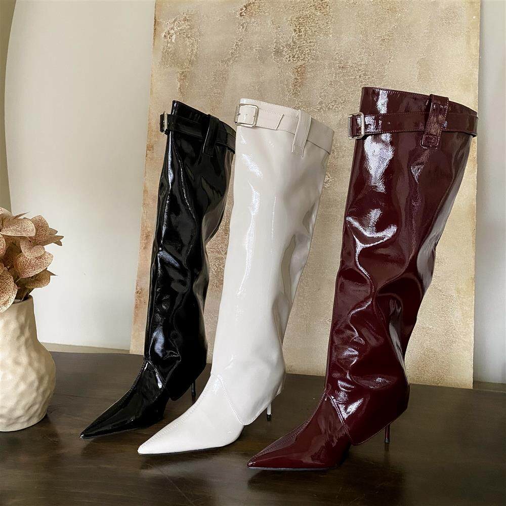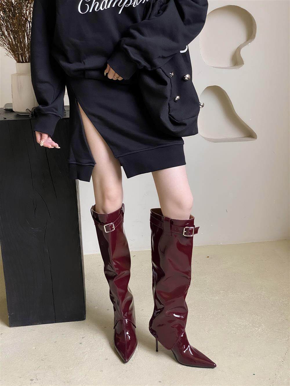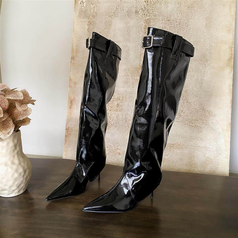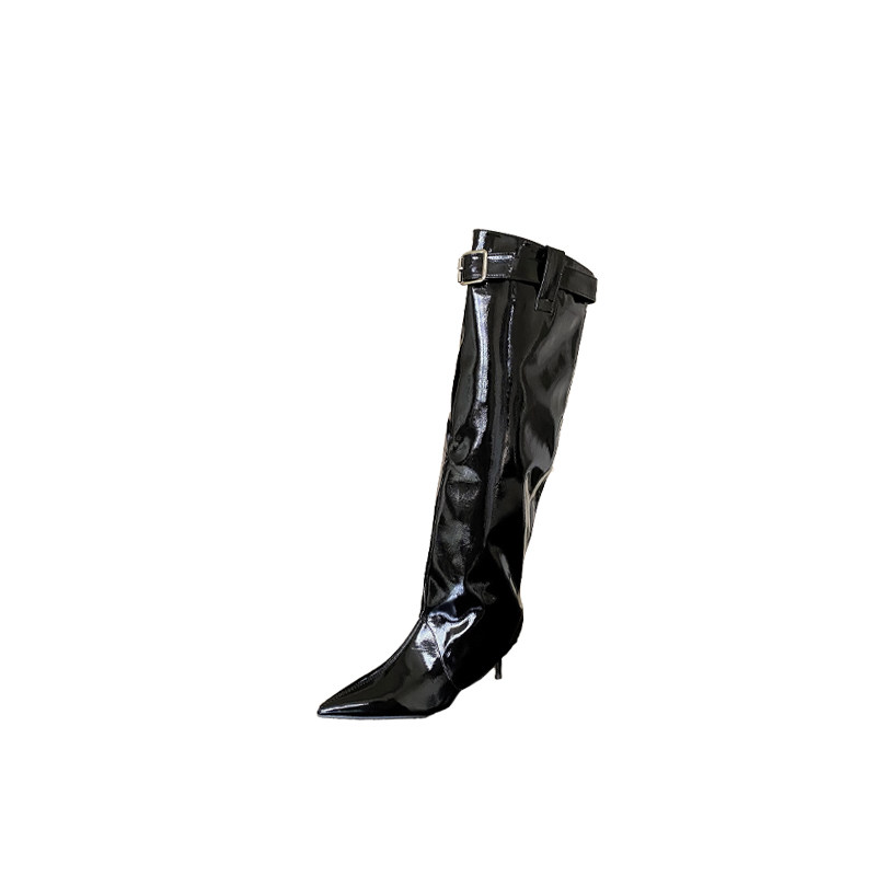 2025歐美風尖頭高跟漆皮亮面皮帶釦高筒不過膝長靴騎士靴女馬丁靴