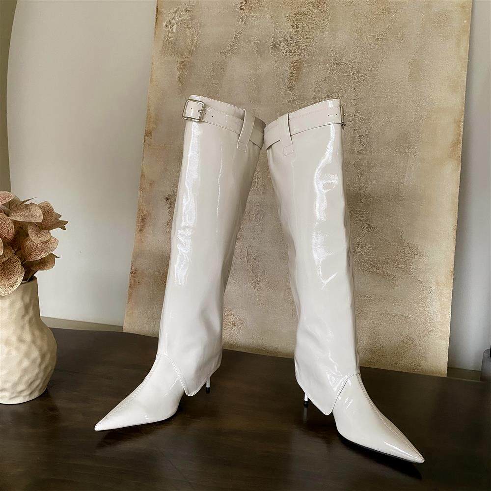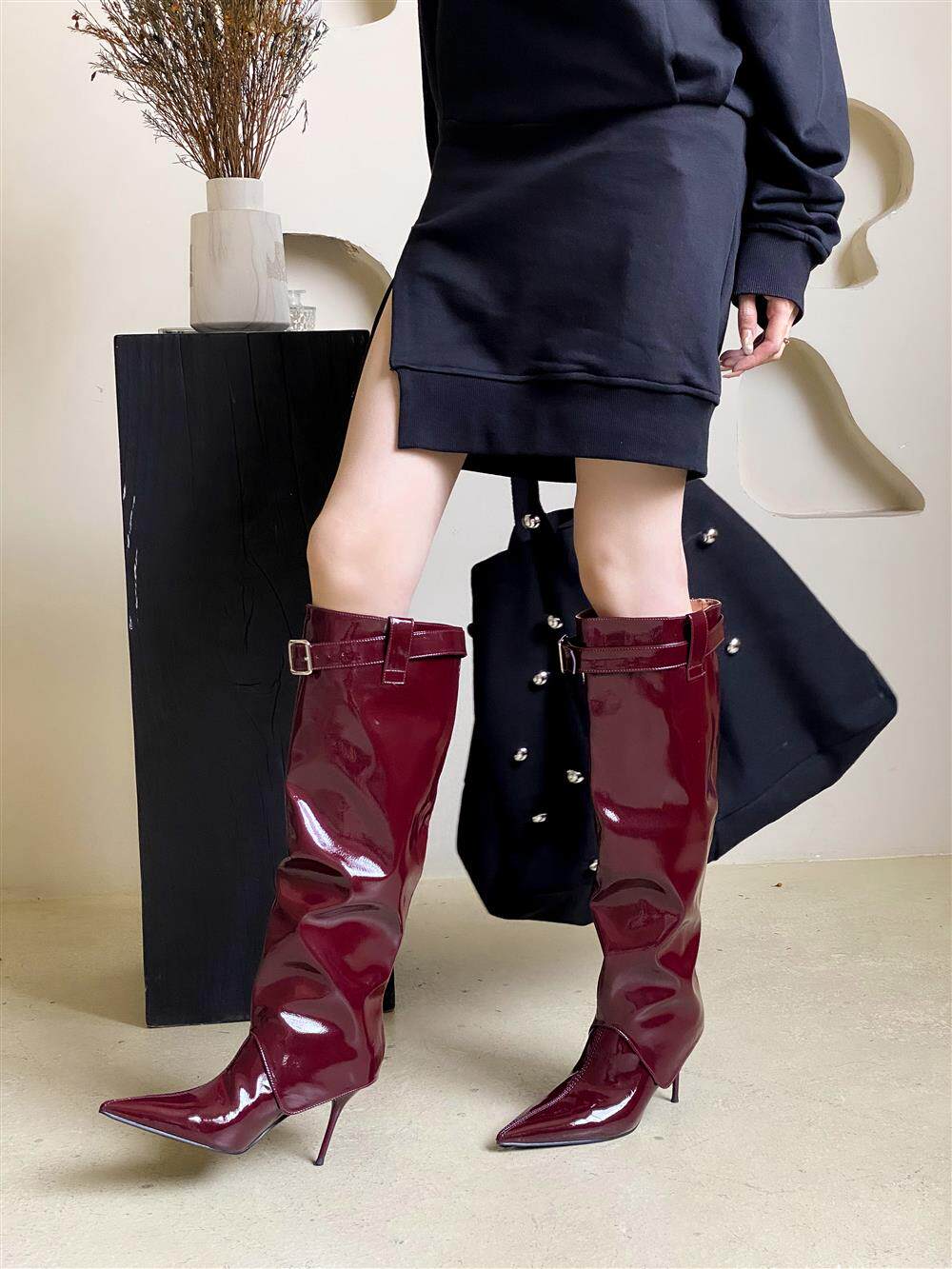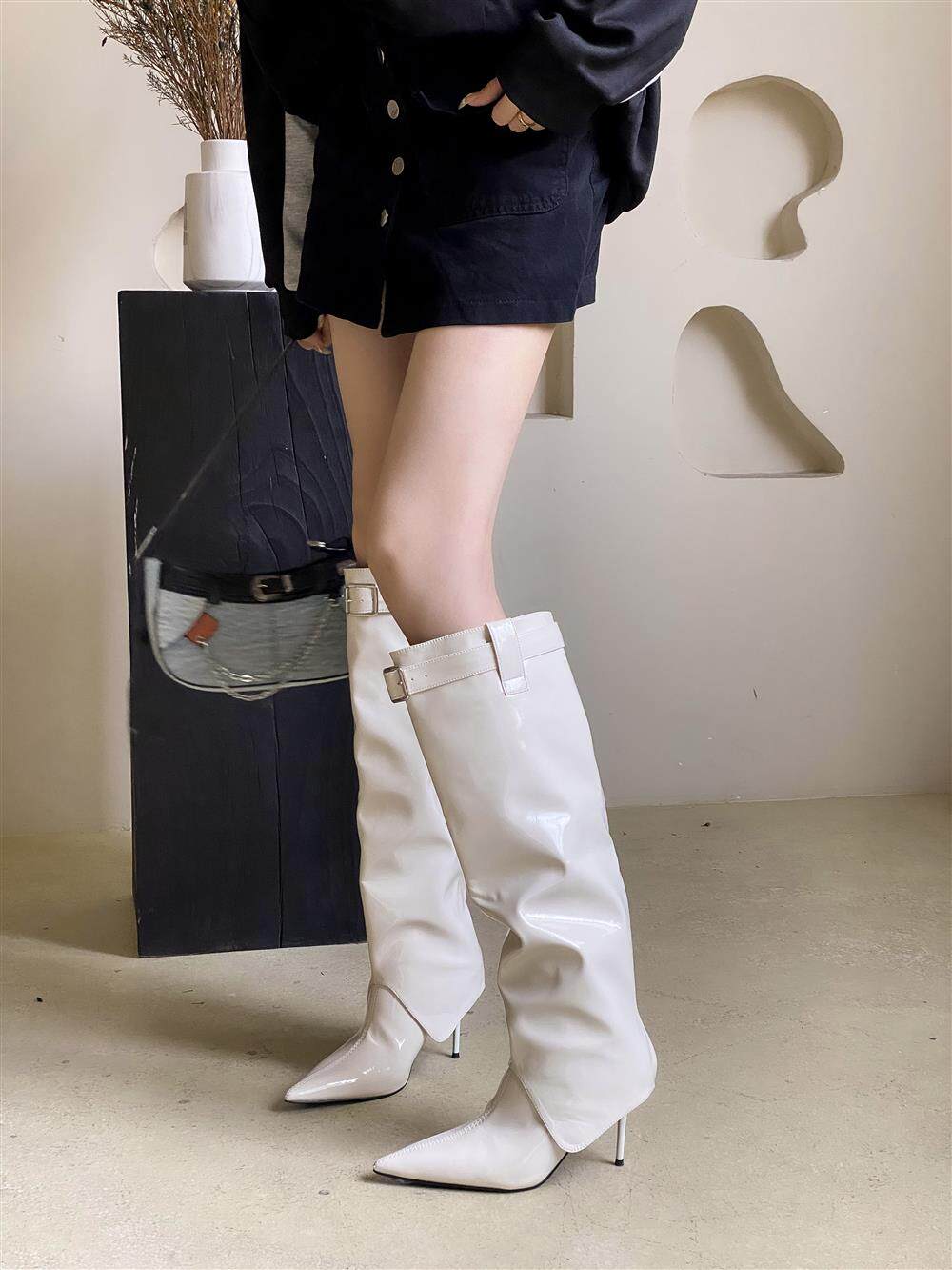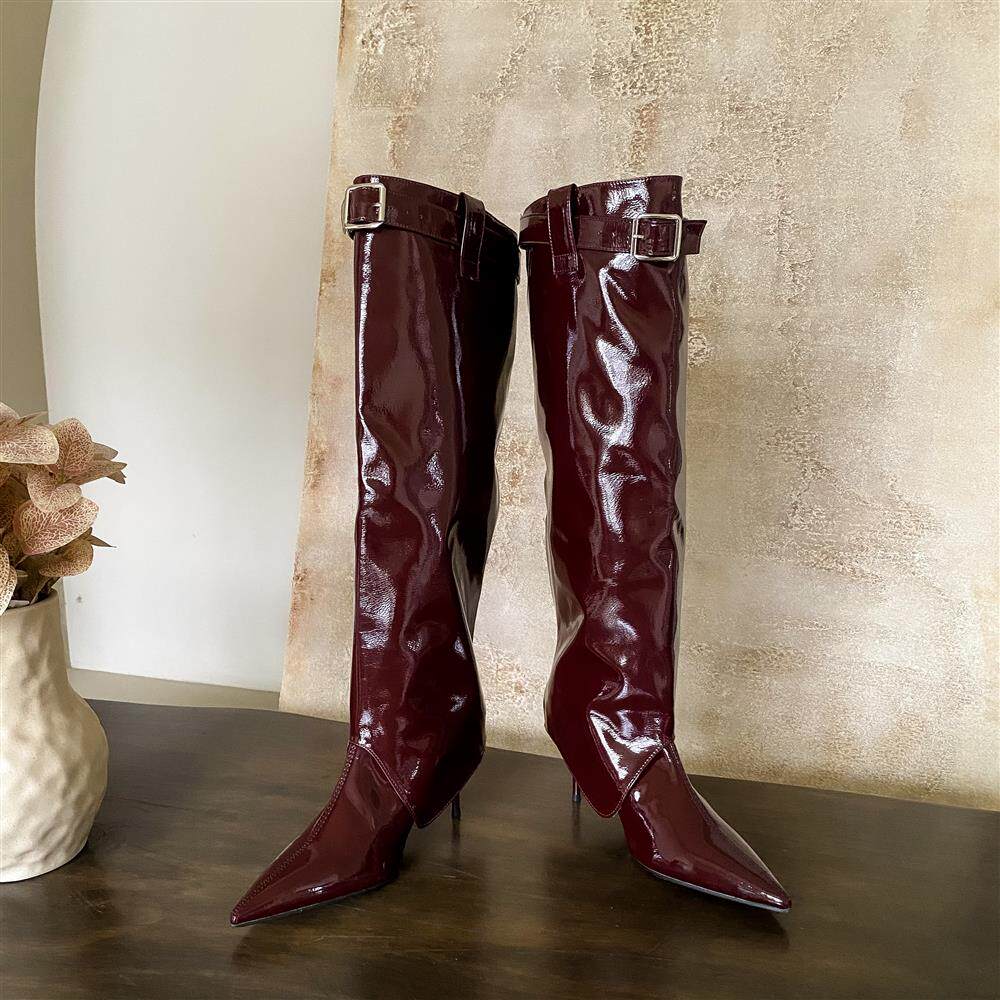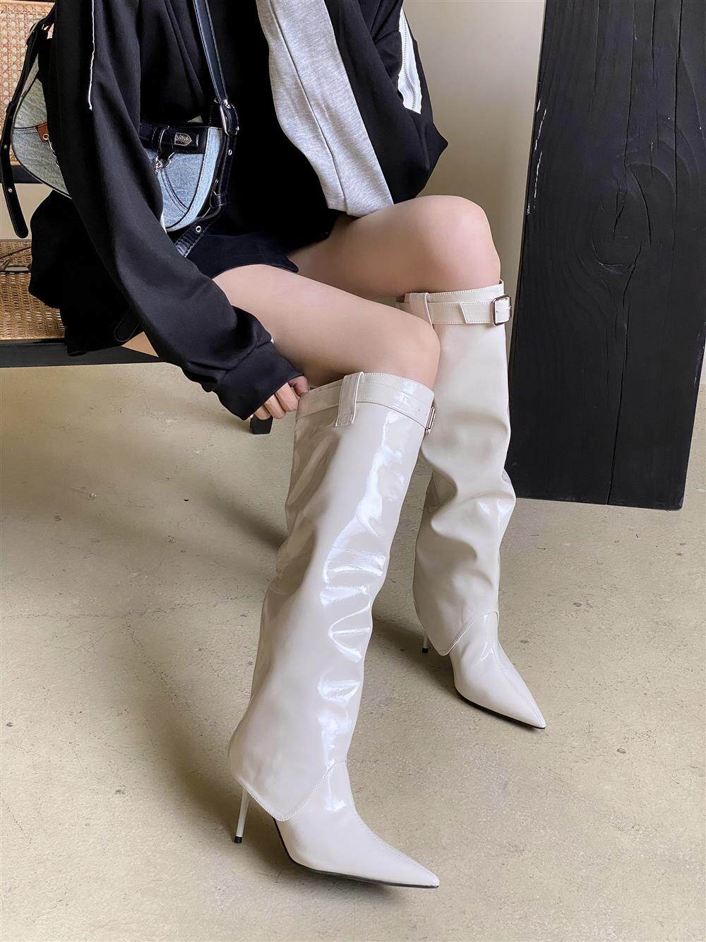 2025歐美風尖頭高跟漆皮亮面皮帶釦高筒不過膝長靴騎士靴女馬丁靴