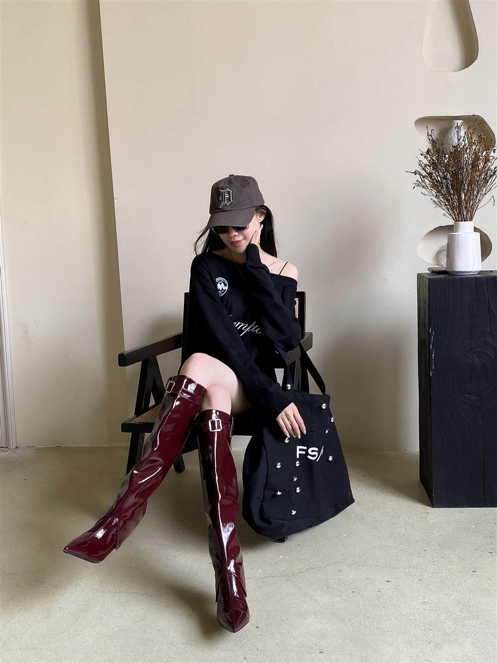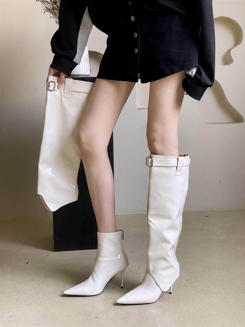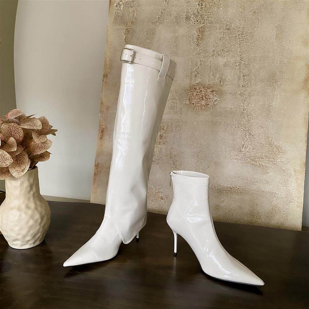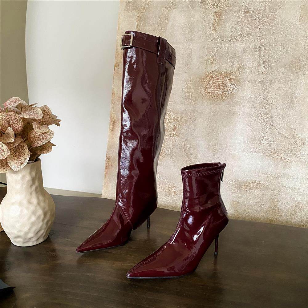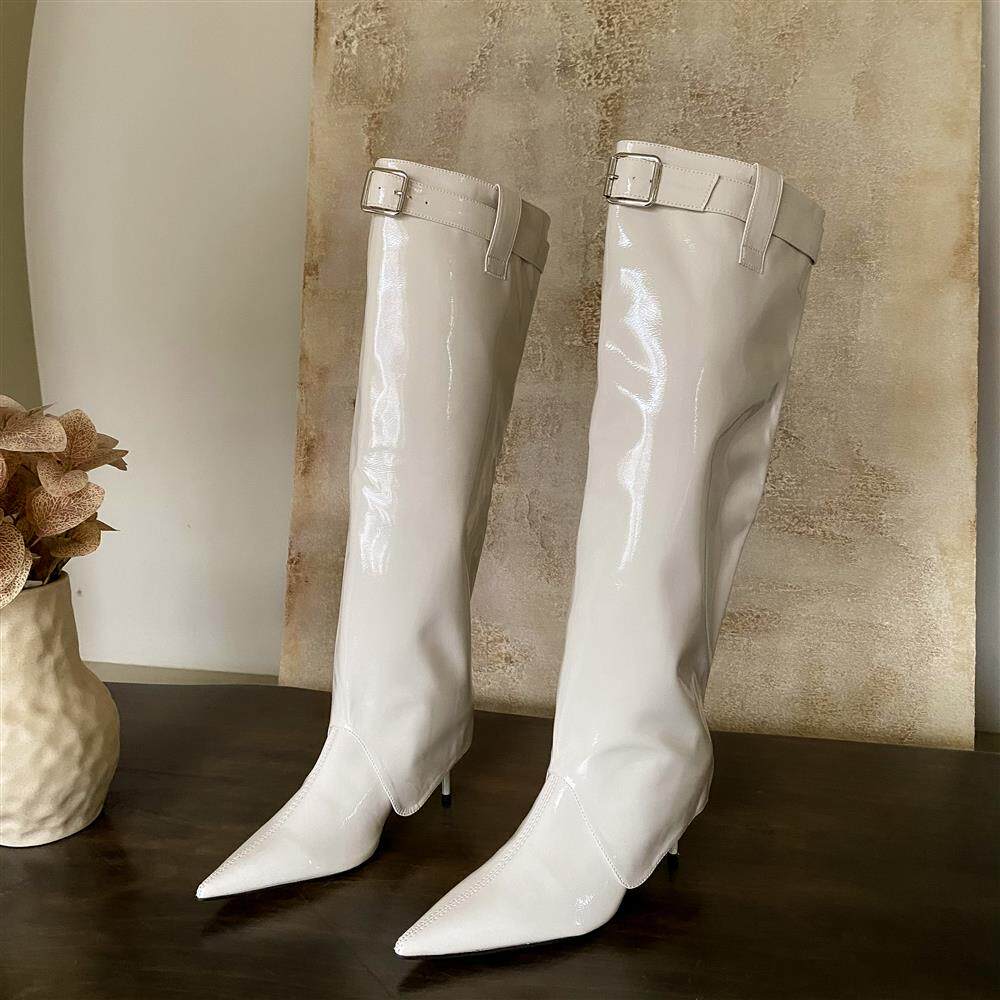 2025歐美風尖頭高跟漆皮亮面皮帶釦高筒不過膝長靴騎士靴女馬丁靴