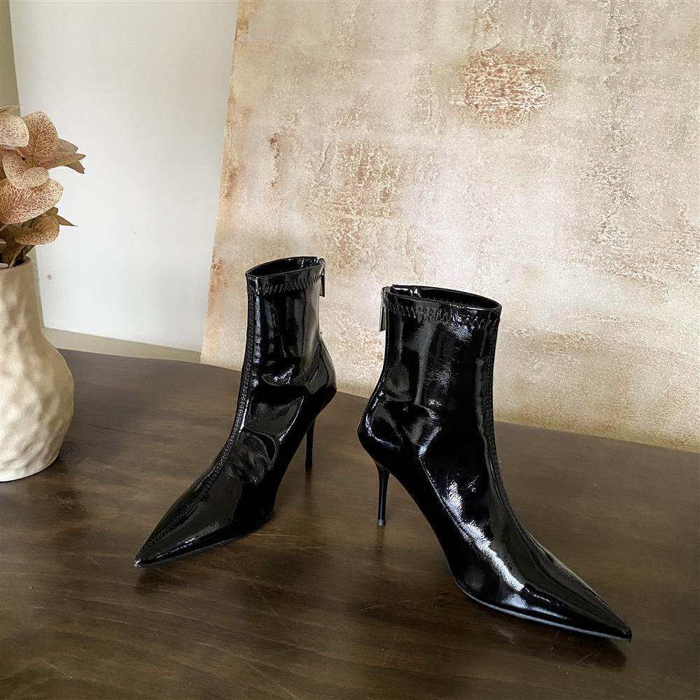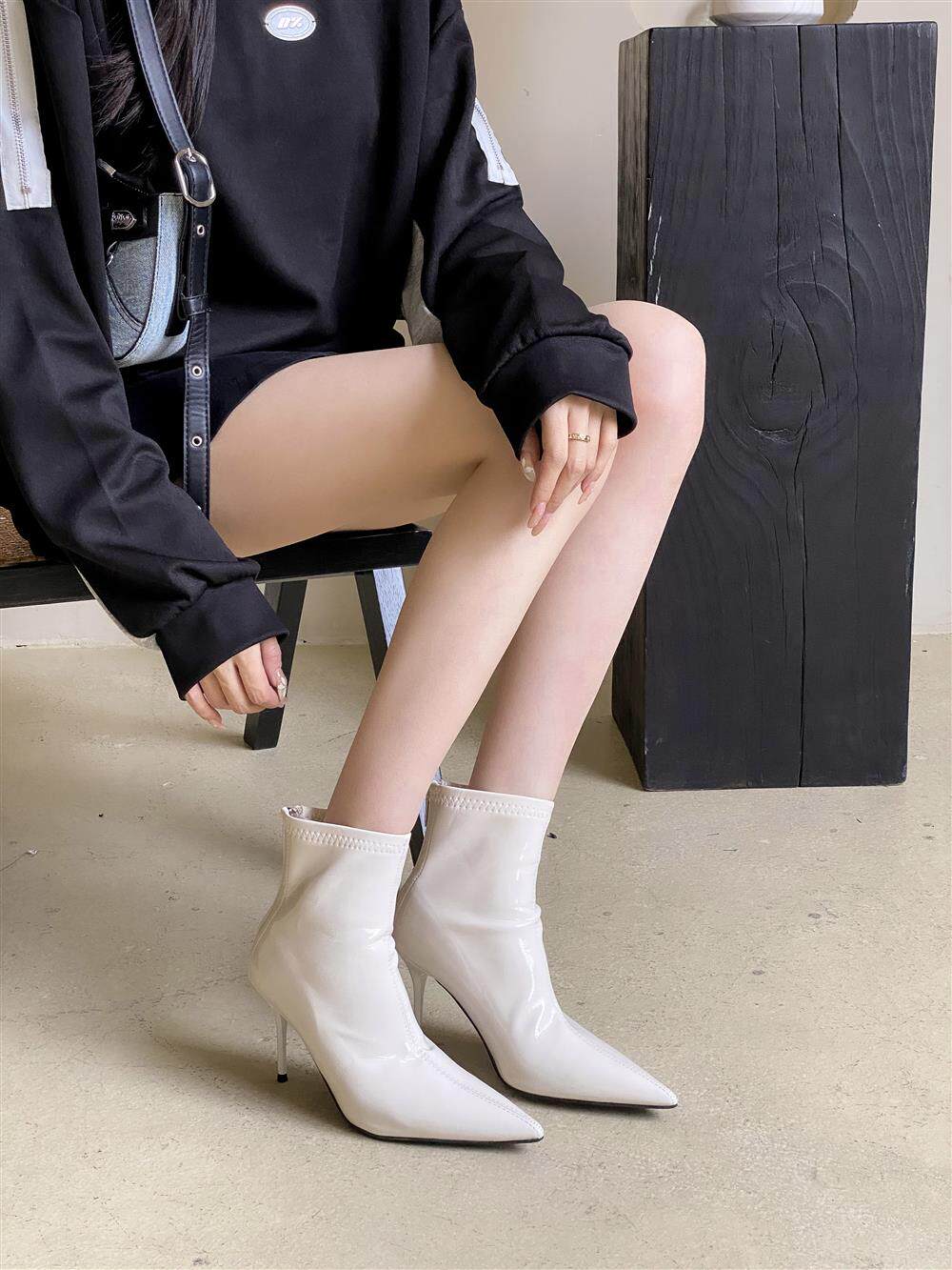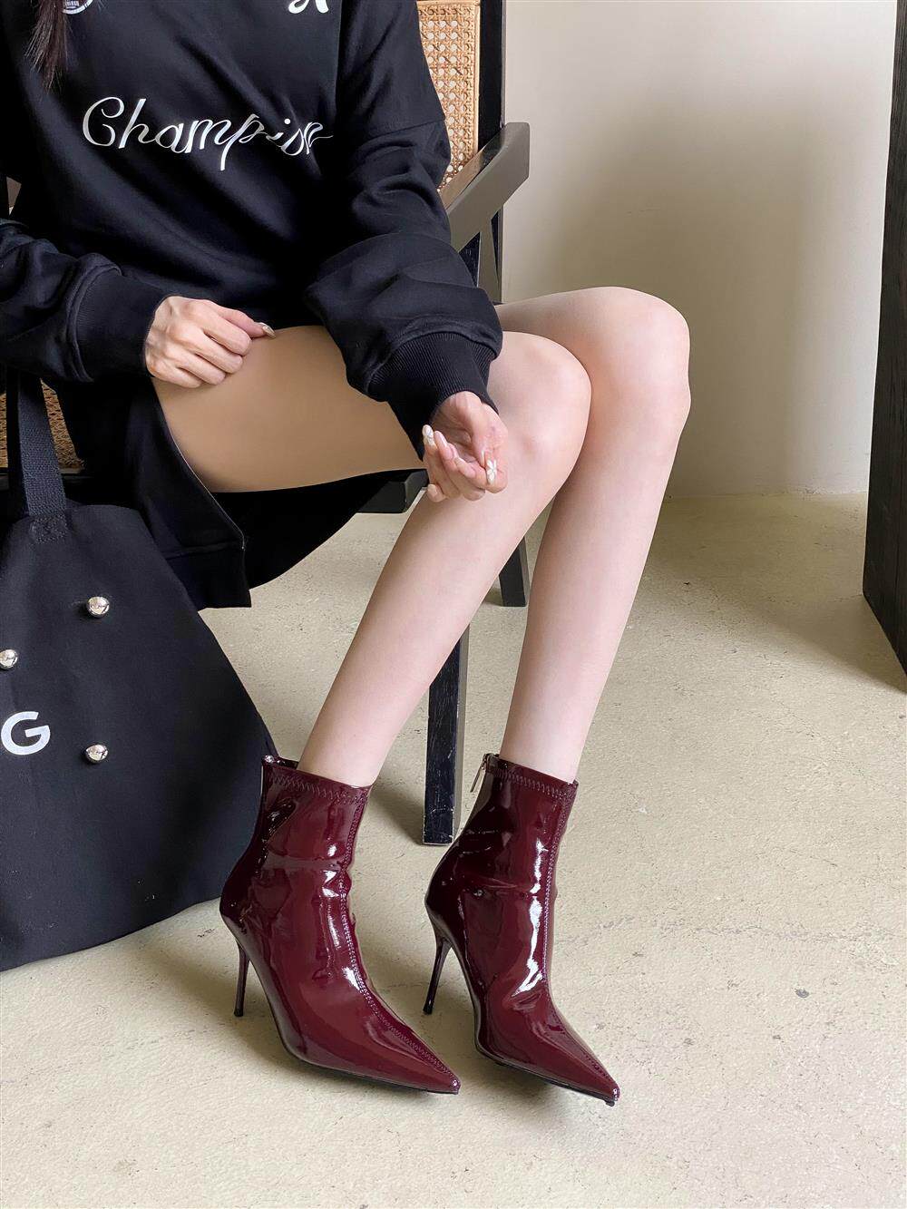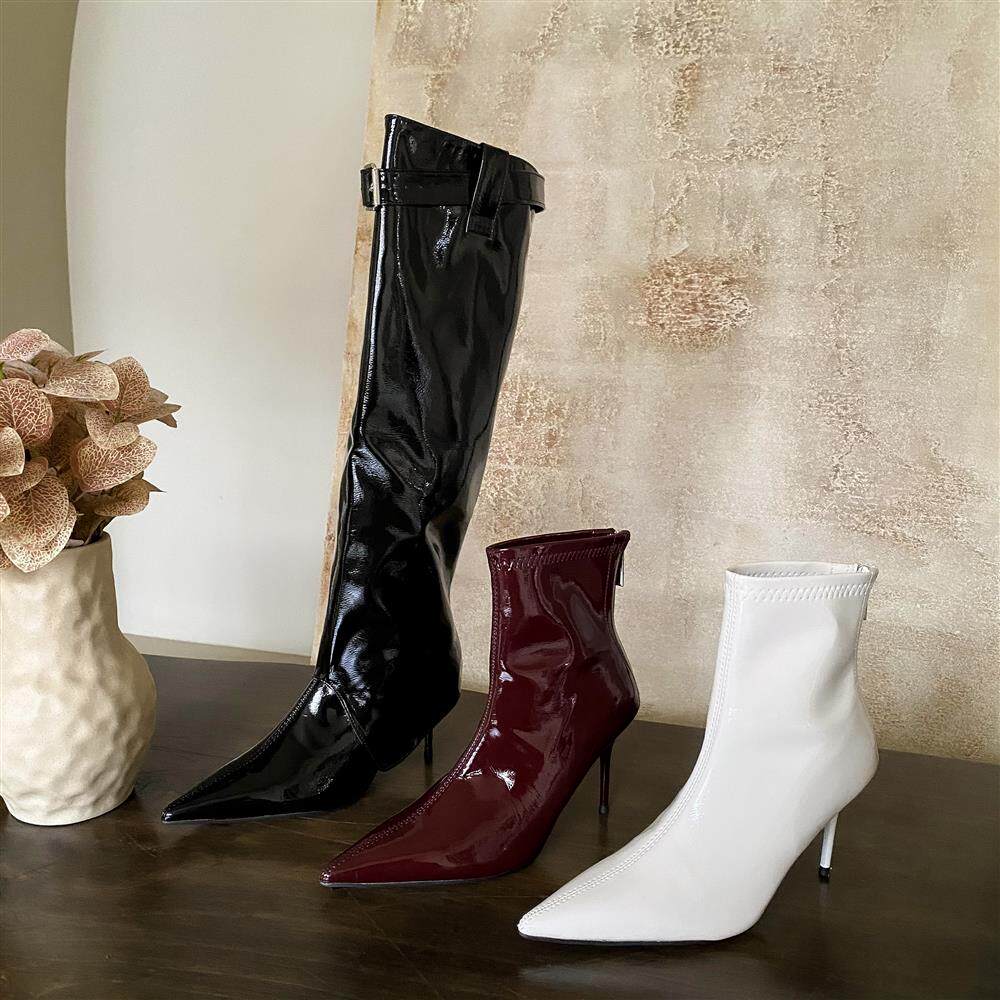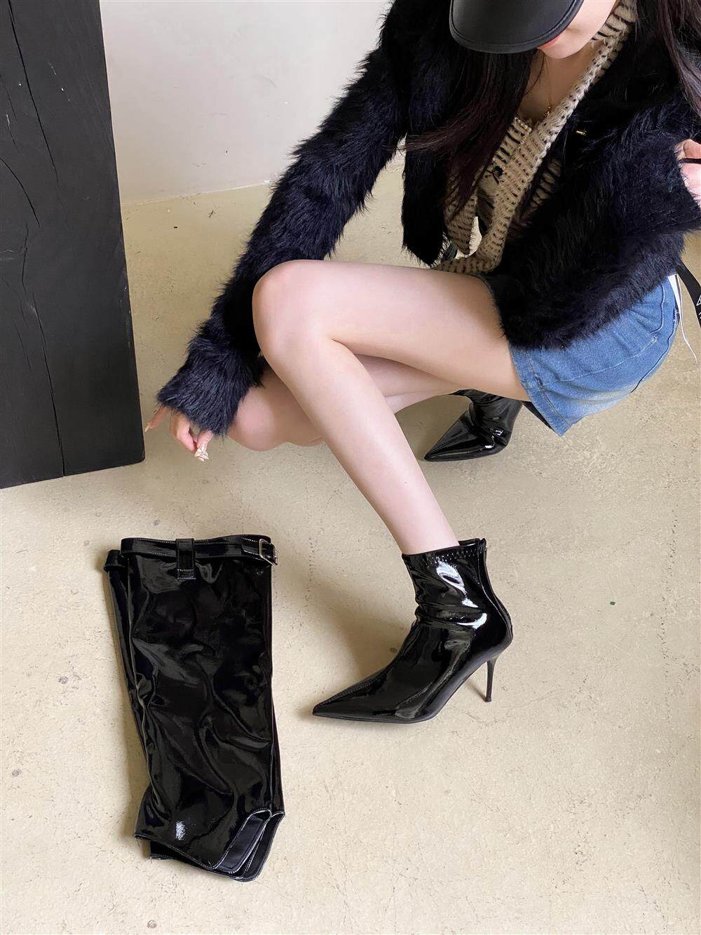 2025歐美風尖頭高跟漆皮亮面皮帶釦高筒不過膝長靴騎士靴女馬丁靴
