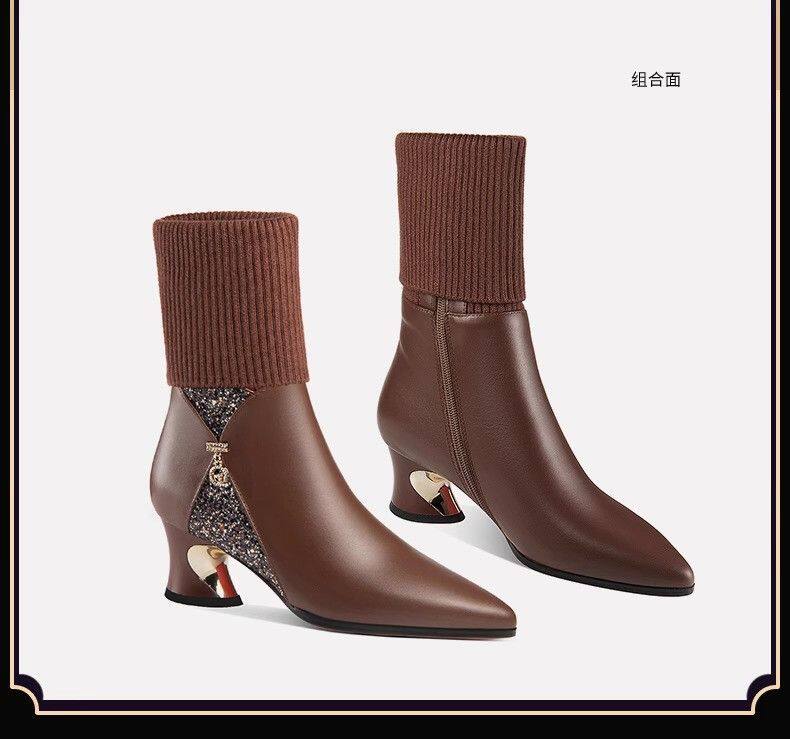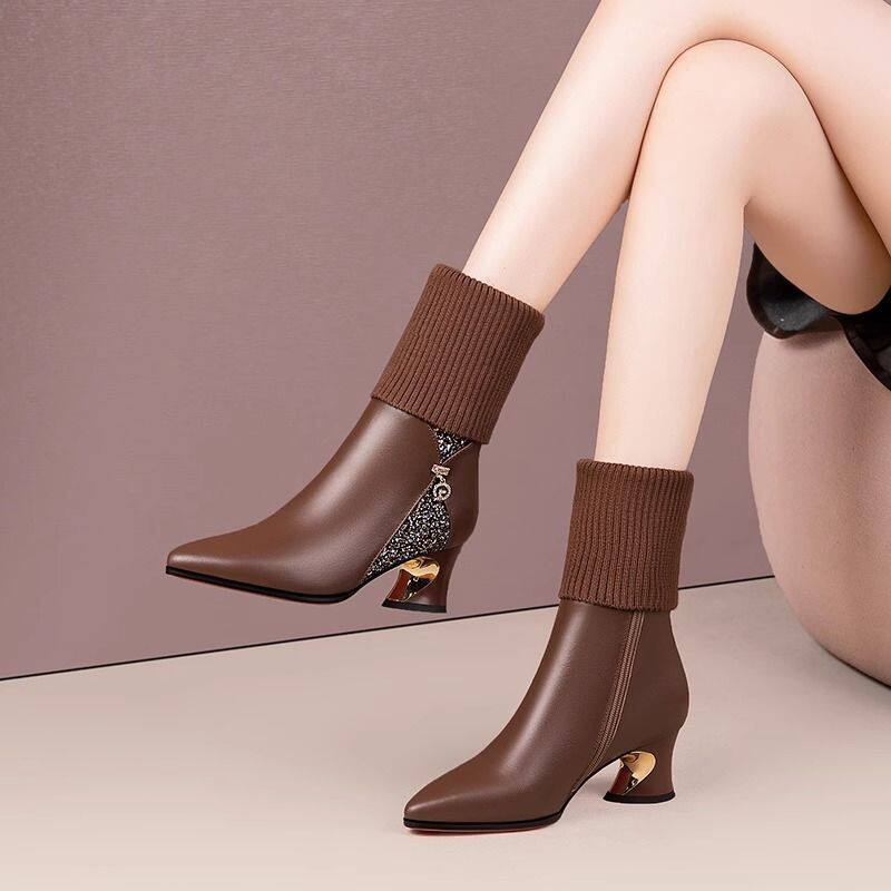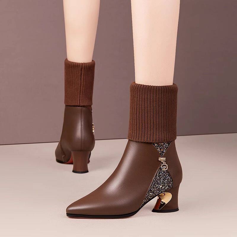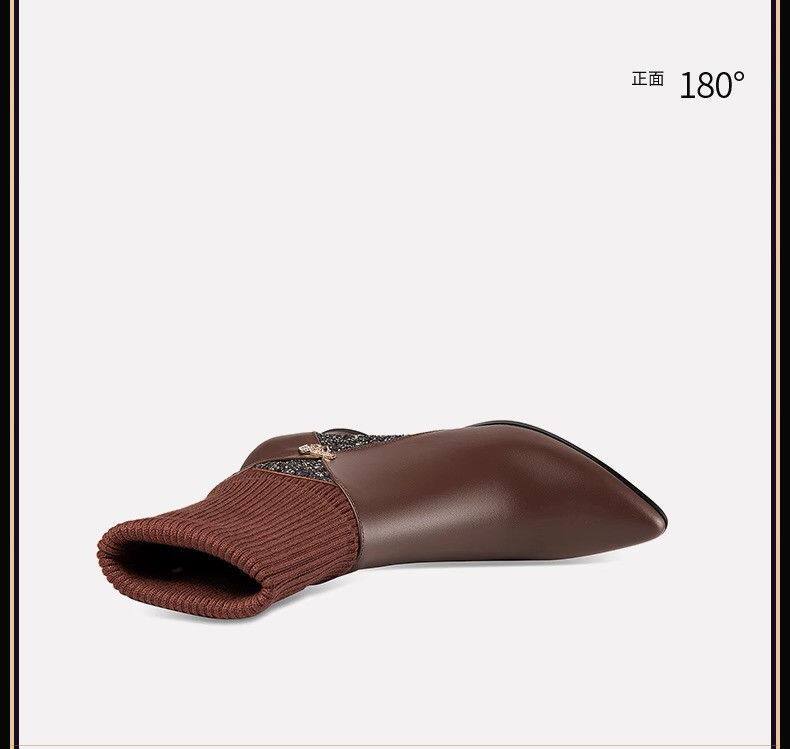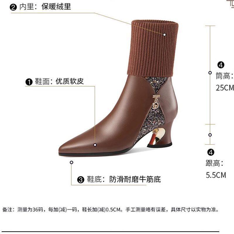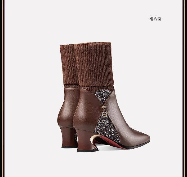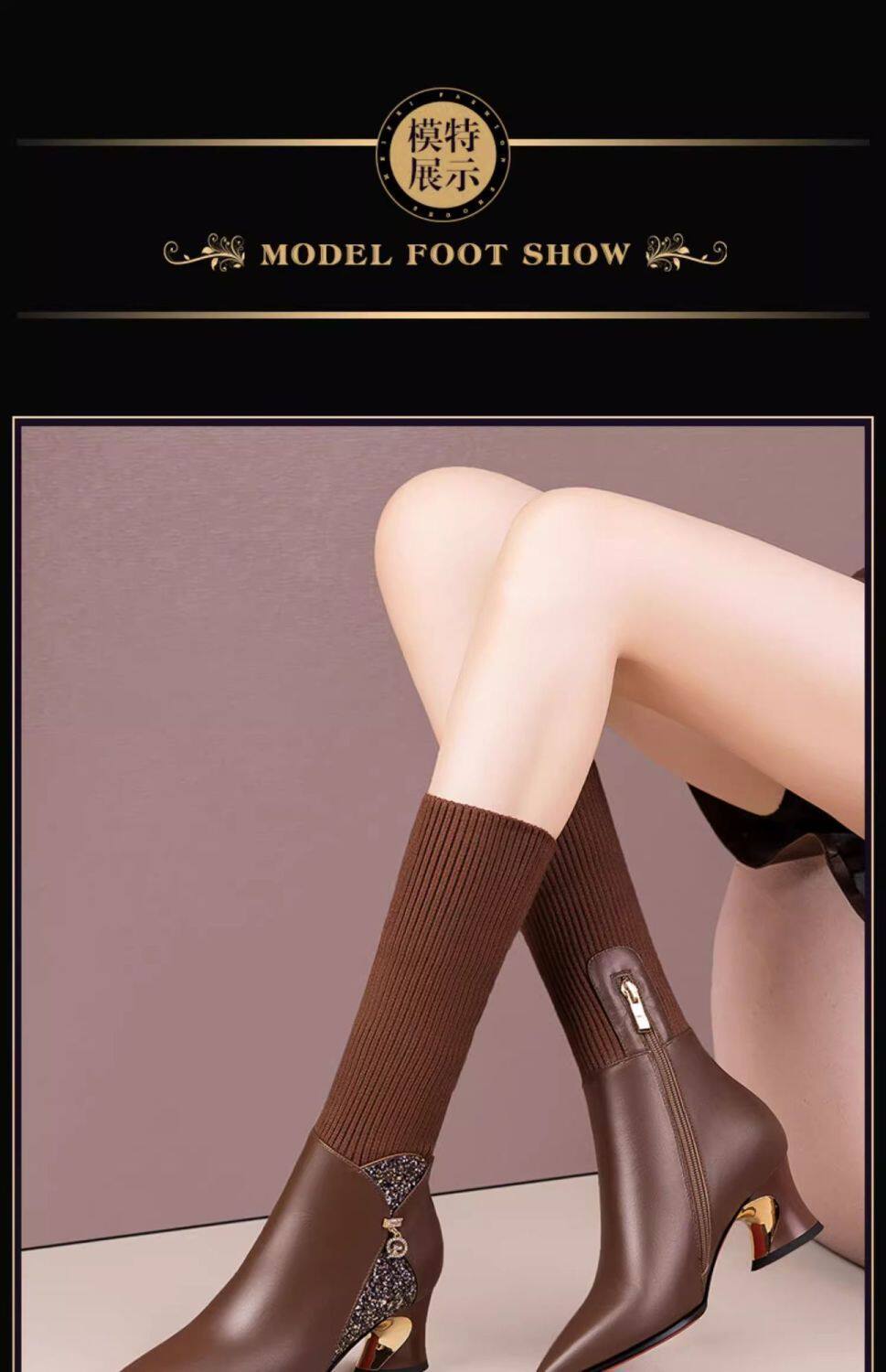 品牌特價2025秋冬新款真皮毛線靴子女中跟中筒靴粗跟棕色針織女靴