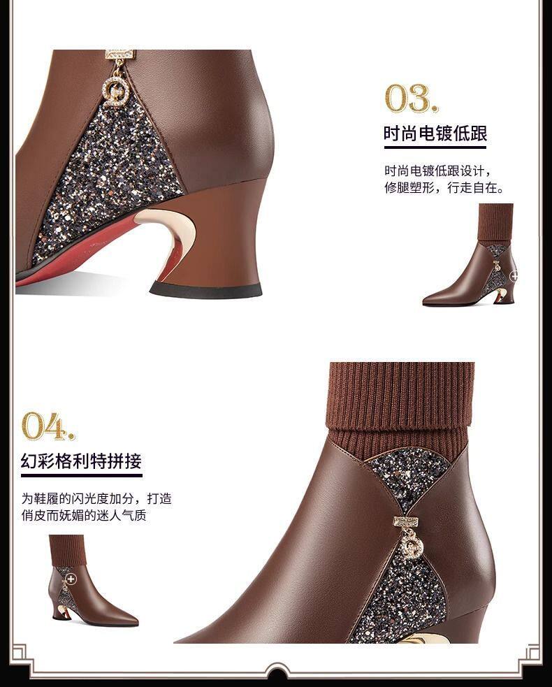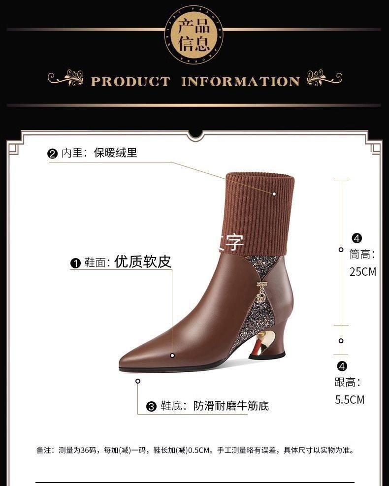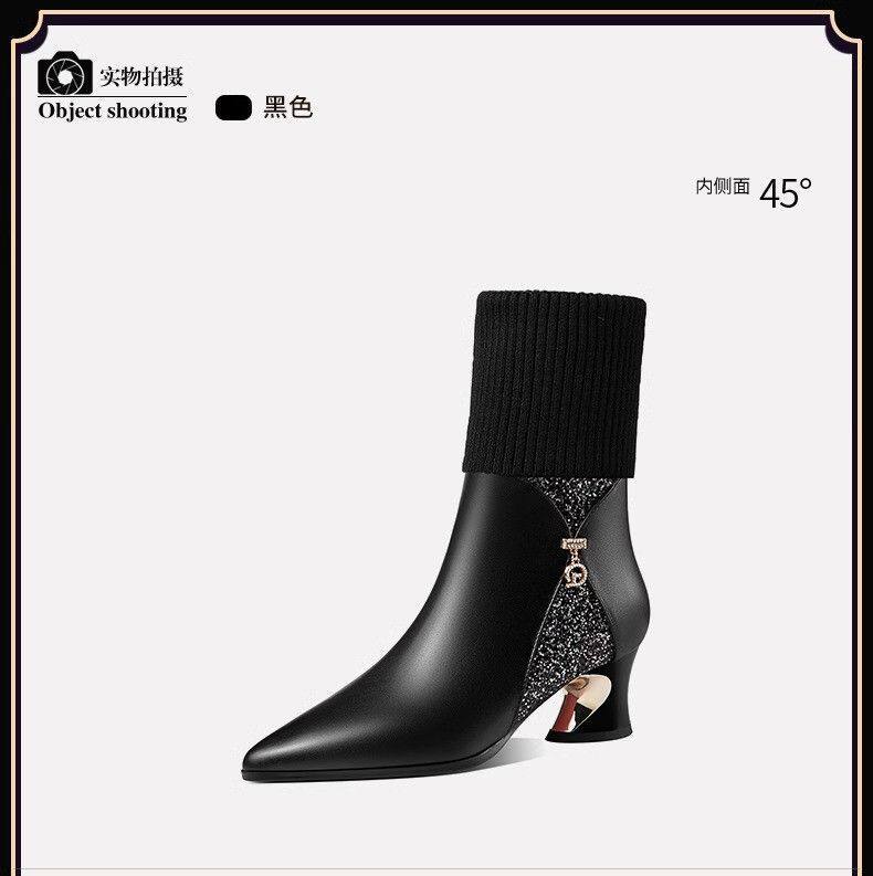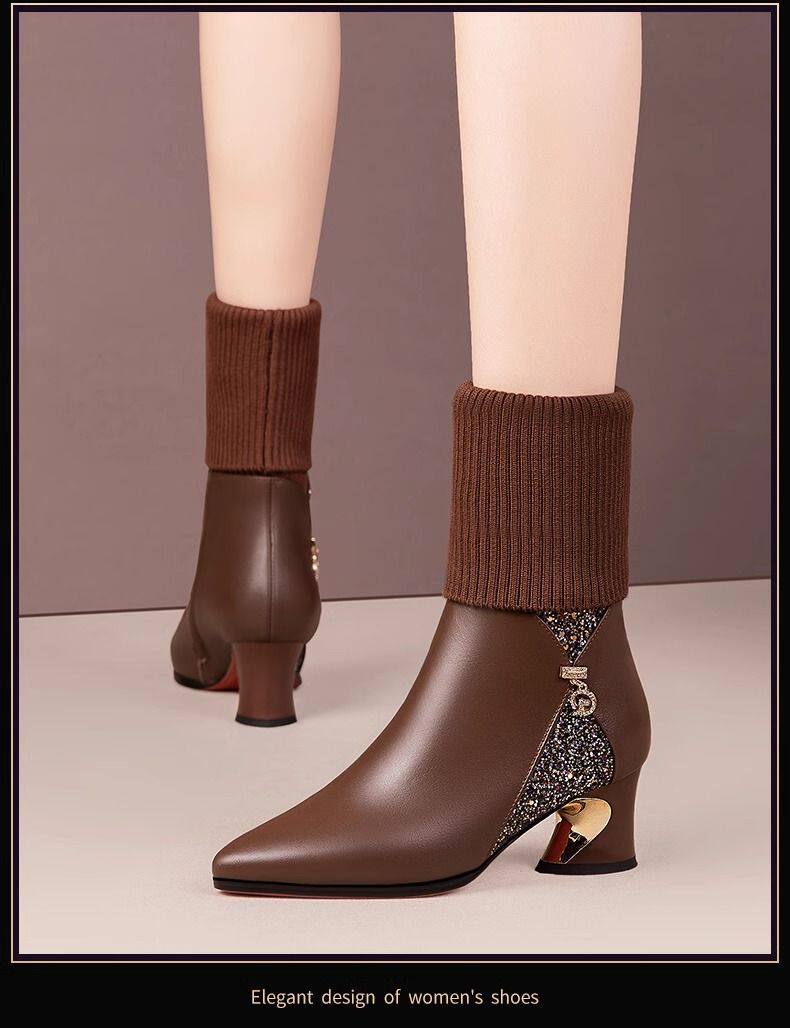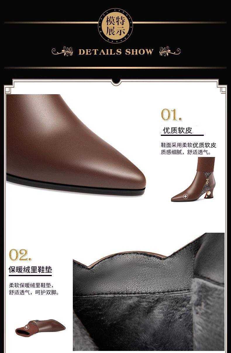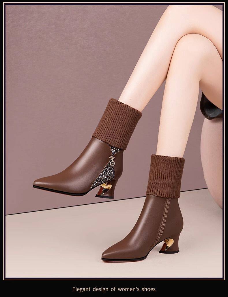 品牌特價2025秋冬新款真皮毛線靴子女中跟中筒靴粗跟棕色針織女靴