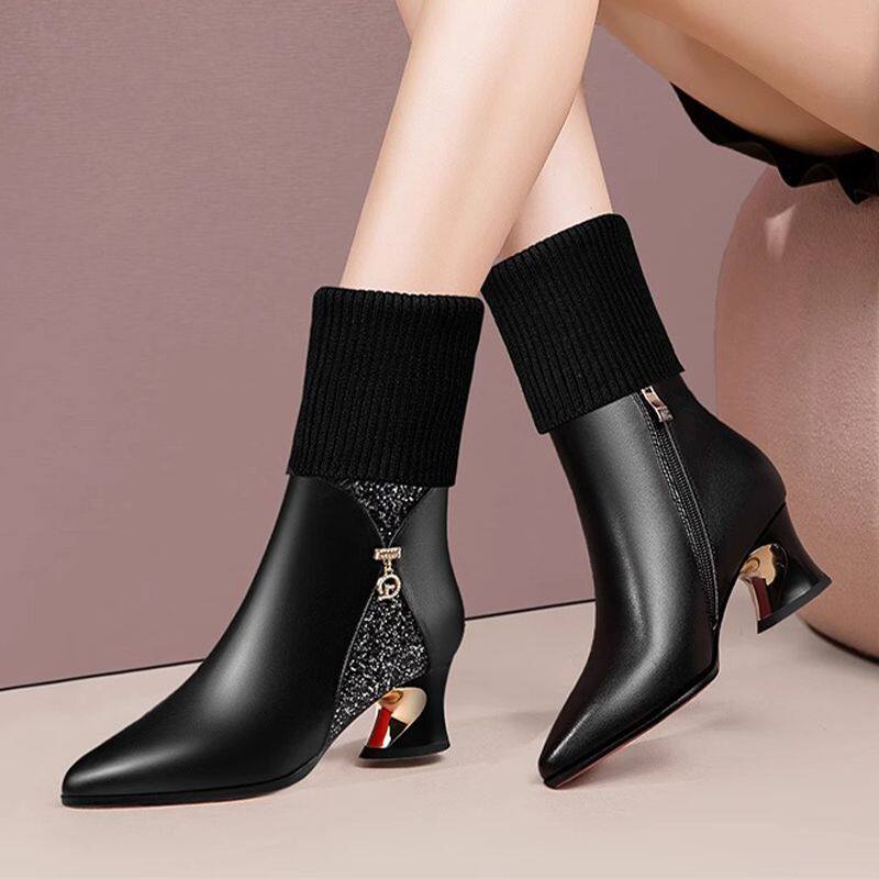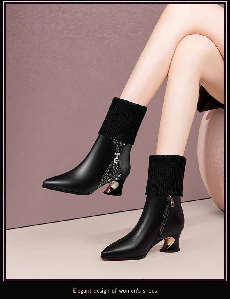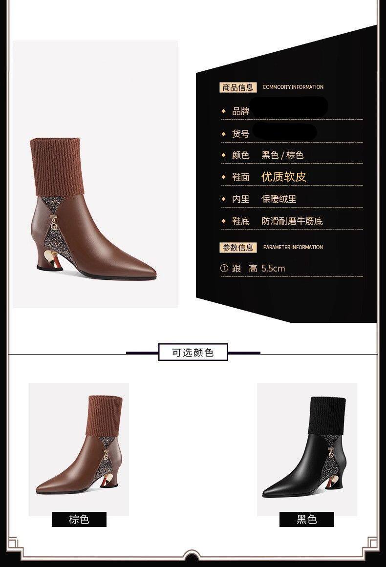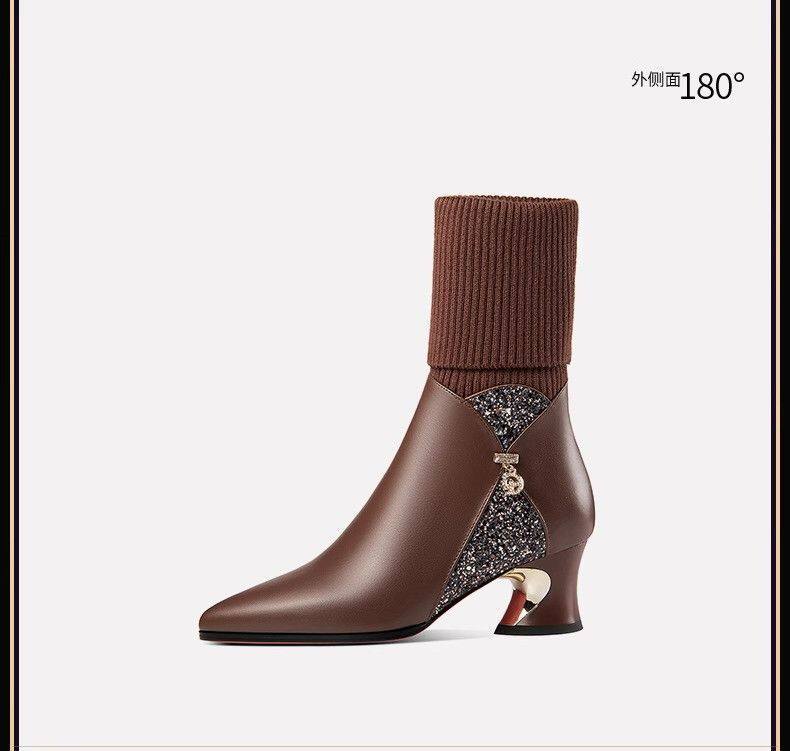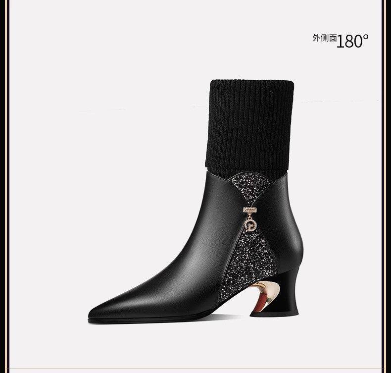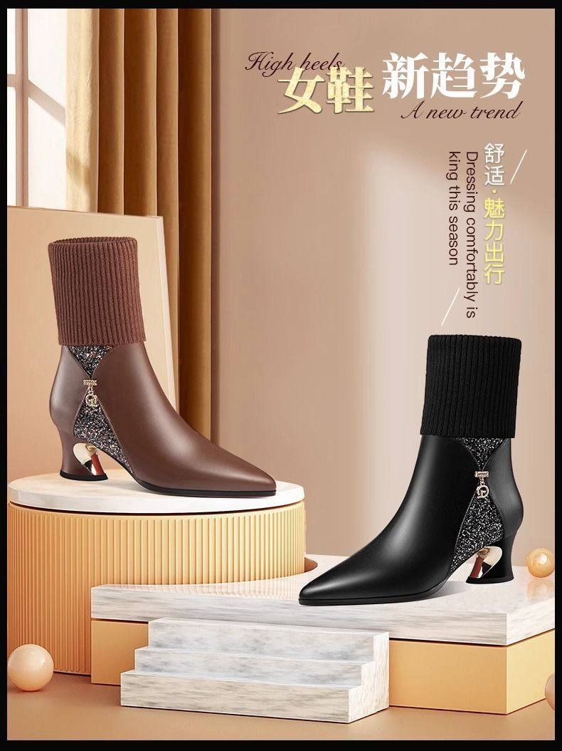 品牌特價2025秋冬新款真皮毛線靴子女中跟中筒靴粗跟棕色針織女靴