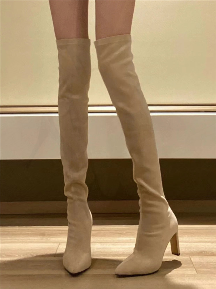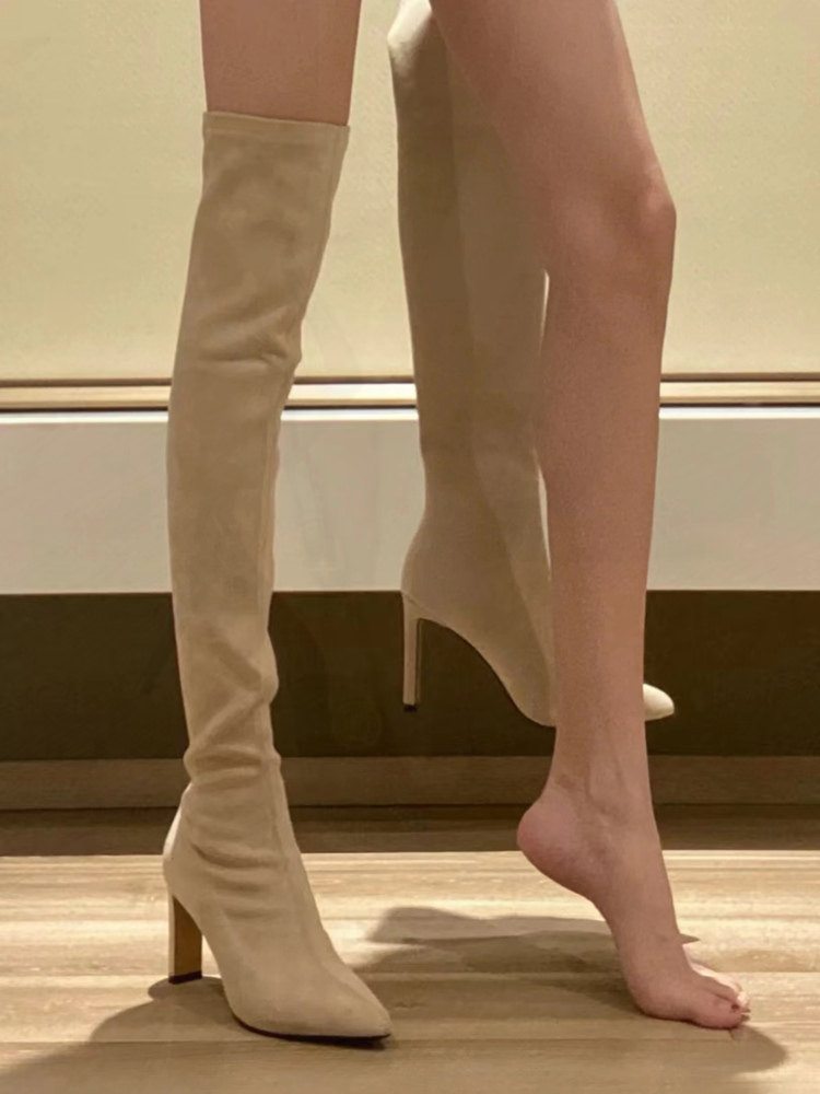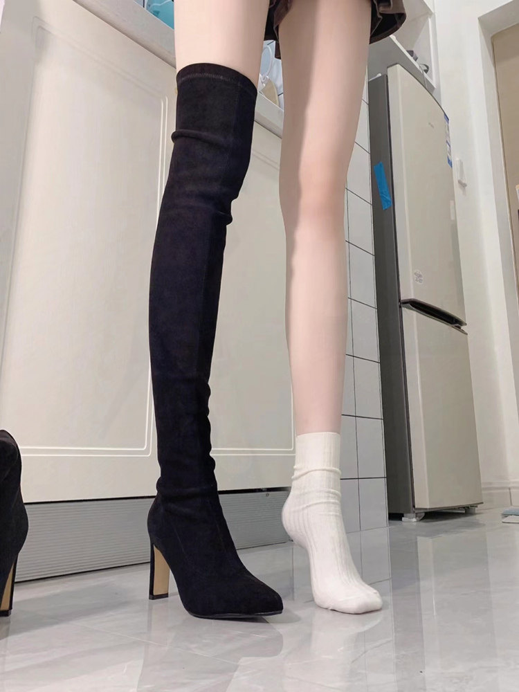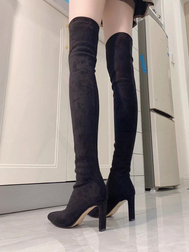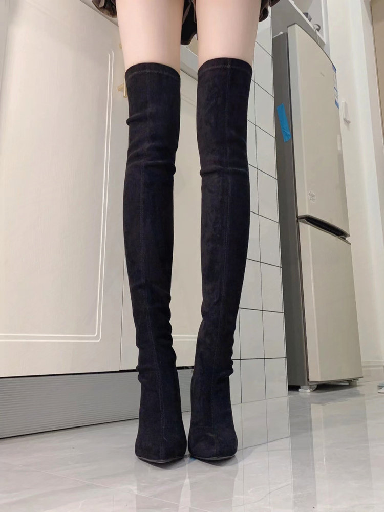 尖頭高跟長靴女2023年秋冬新款絨面粗跟過膝高筒靴襪子彈力瘦瘦靴