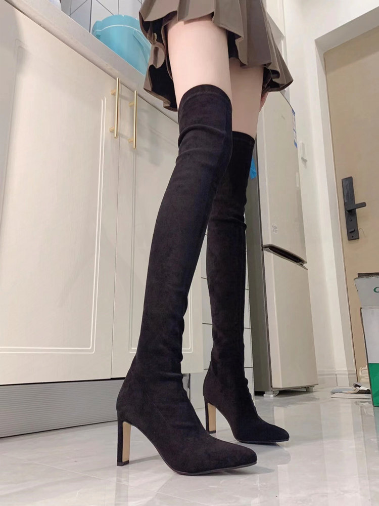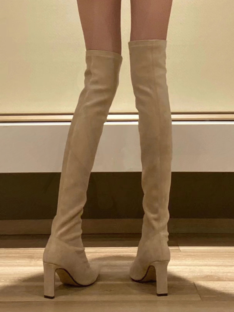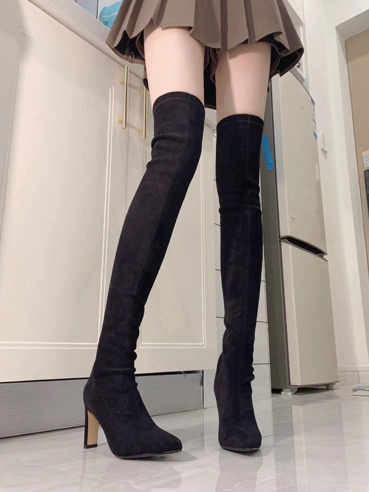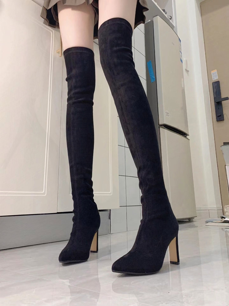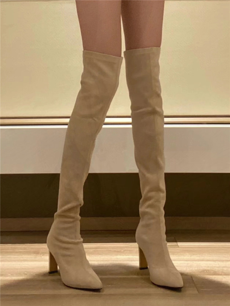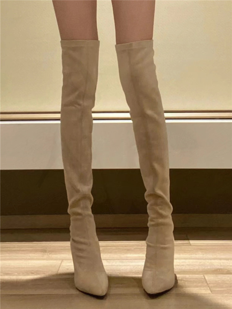 尖頭高跟長靴女2023年秋冬新款絨面粗跟過膝高筒靴襪子彈力瘦瘦靴