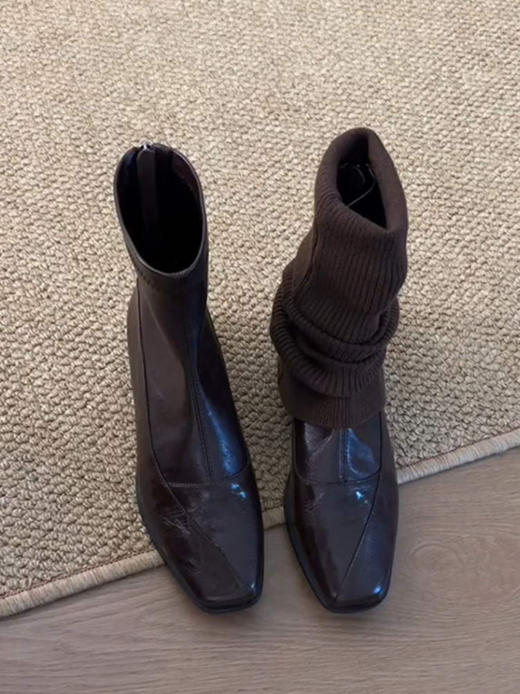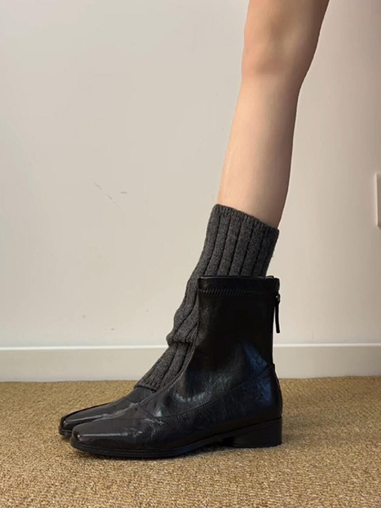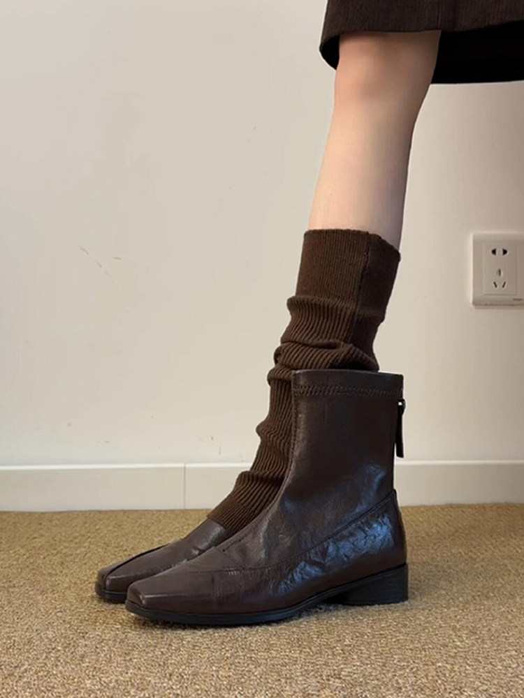 羊皮版~真皮氣質方頭低跟瘦瘦靴女復古通勤百搭後拉鍊短靴馬丁靴
