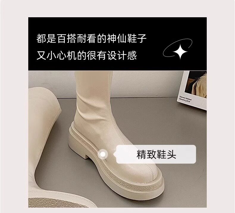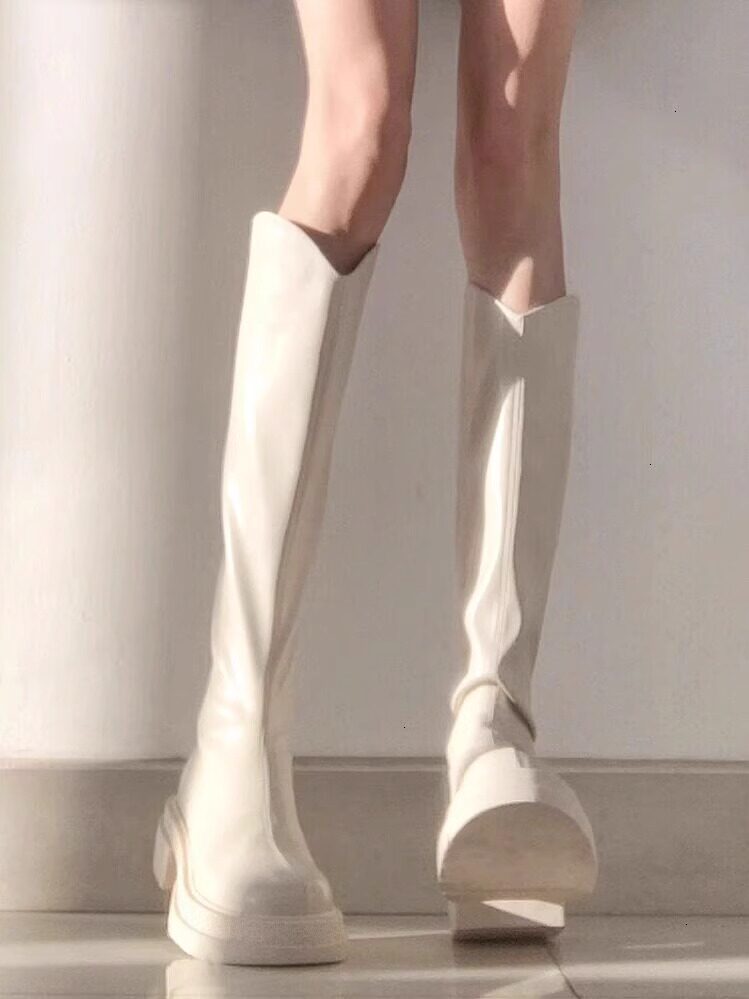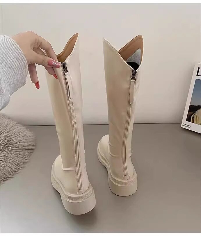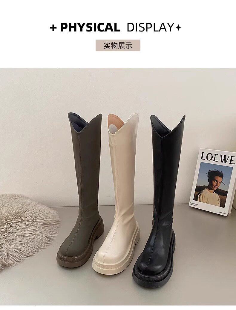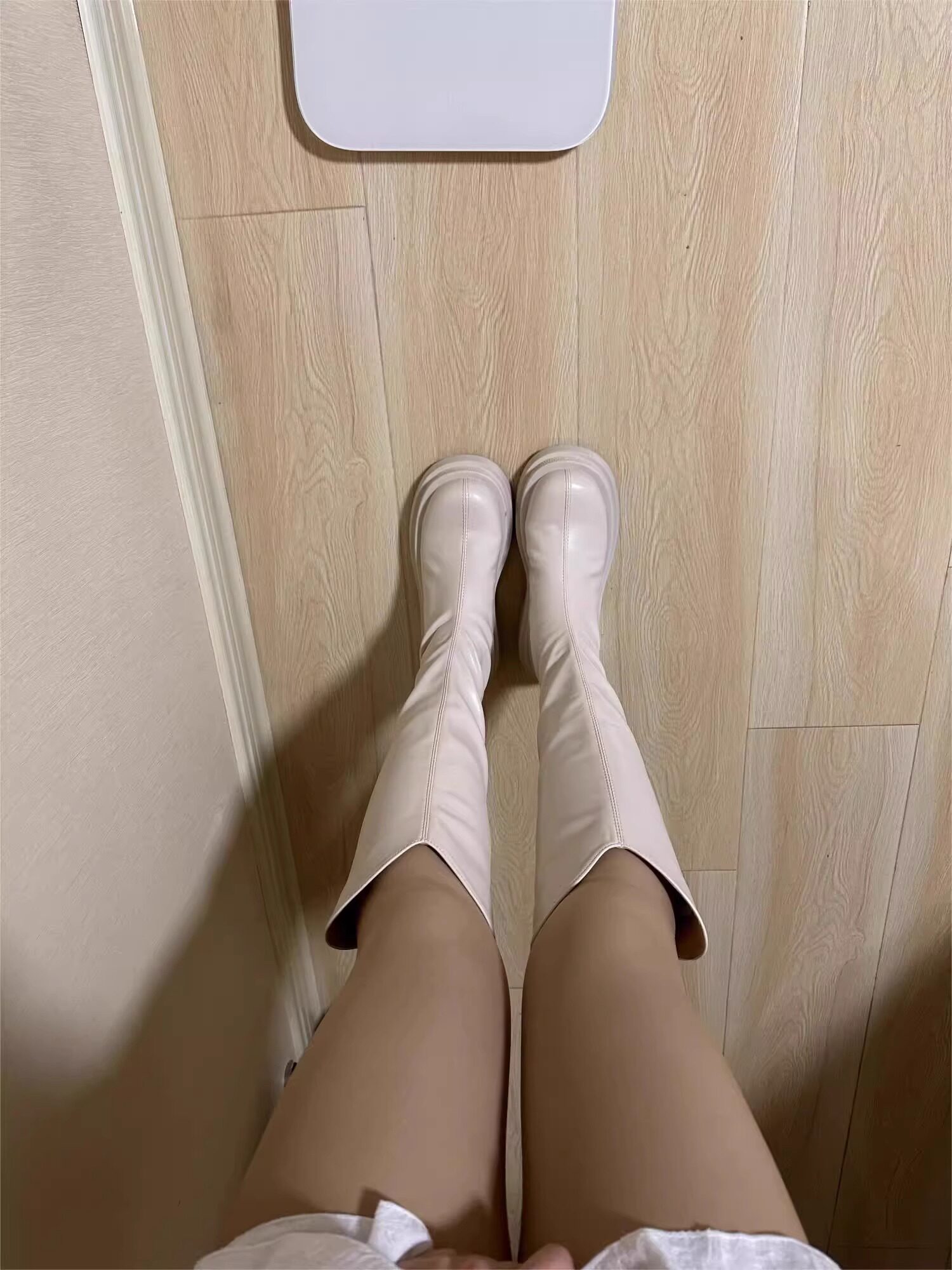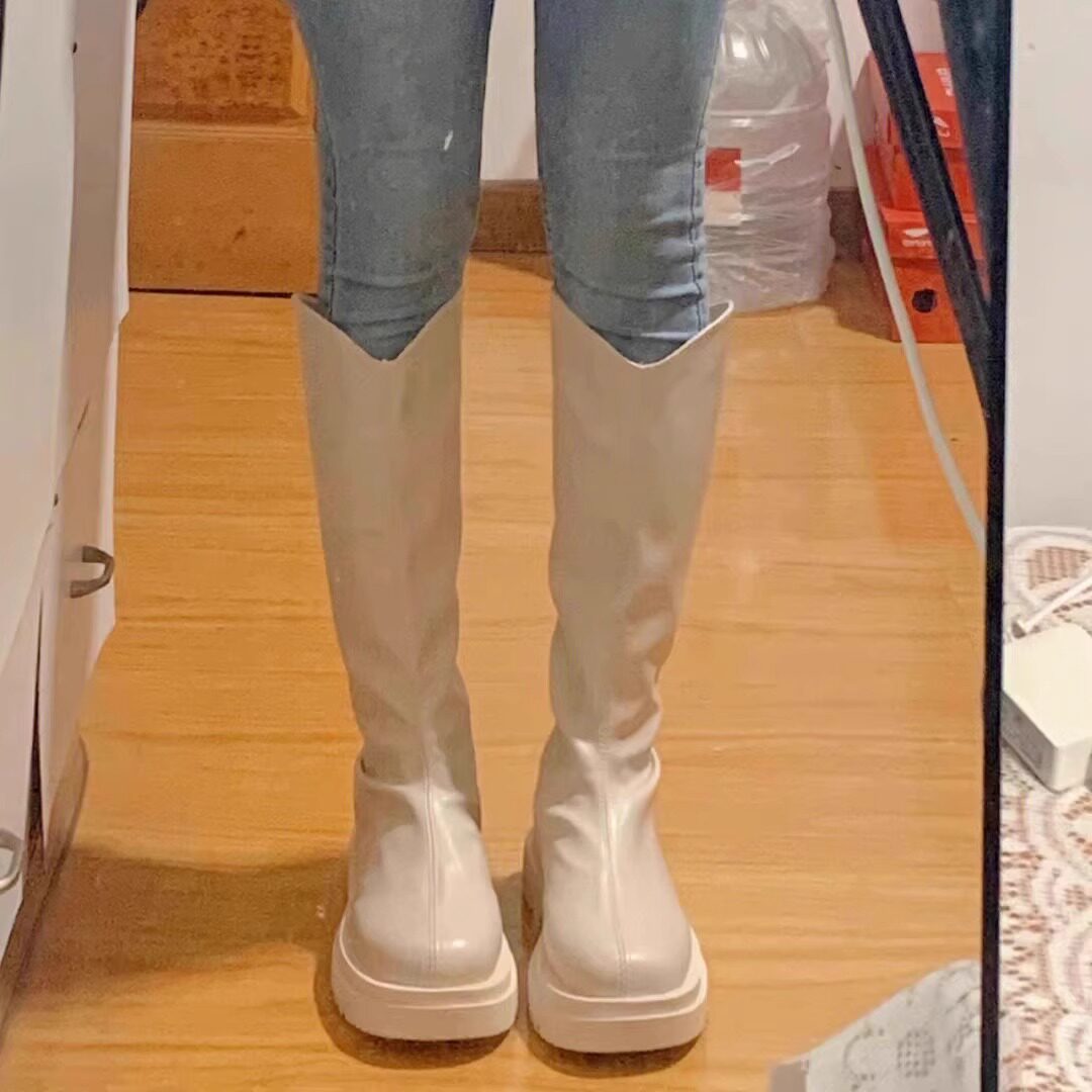 白色v口長筒靴女秋冬季奶茶色高筒靴小個子厚底彈力瘦瘦騎士長靴