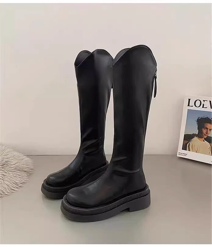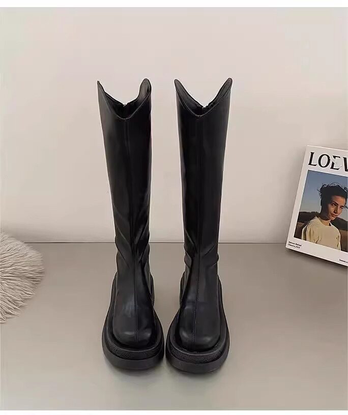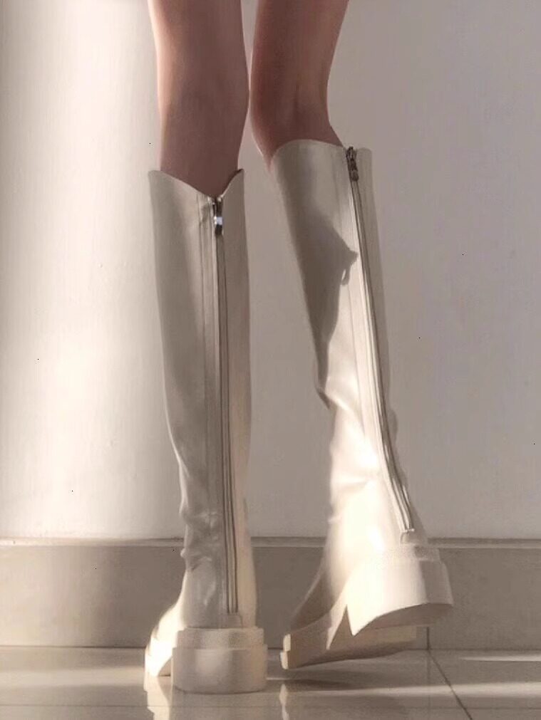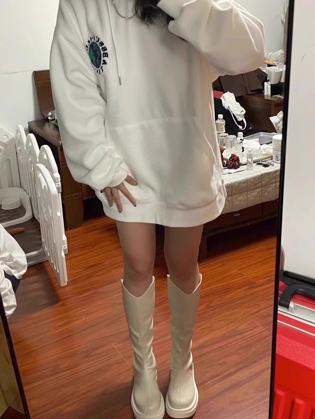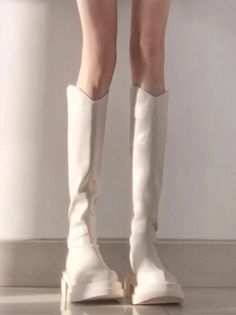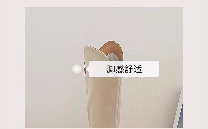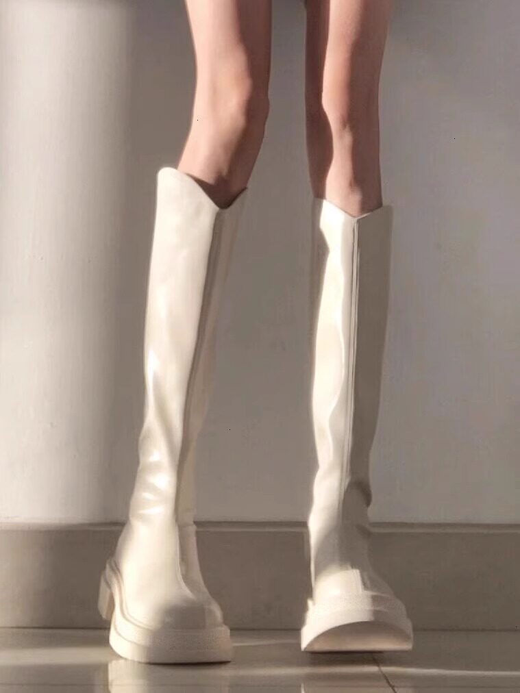 白色v口長筒靴女秋冬季奶茶色高筒靴小個子厚底彈力瘦瘦騎士長靴
