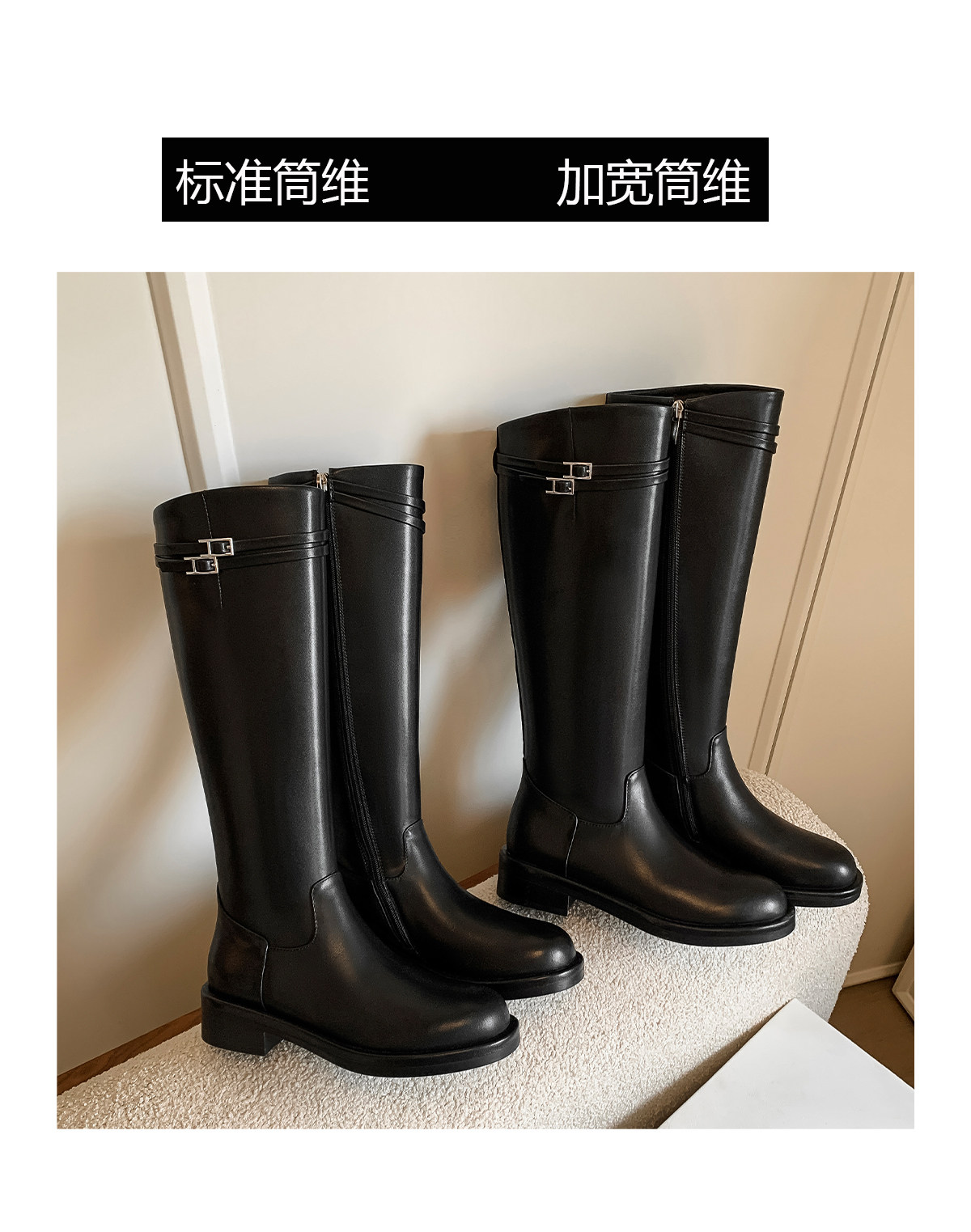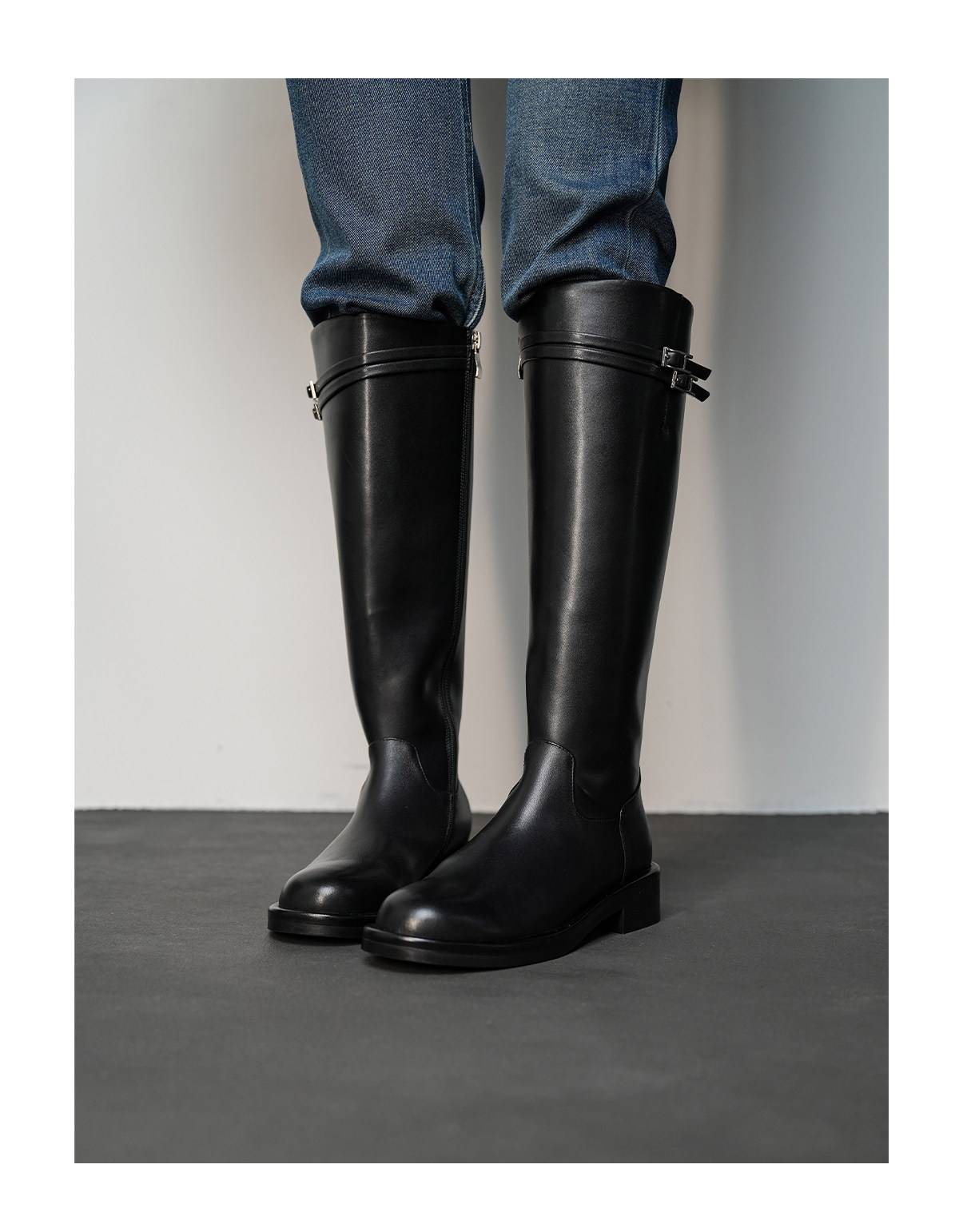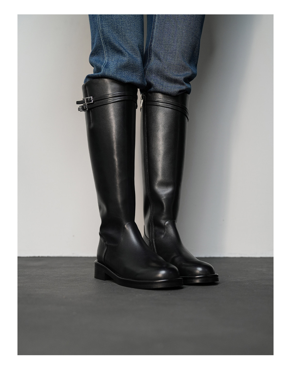 Fermina 秋季顯瘦長靴不過膝騎士靴女低跟長筒靴皮帶釦機車靴高筒