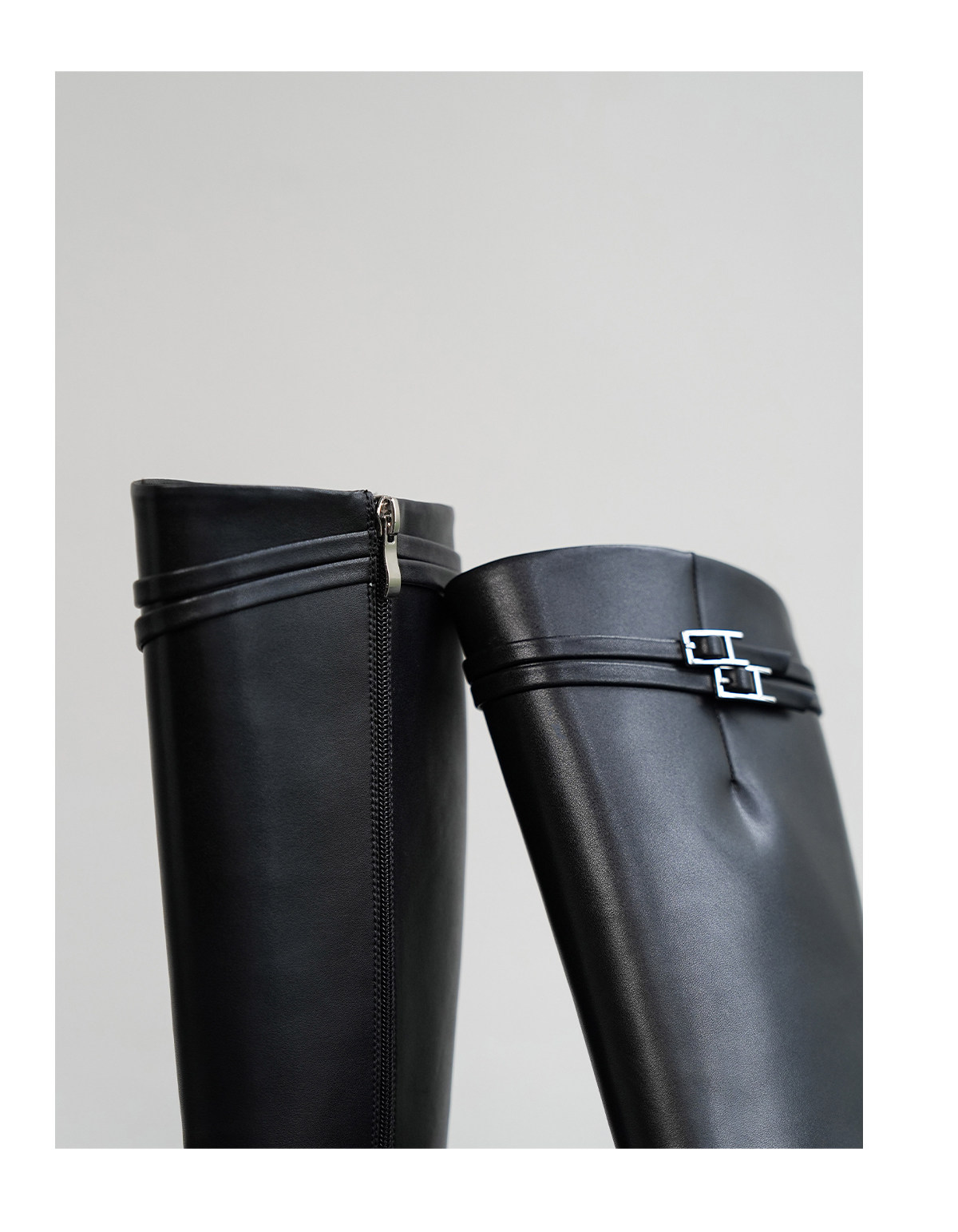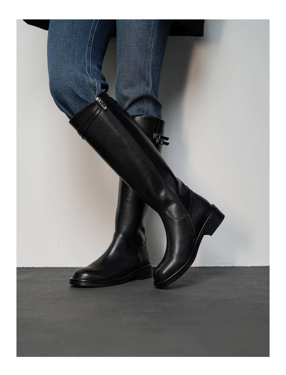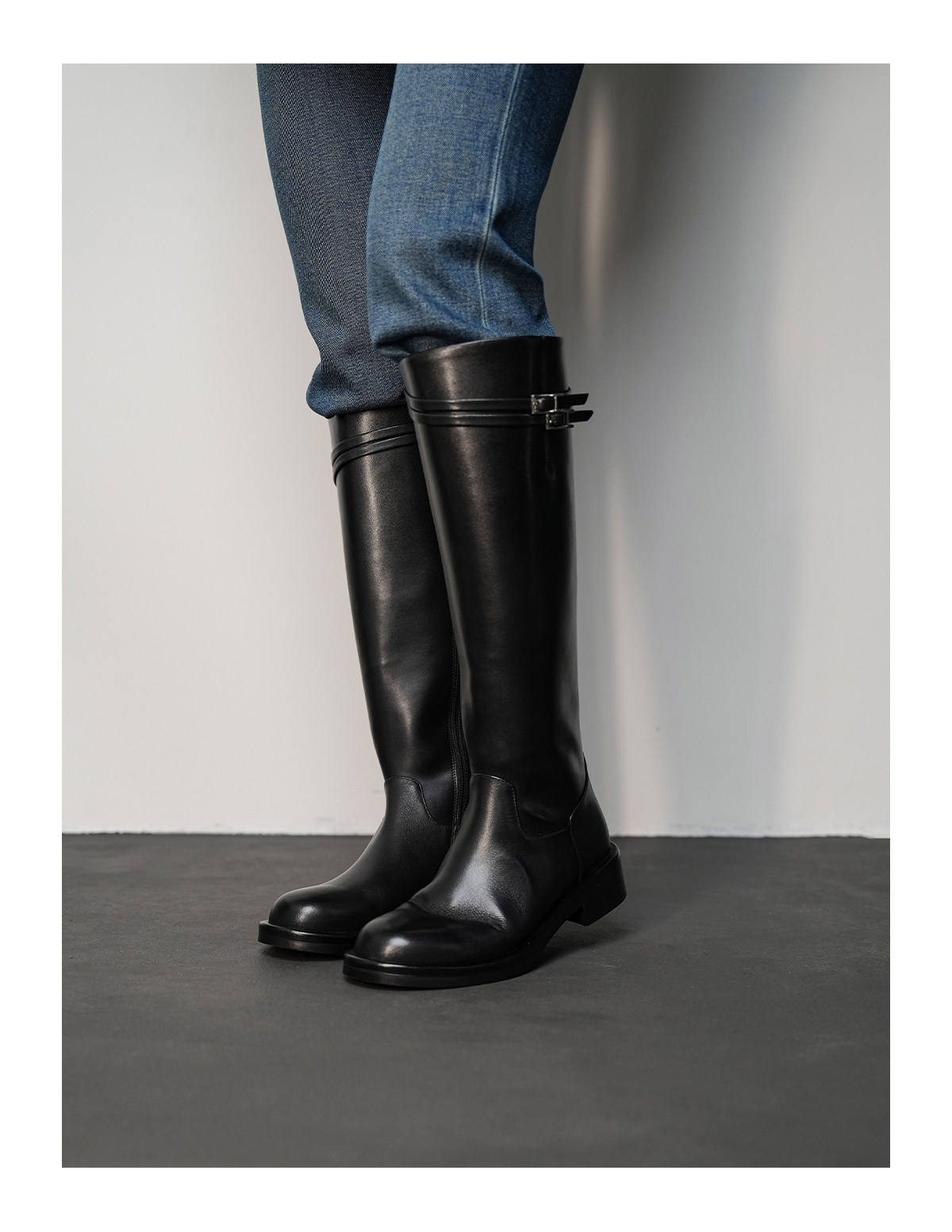 Fermina 秋季顯瘦長靴不過膝騎士靴女低跟長筒靴皮帶釦機車靴高筒
