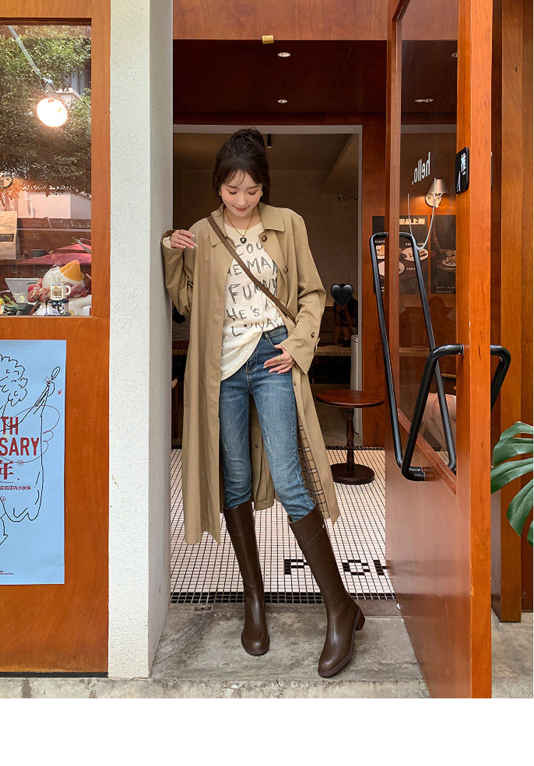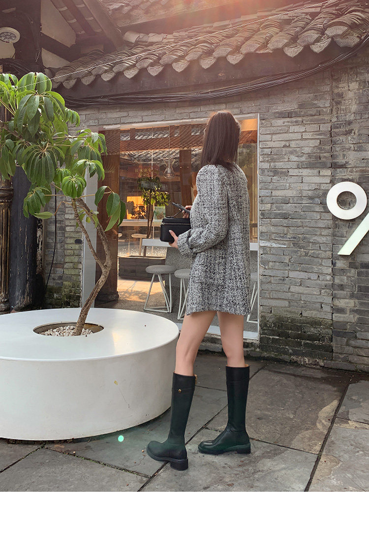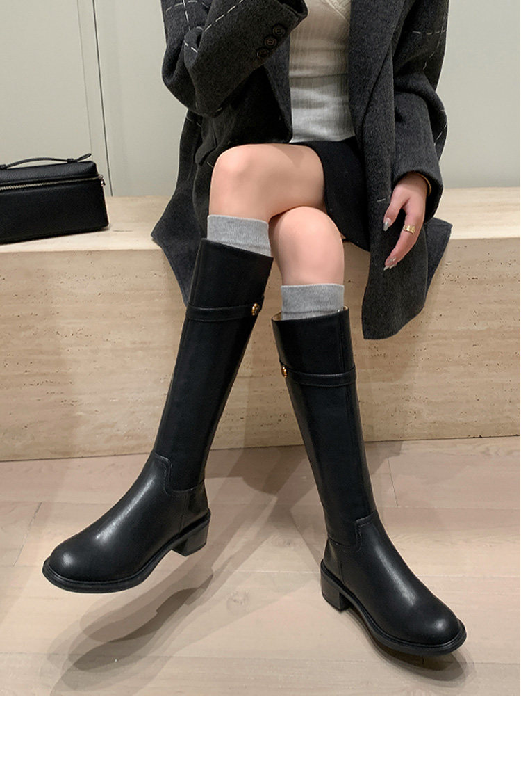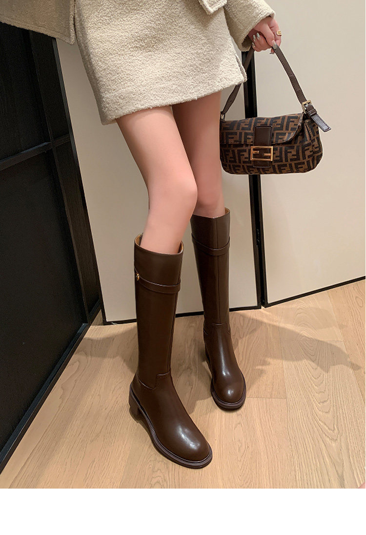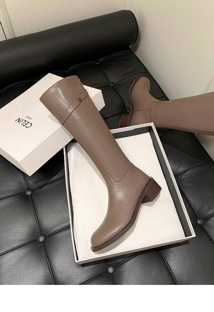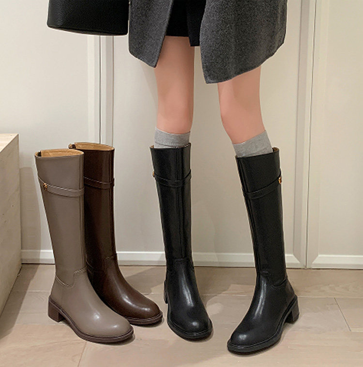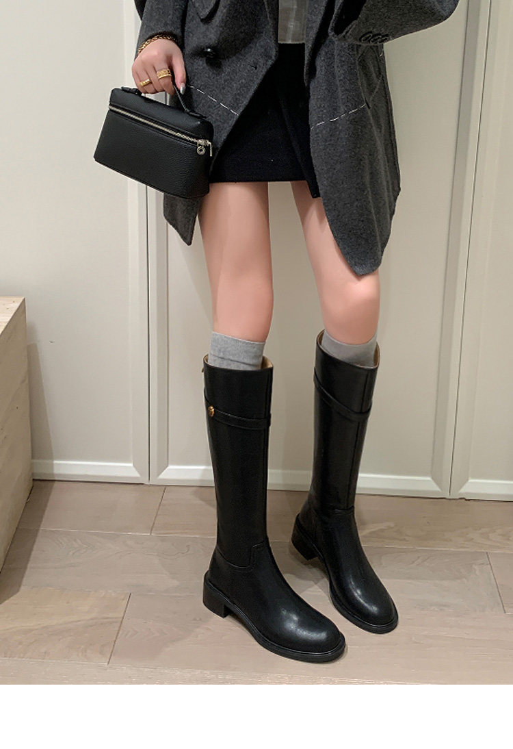 法式2025冬季新款圓頭粗跟真皮長靴不過膝高筒靴騎士靴長筒靴子女