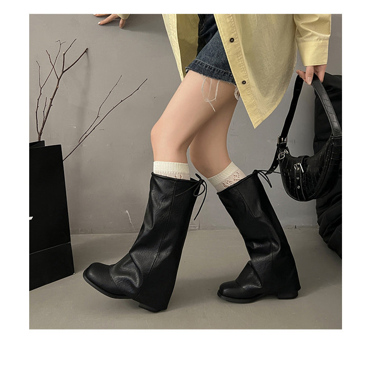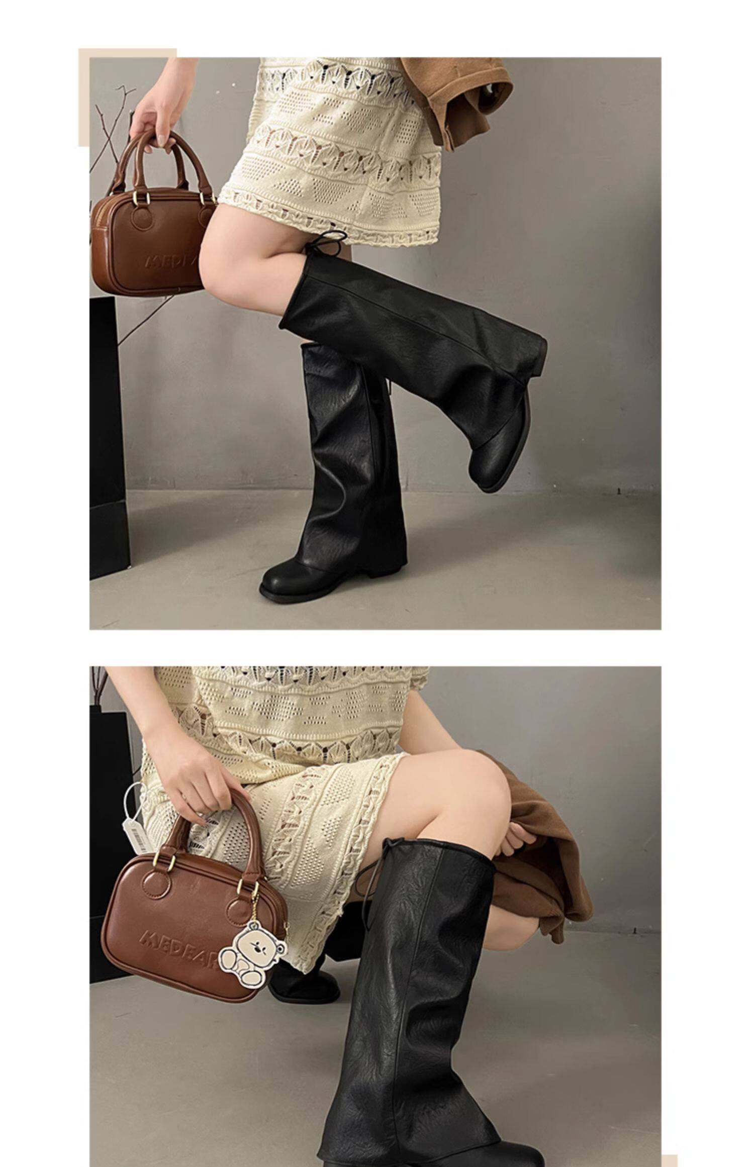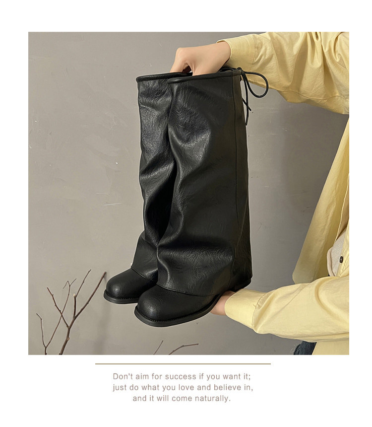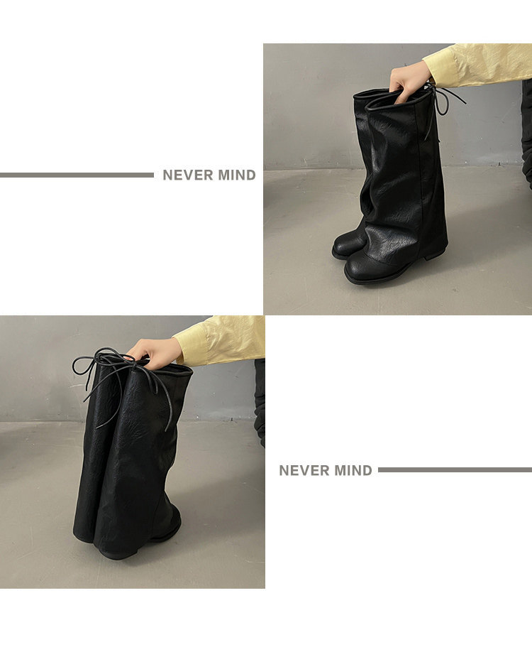 方頭粗跟長筒靴子女顯瘦大筒圍褶皺堆堆褲琯長靴不過膝高筒騎士靴