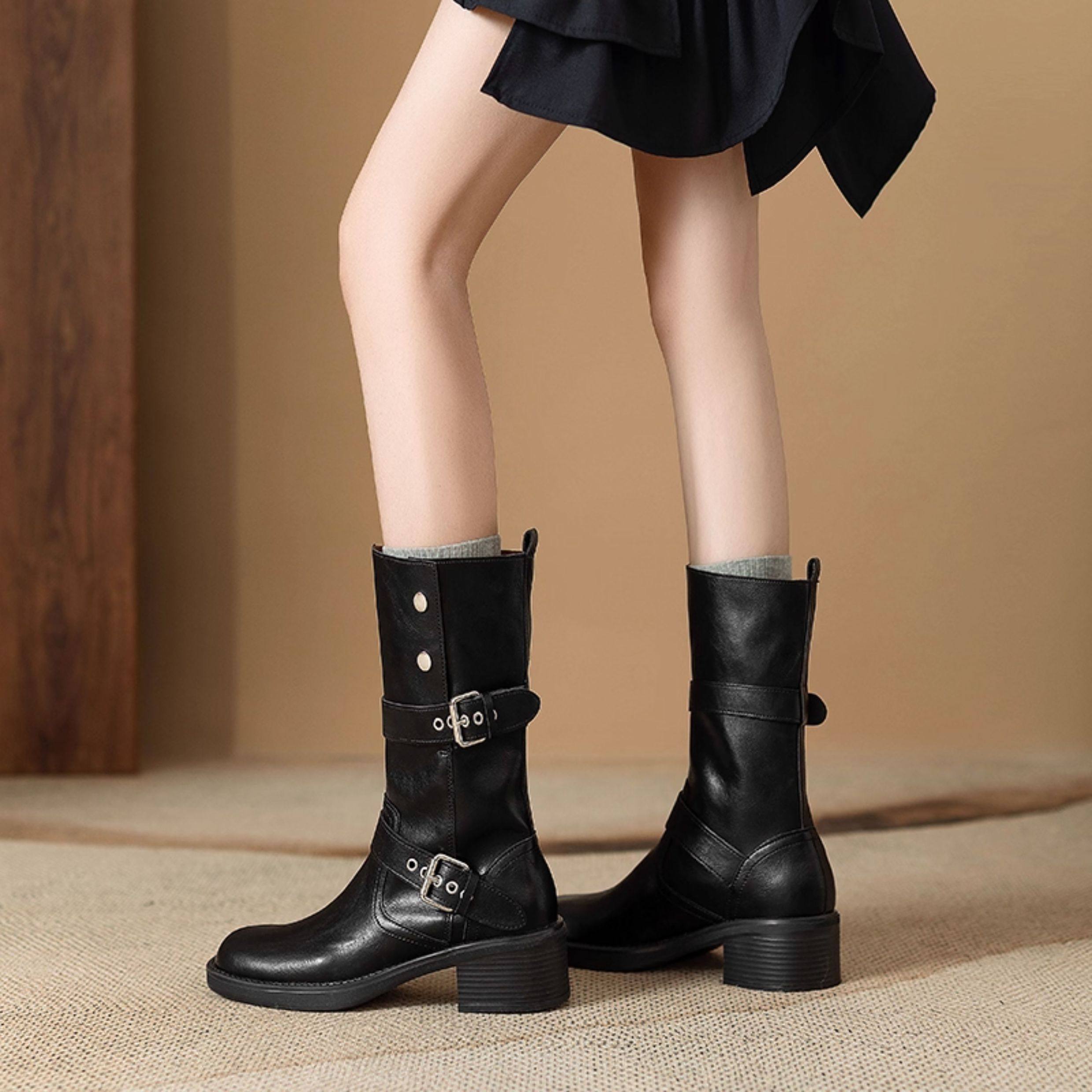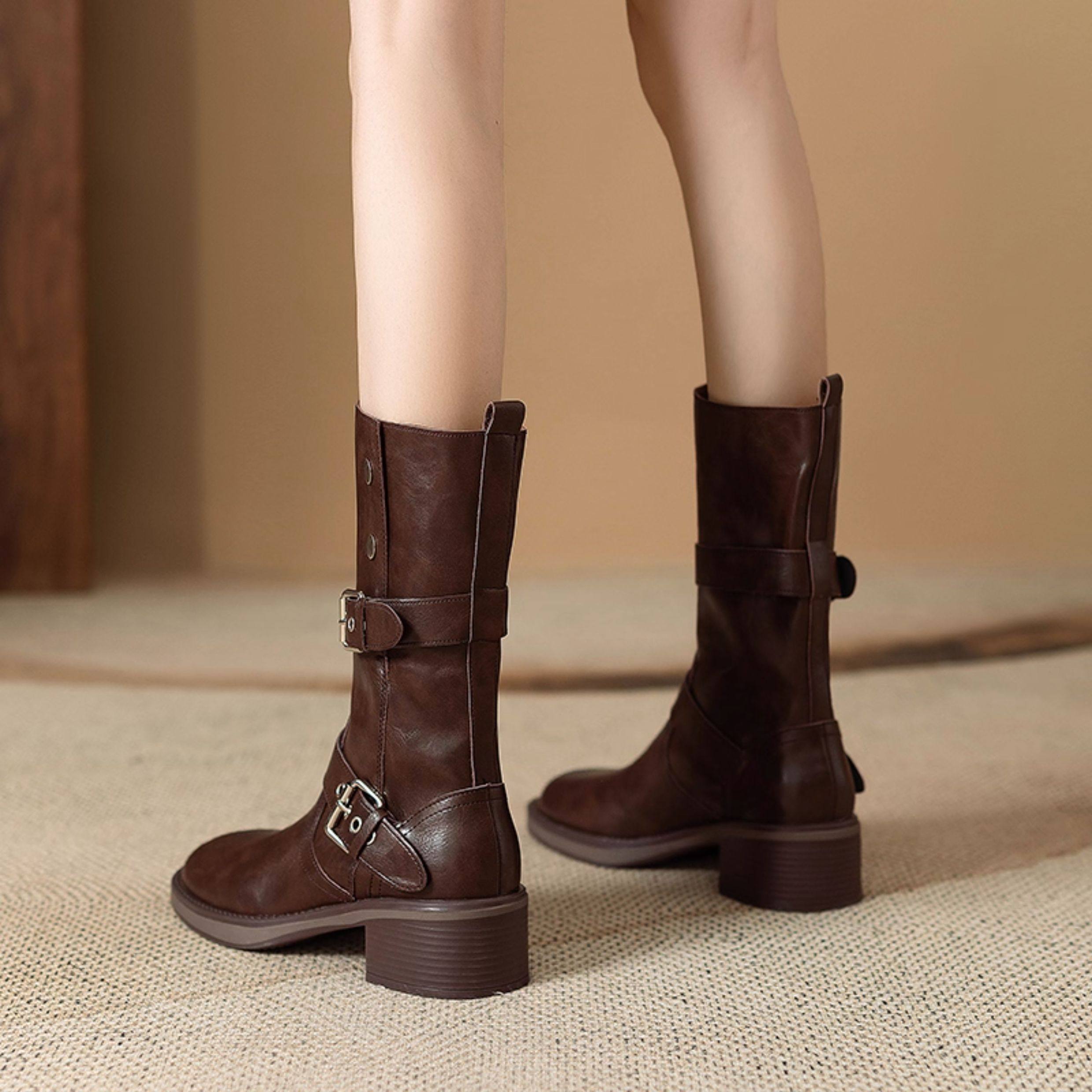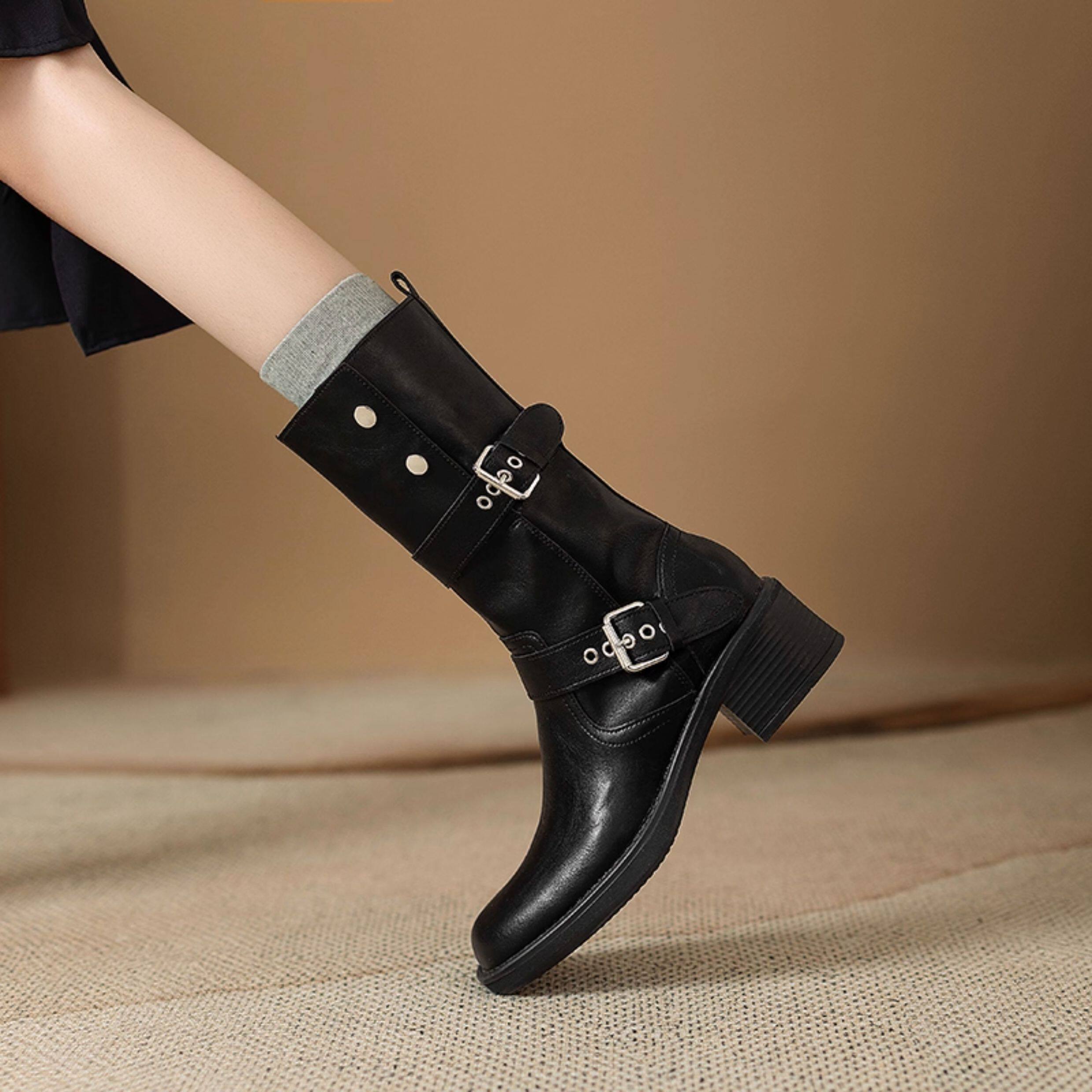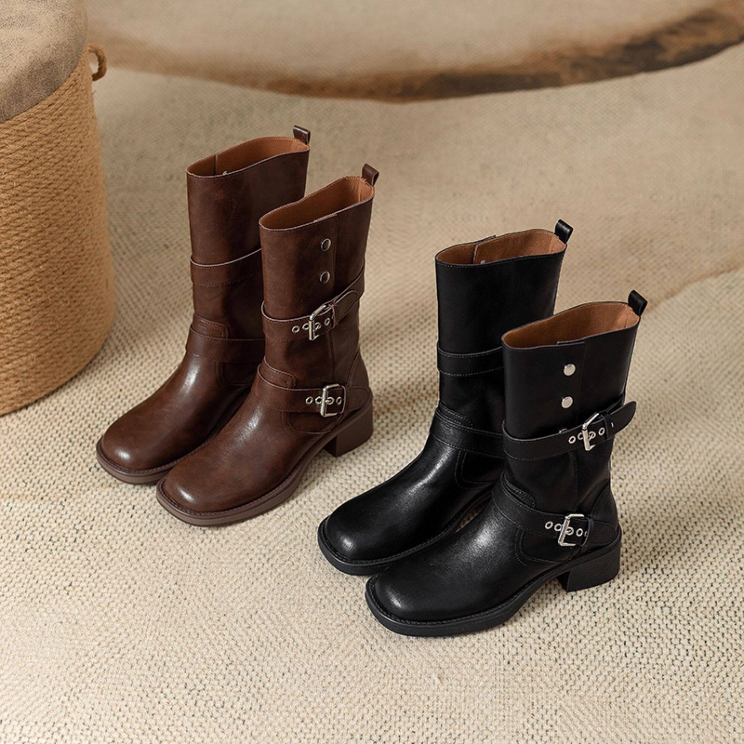 閉眼入秋冬新款復古皮帶釦西部騎士靴鉚釘厚底真皮粗跟中筒馬丁靴