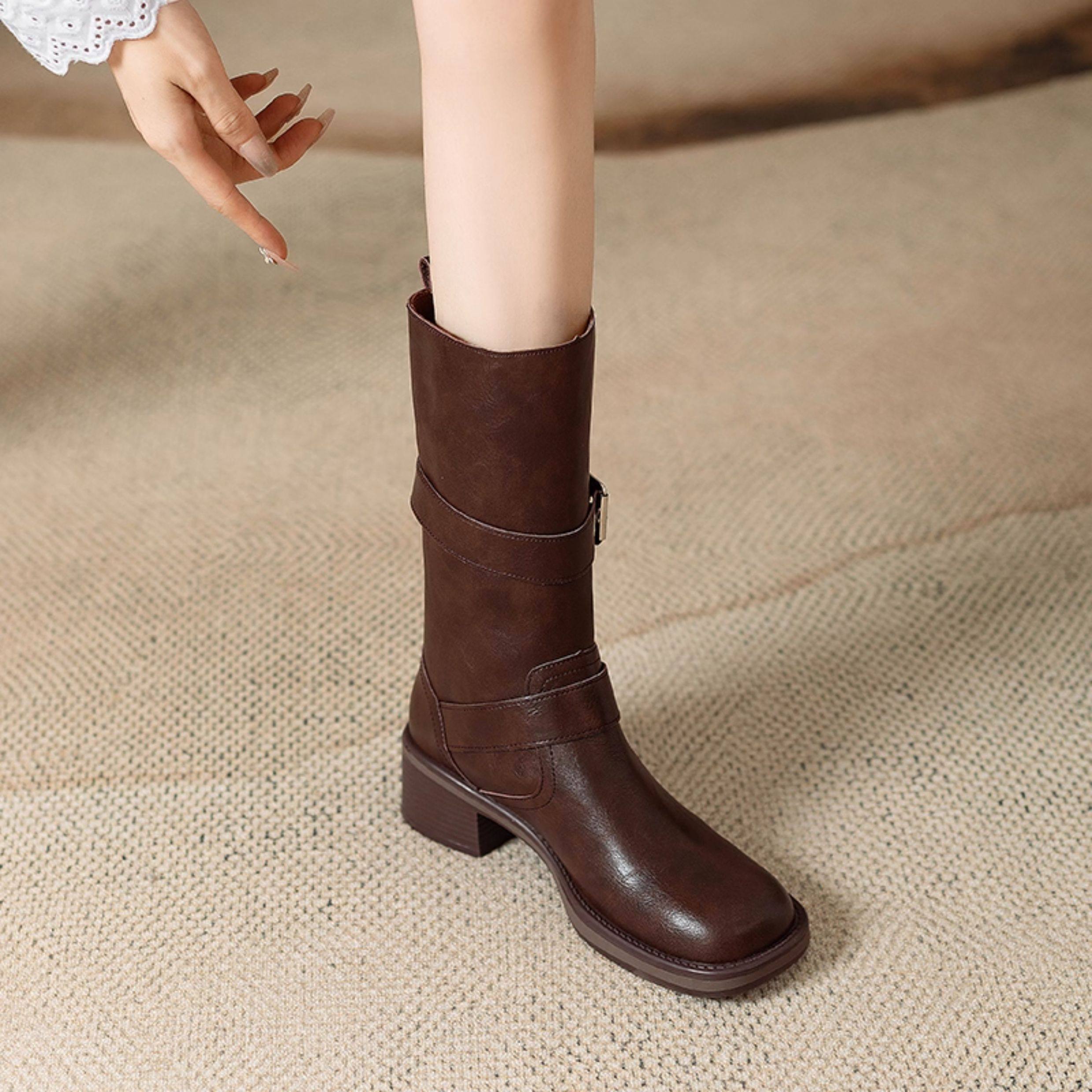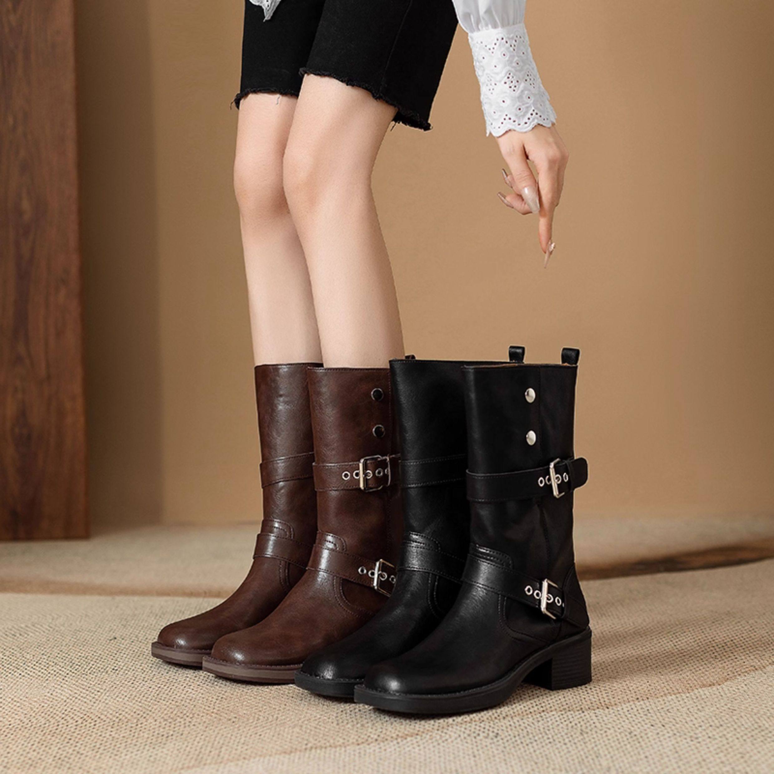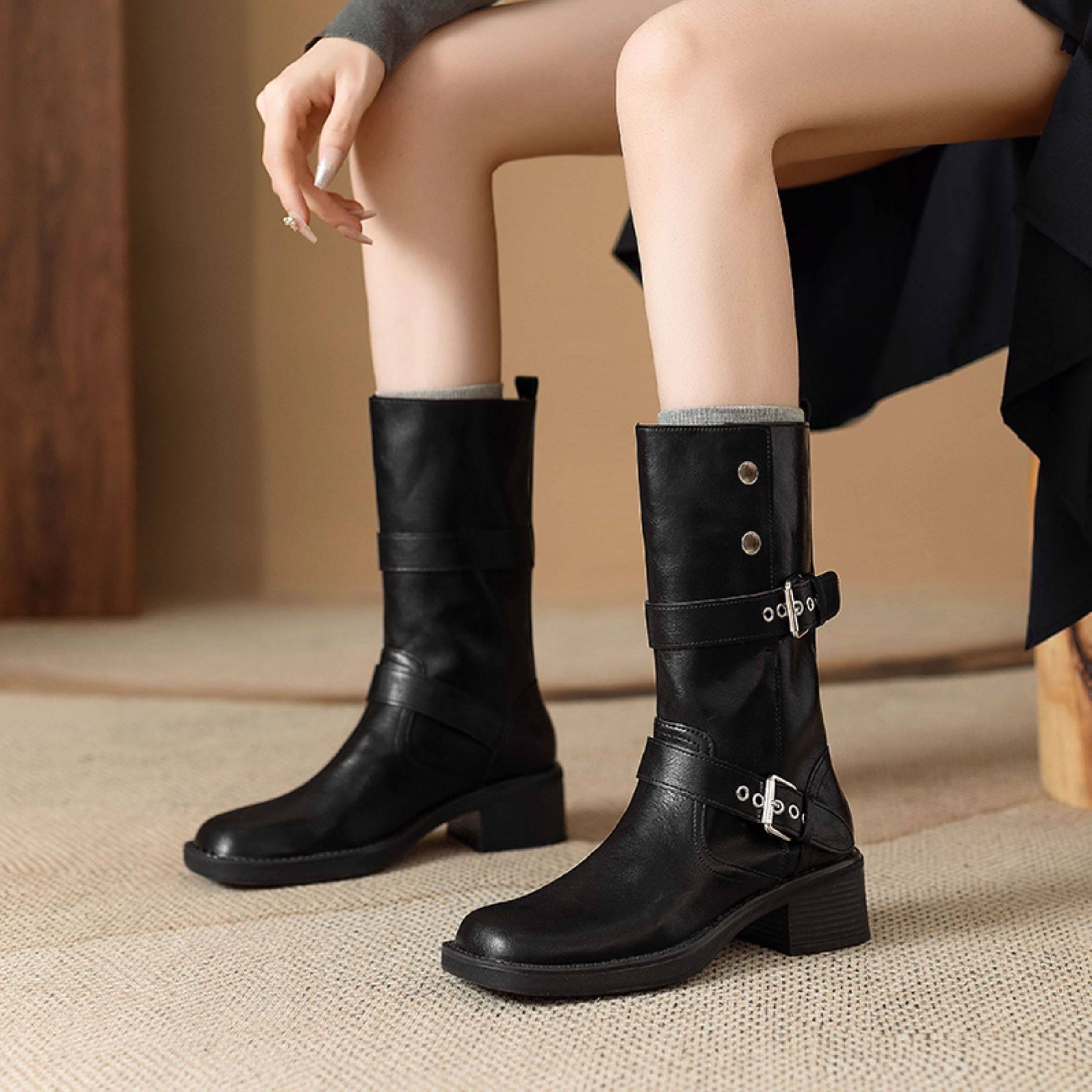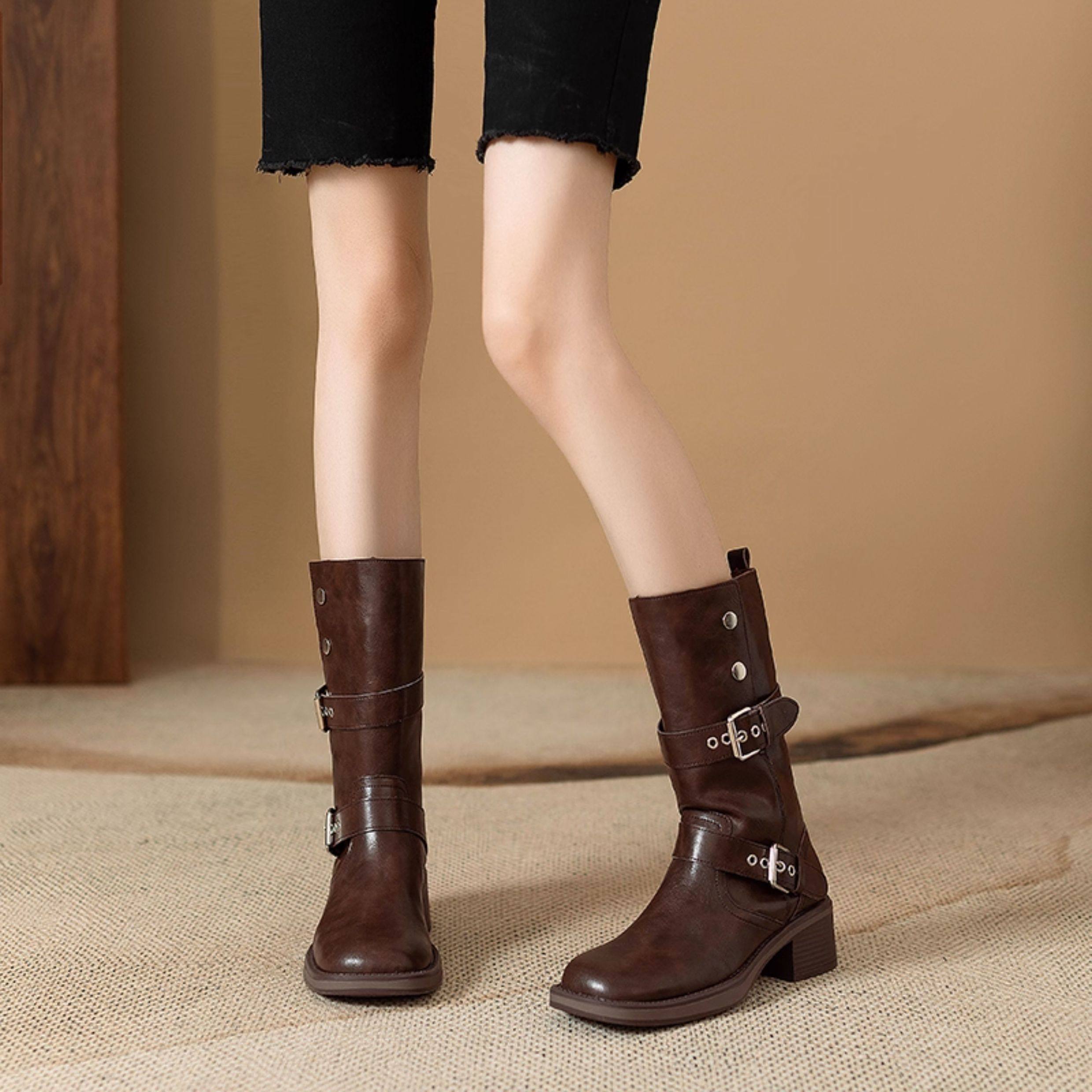 閉眼入秋冬新款復古皮帶釦西部騎士靴鉚釘厚底真皮粗跟中筒馬丁靴