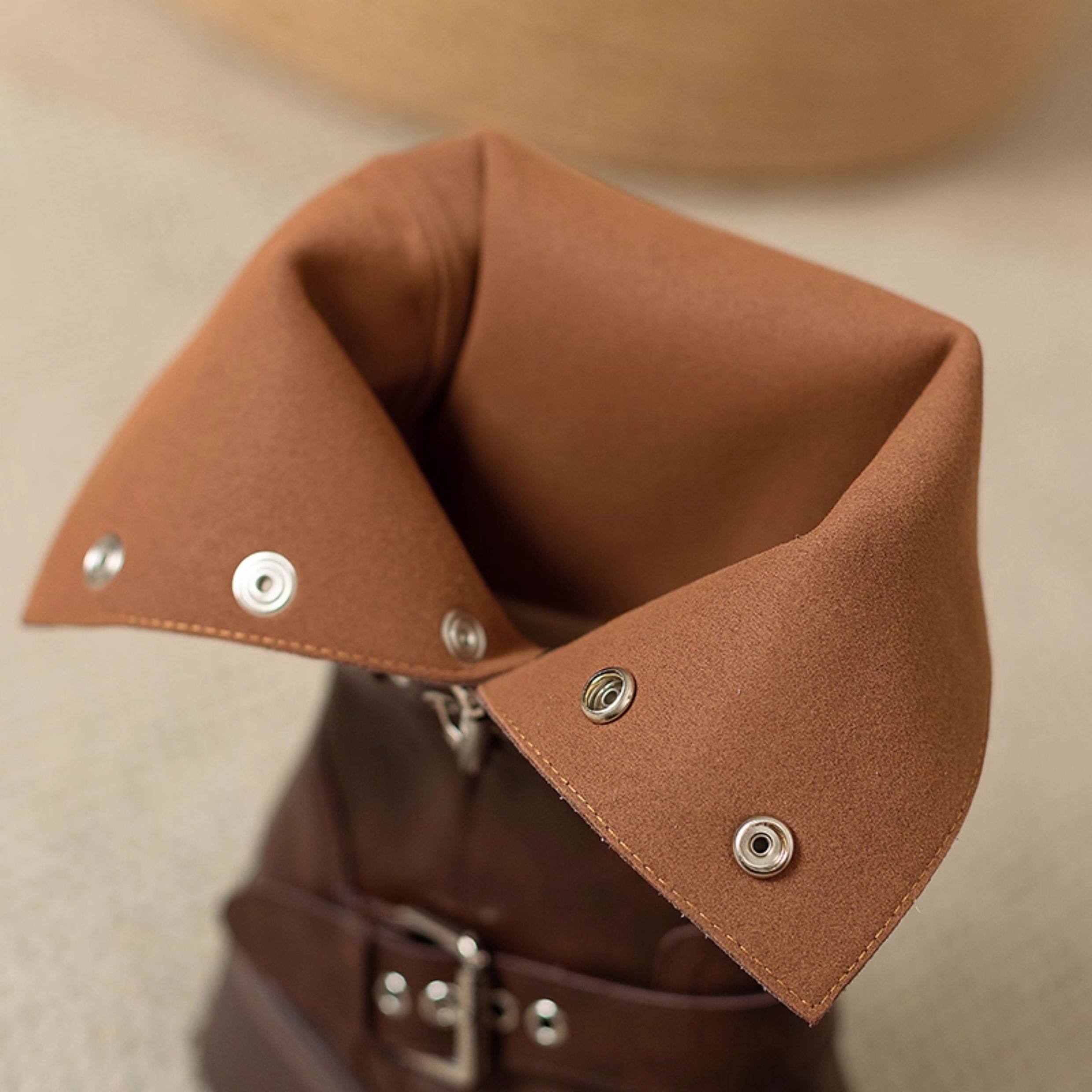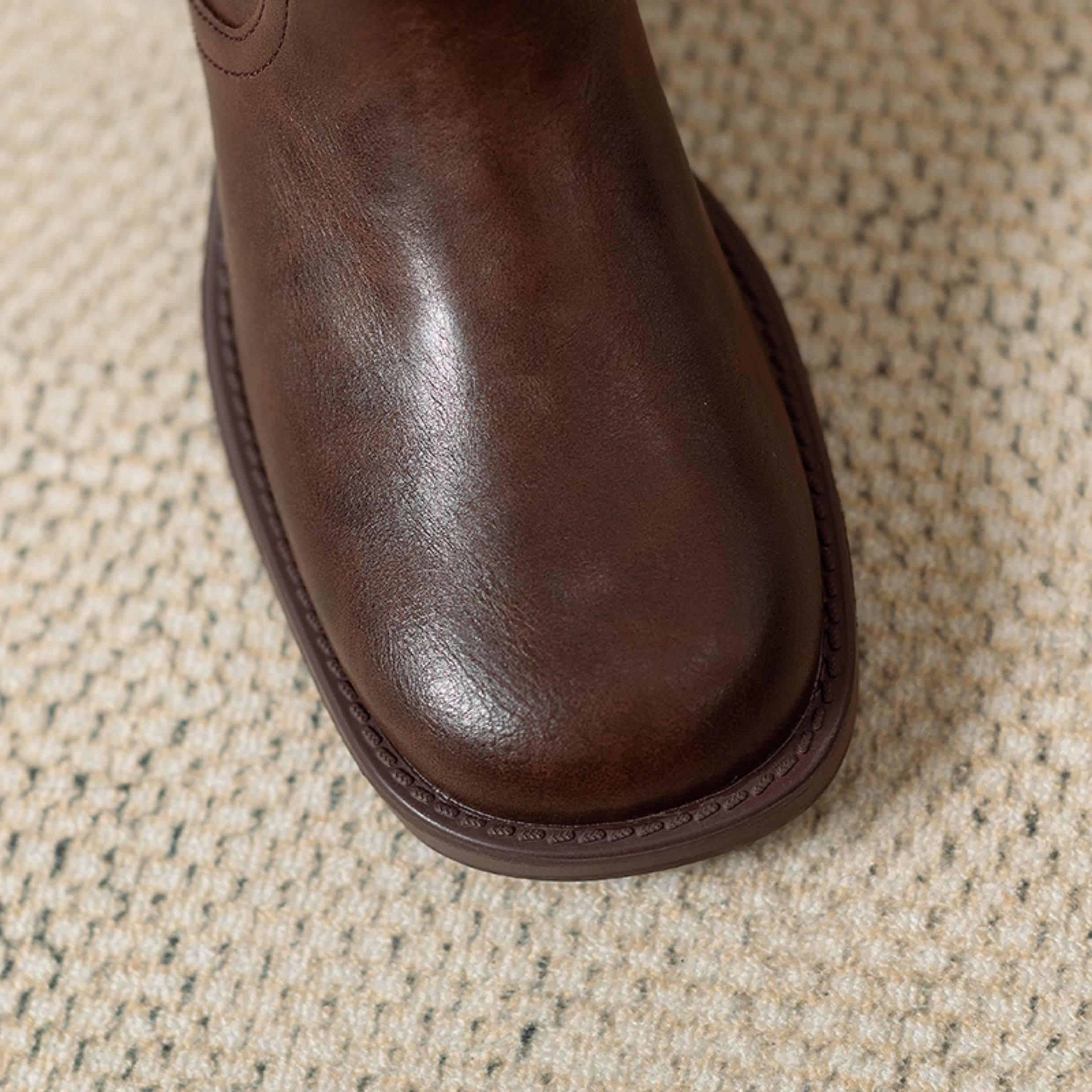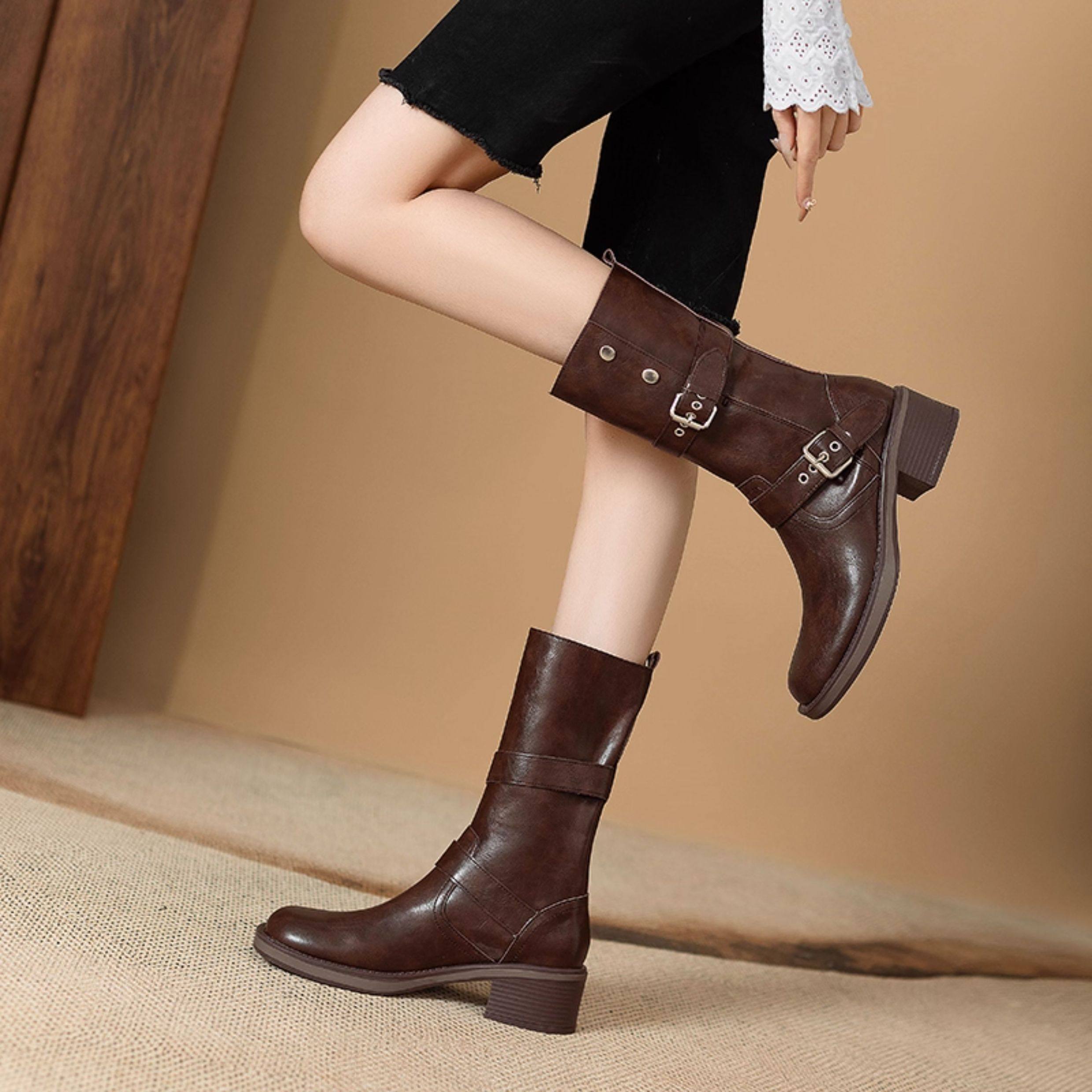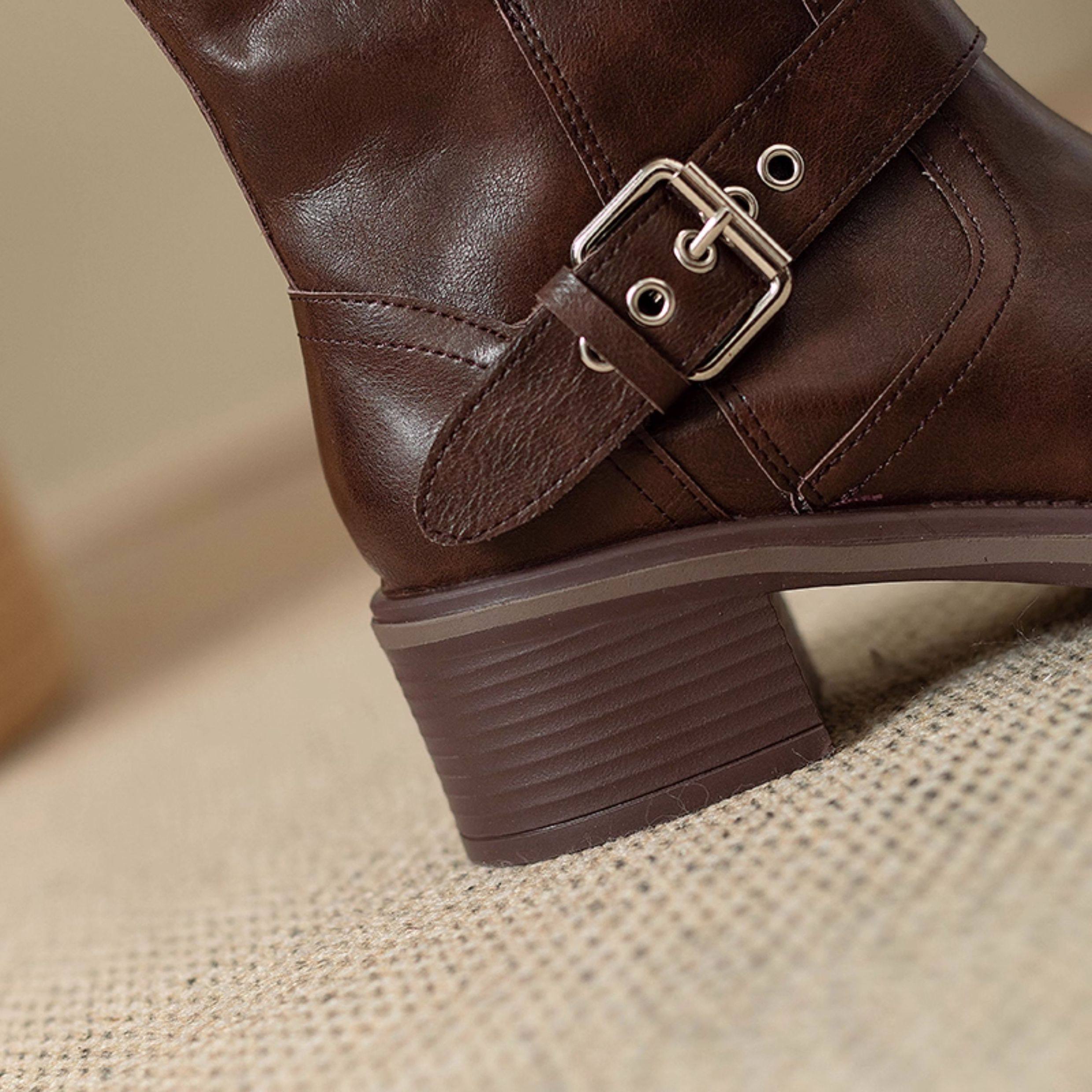 閉眼入秋冬新款復古皮帶釦西部騎士靴鉚釘厚底真皮粗跟中筒馬丁靴