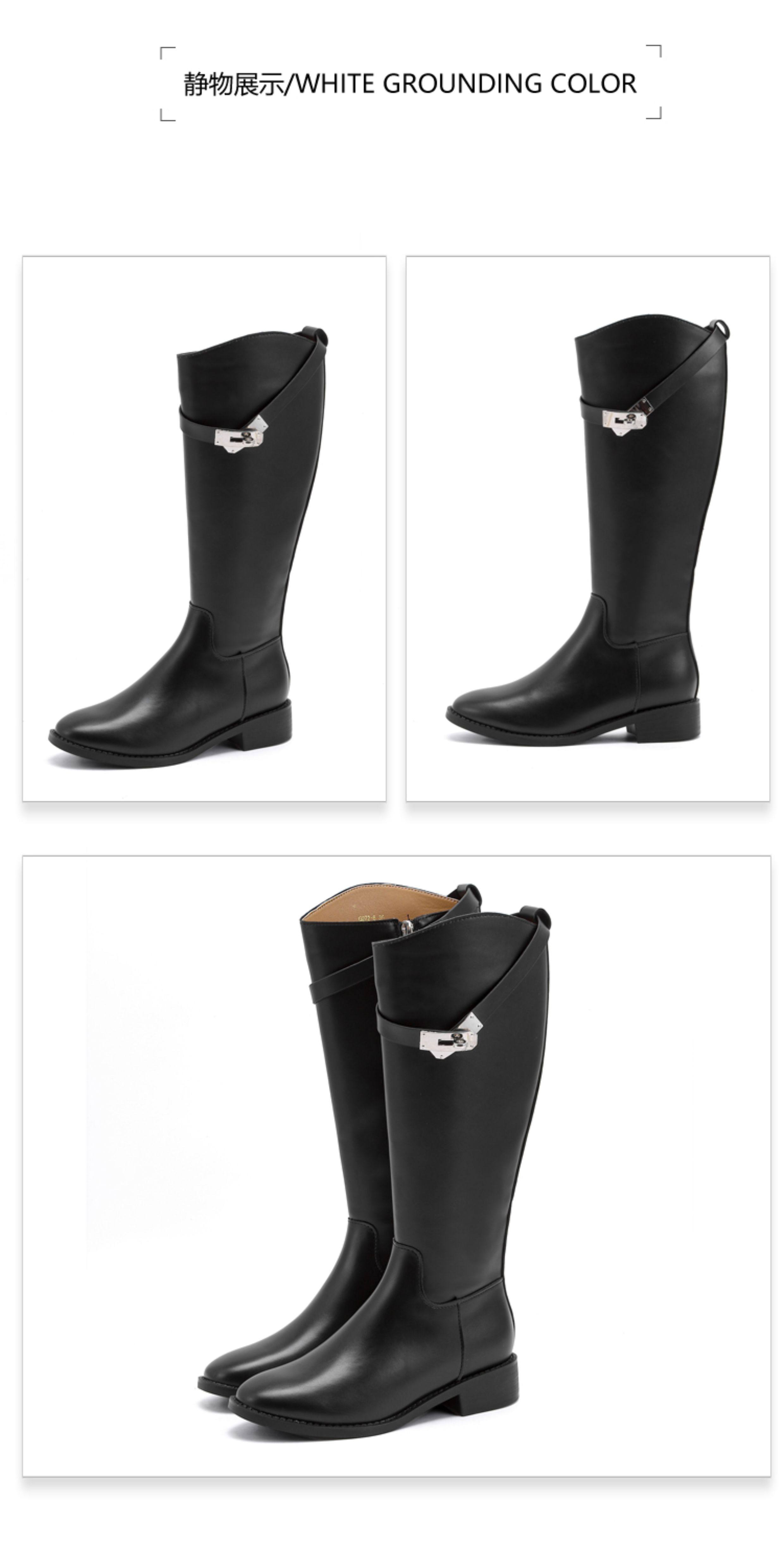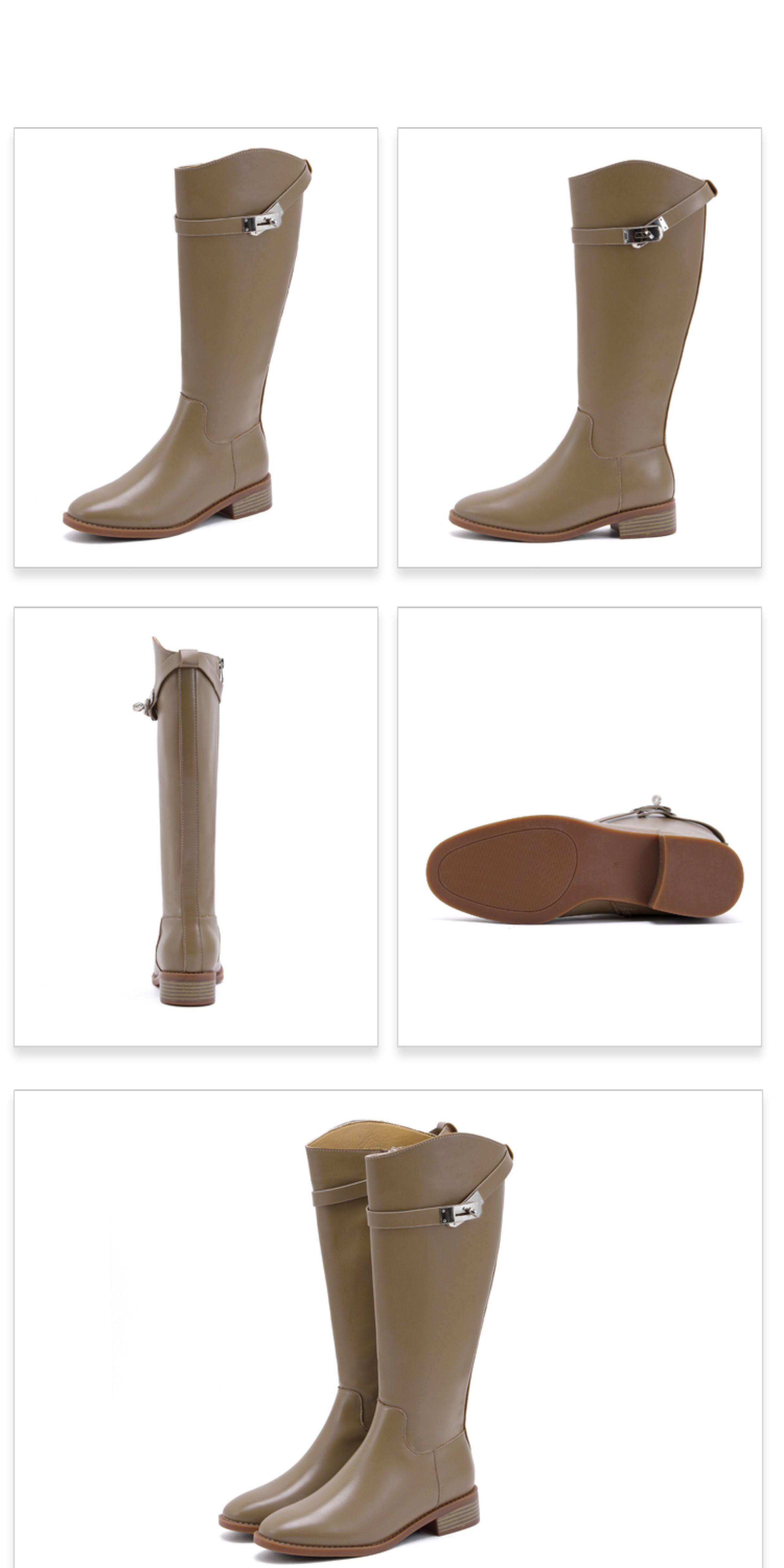 羊皮版~2025金屬鎖釦騎士靴小圓頭不過膝長靴女斜口釦帶高筒靴女