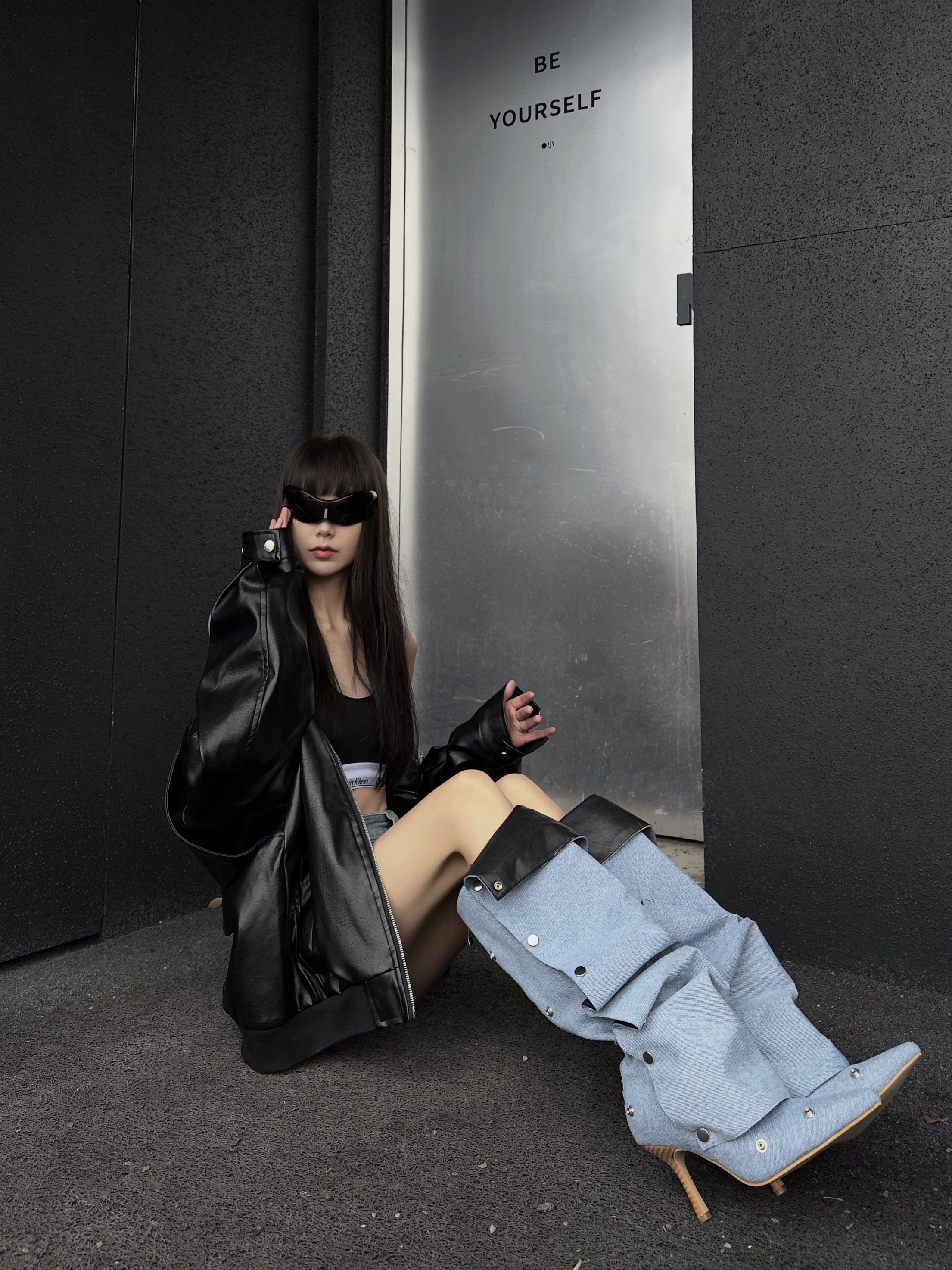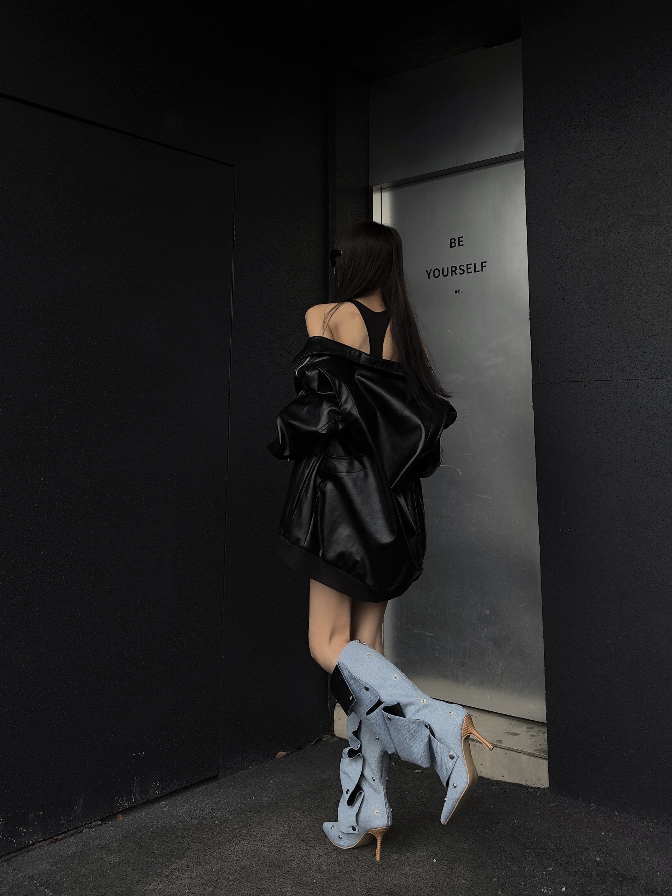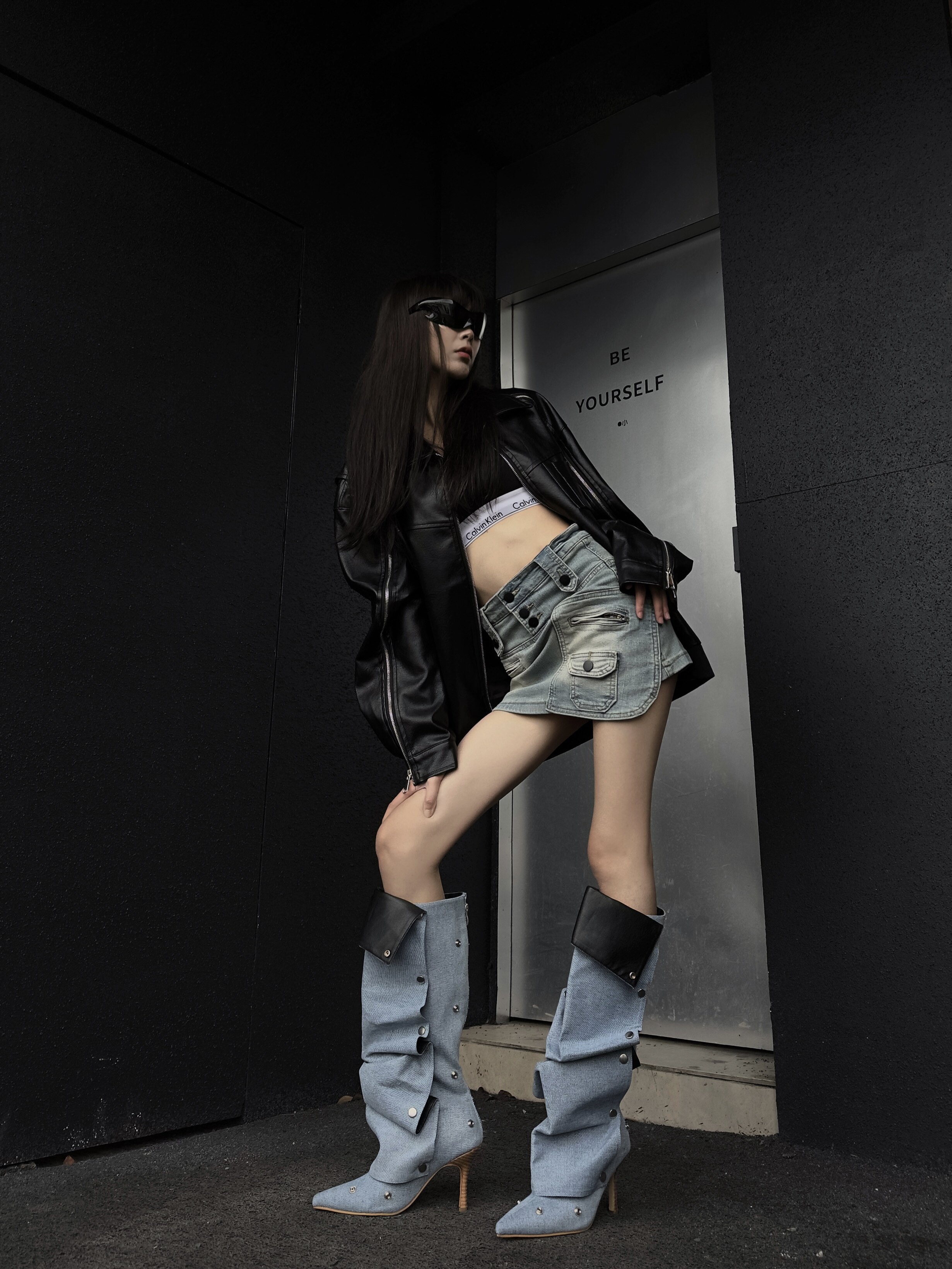 紐釦拼接兩穿堆堆靴2026春夏新款辣妹高跟時裝靴女尖頭細跟長筒靴