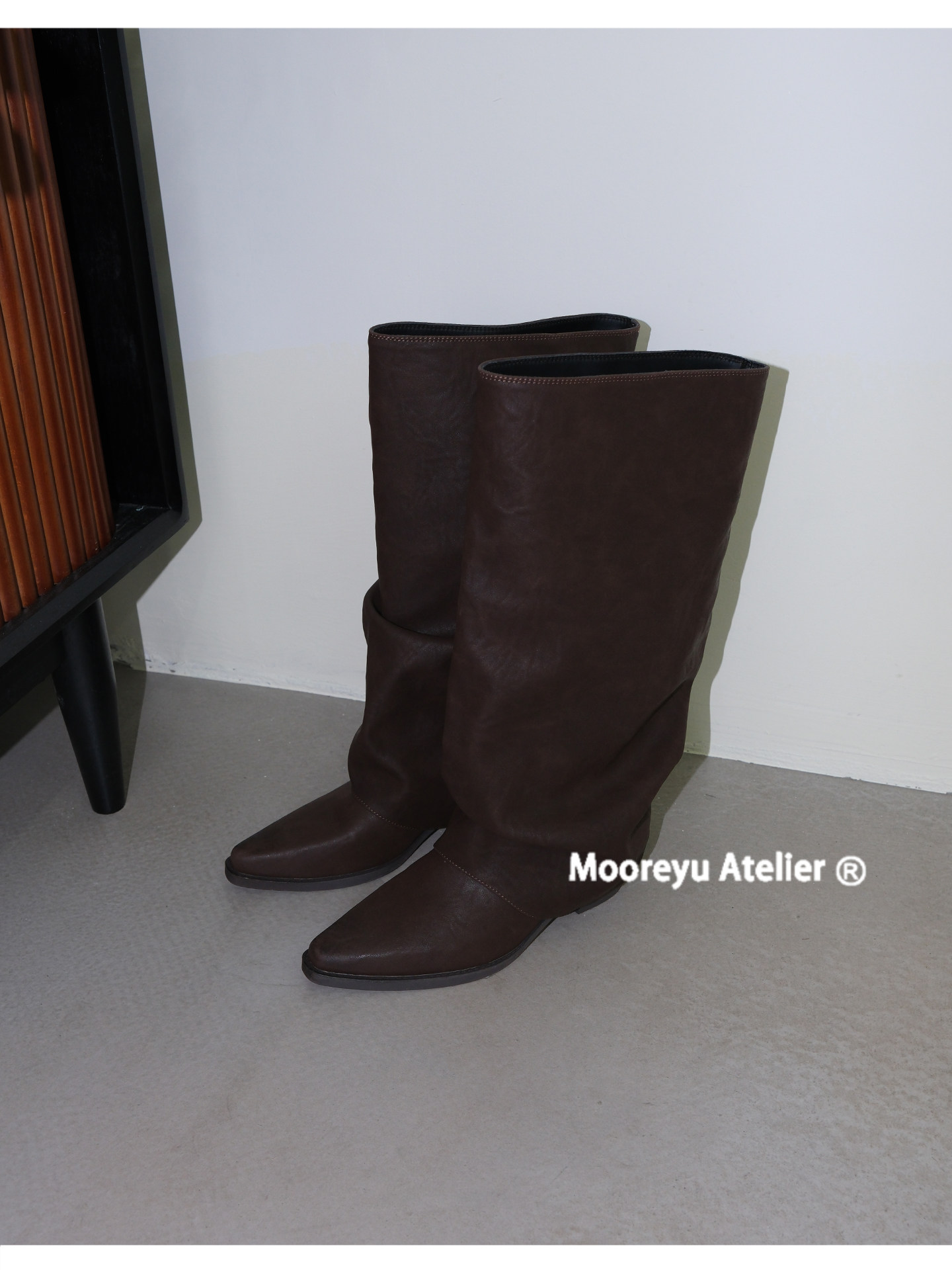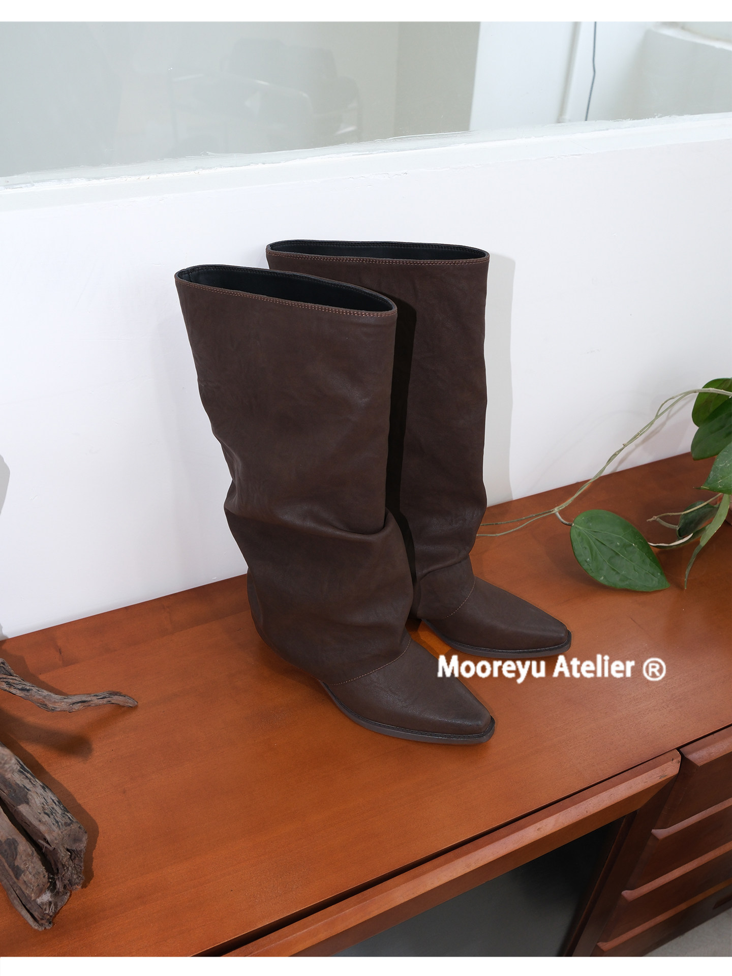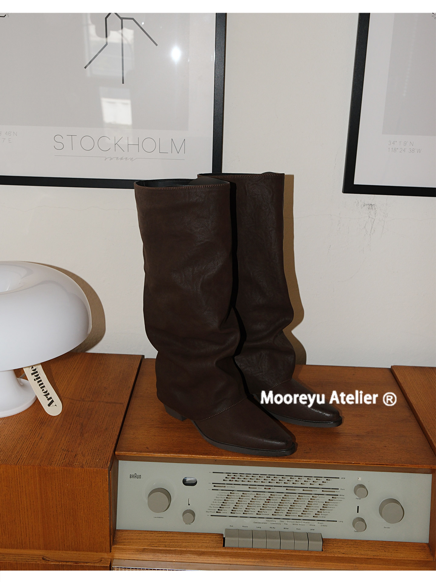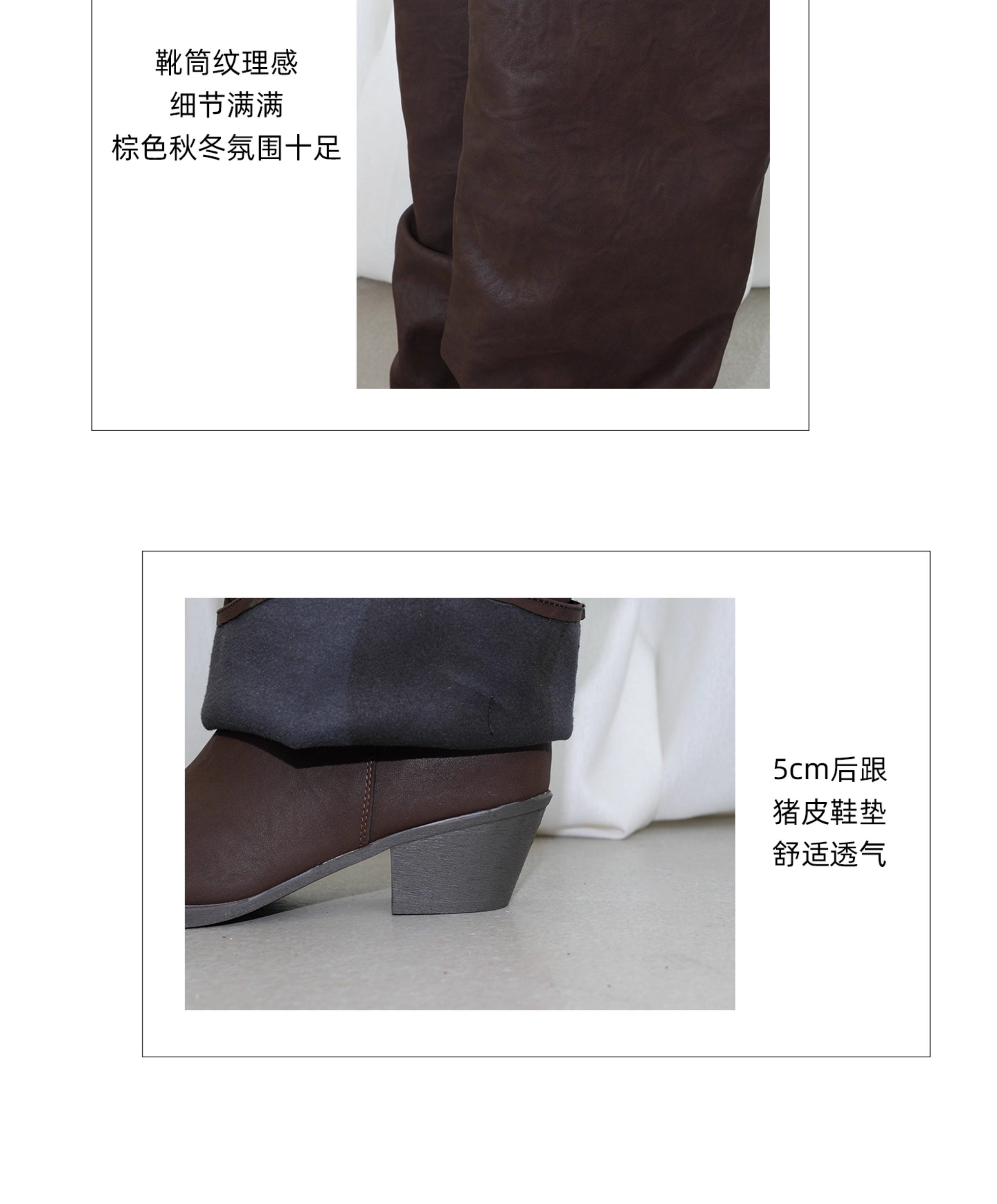 Mooreyu原創棕色褲琯靴女春夏復古美拉德尖頭騎士辣妹粗跟長靴女