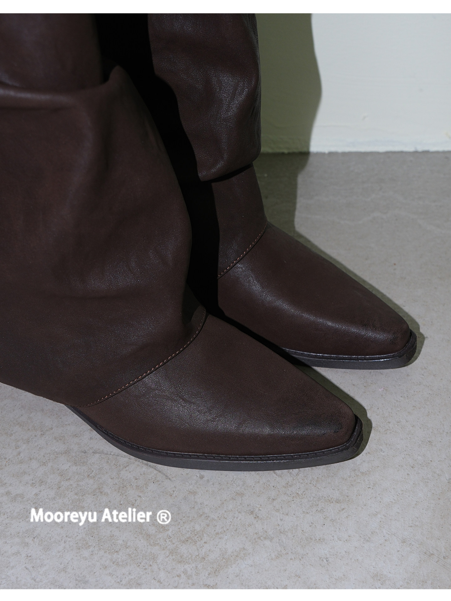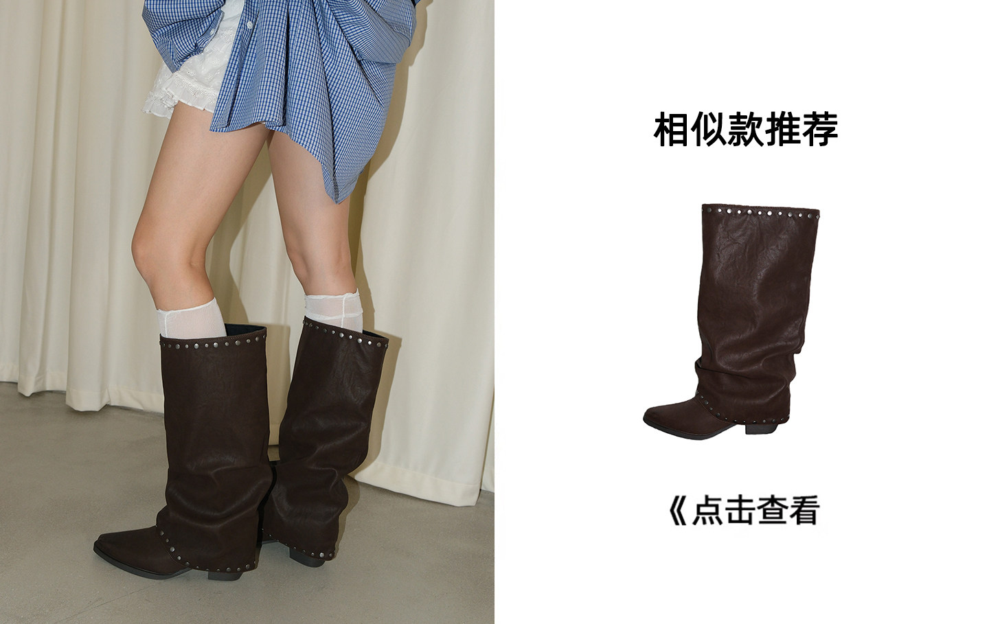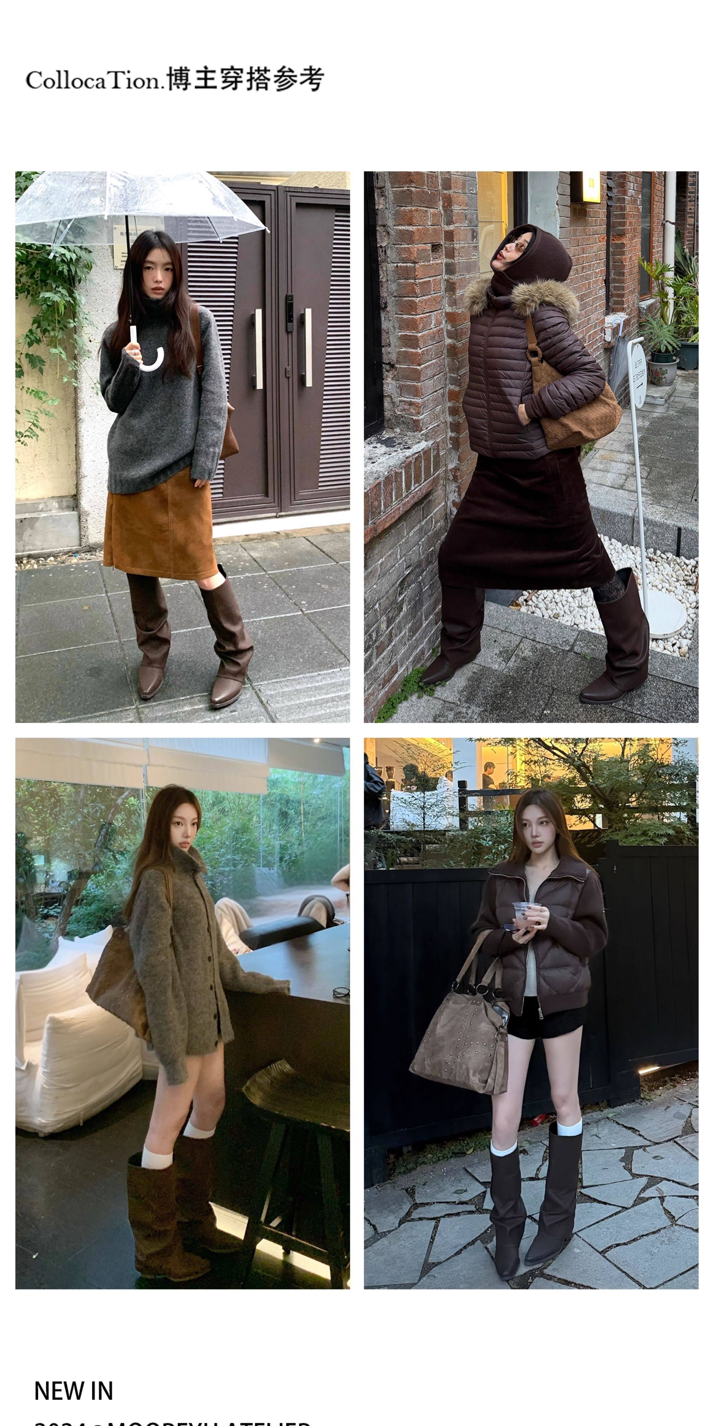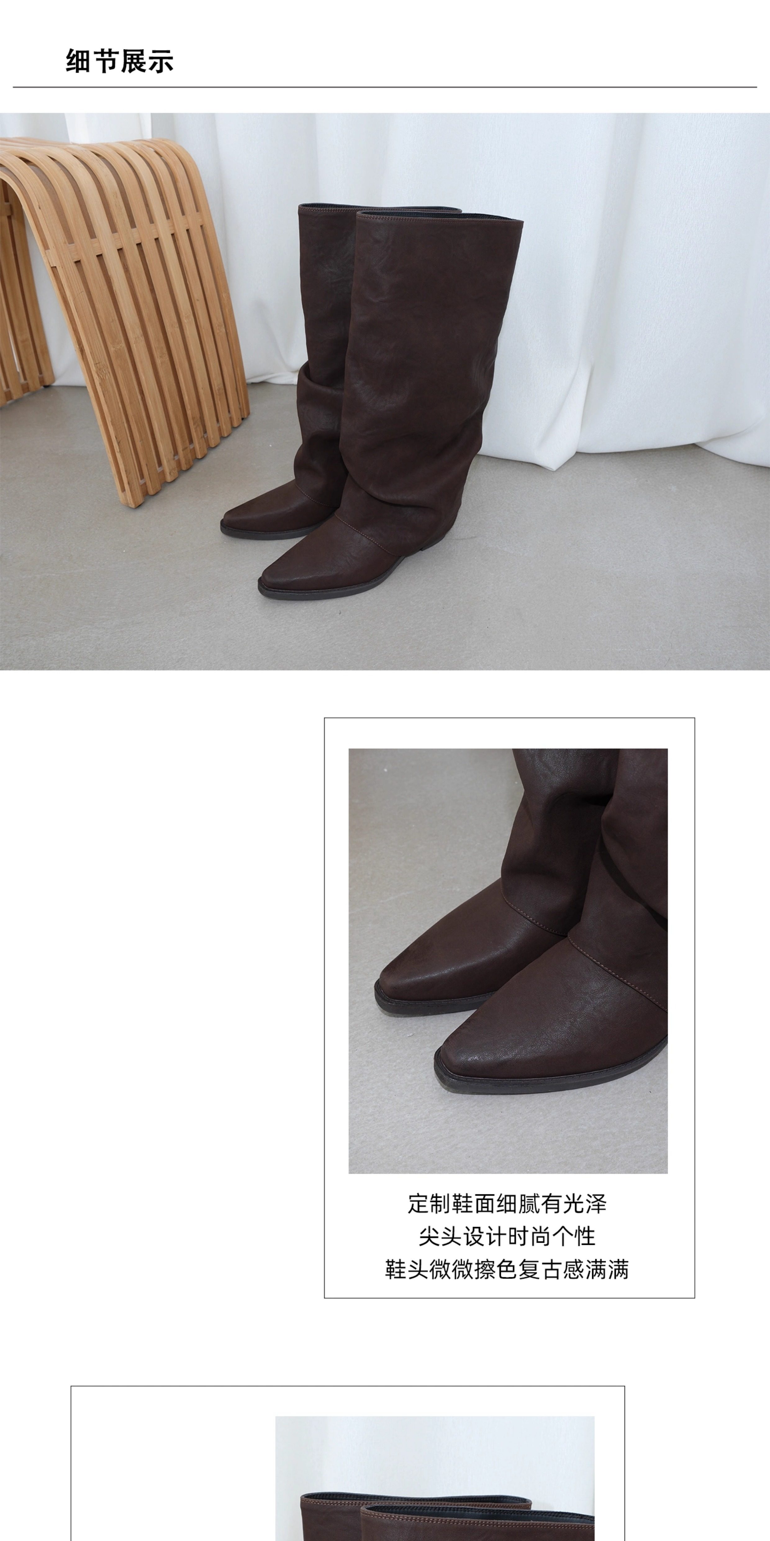 Mooreyu原創棕色褲琯靴女春夏復古美拉德尖頭騎士辣妹粗跟長靴女
