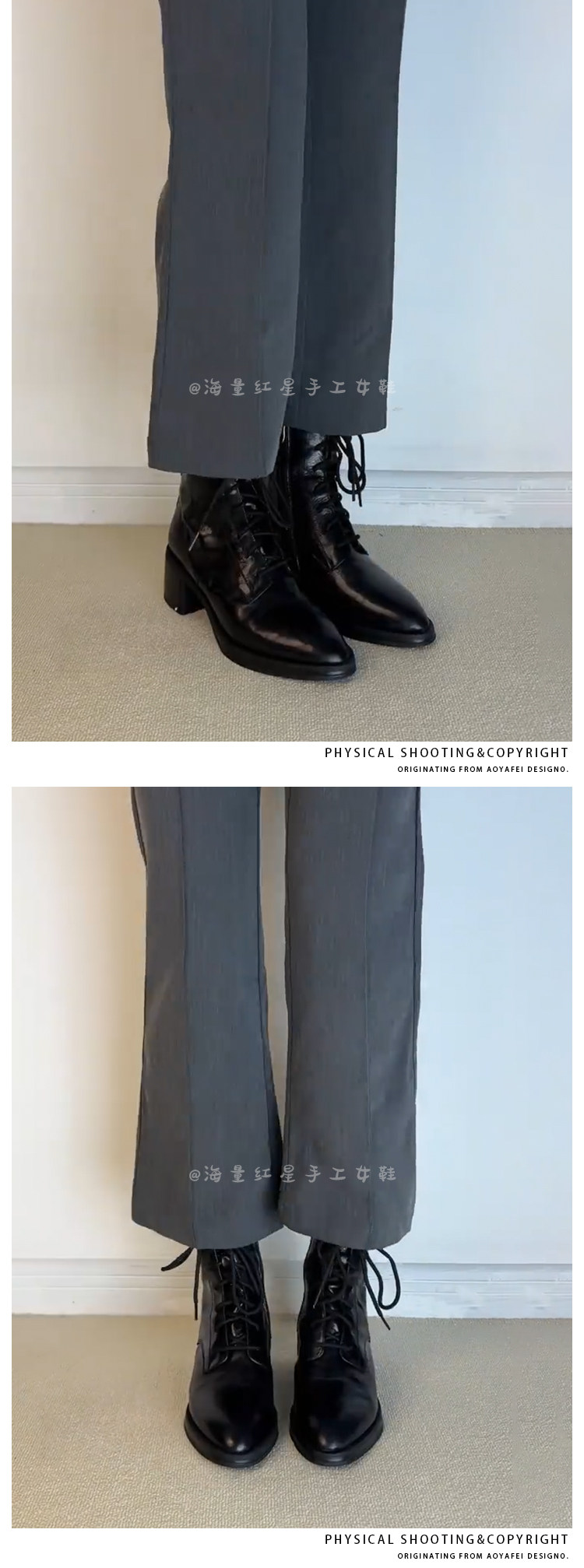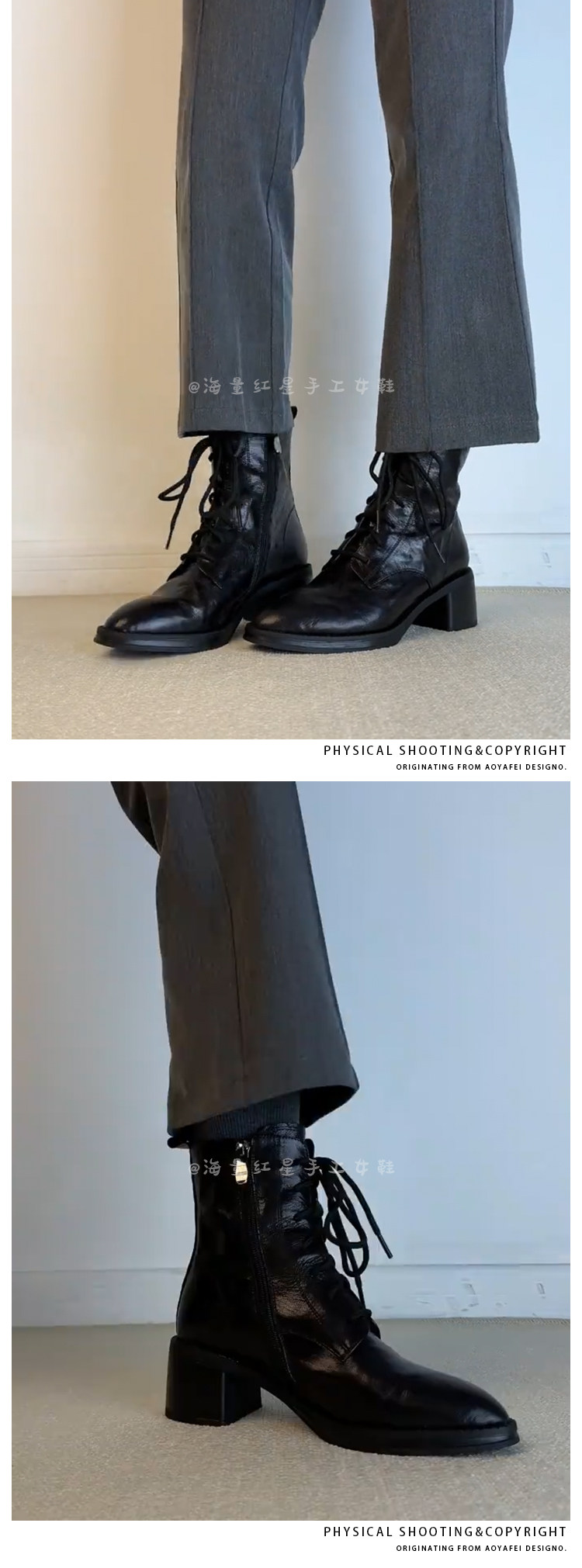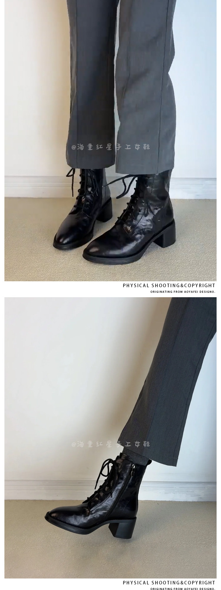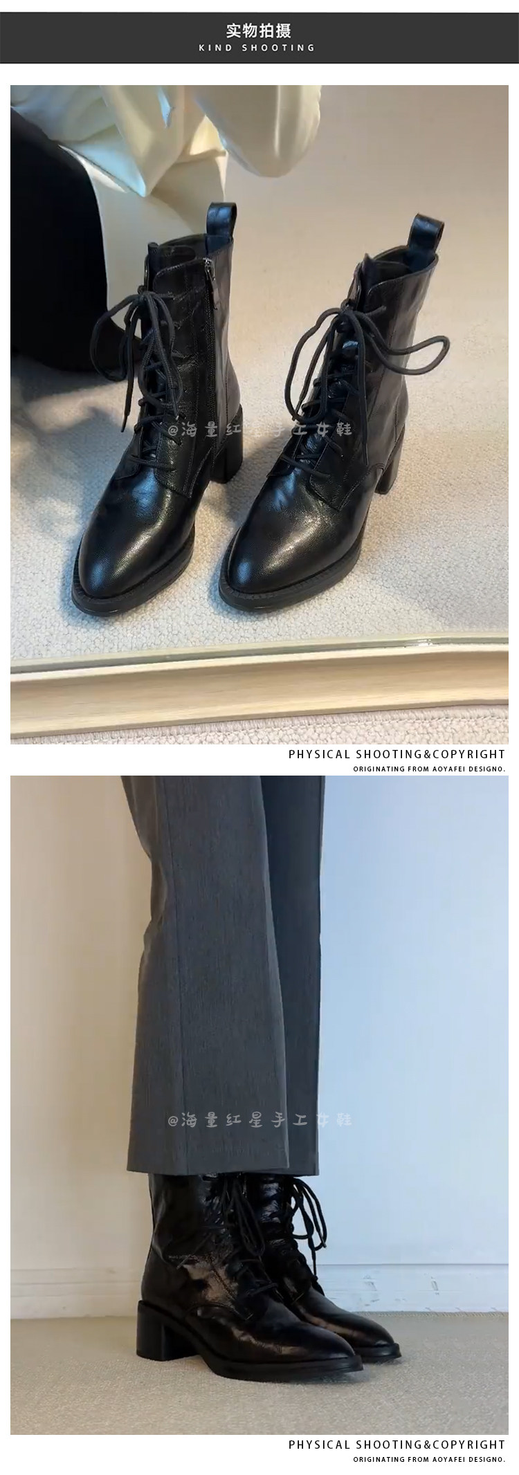 羊皮版~馬丁靴女新款英倫風百搭尖頭粗跟系帶側拉鍊顯瘦高跟短靴
