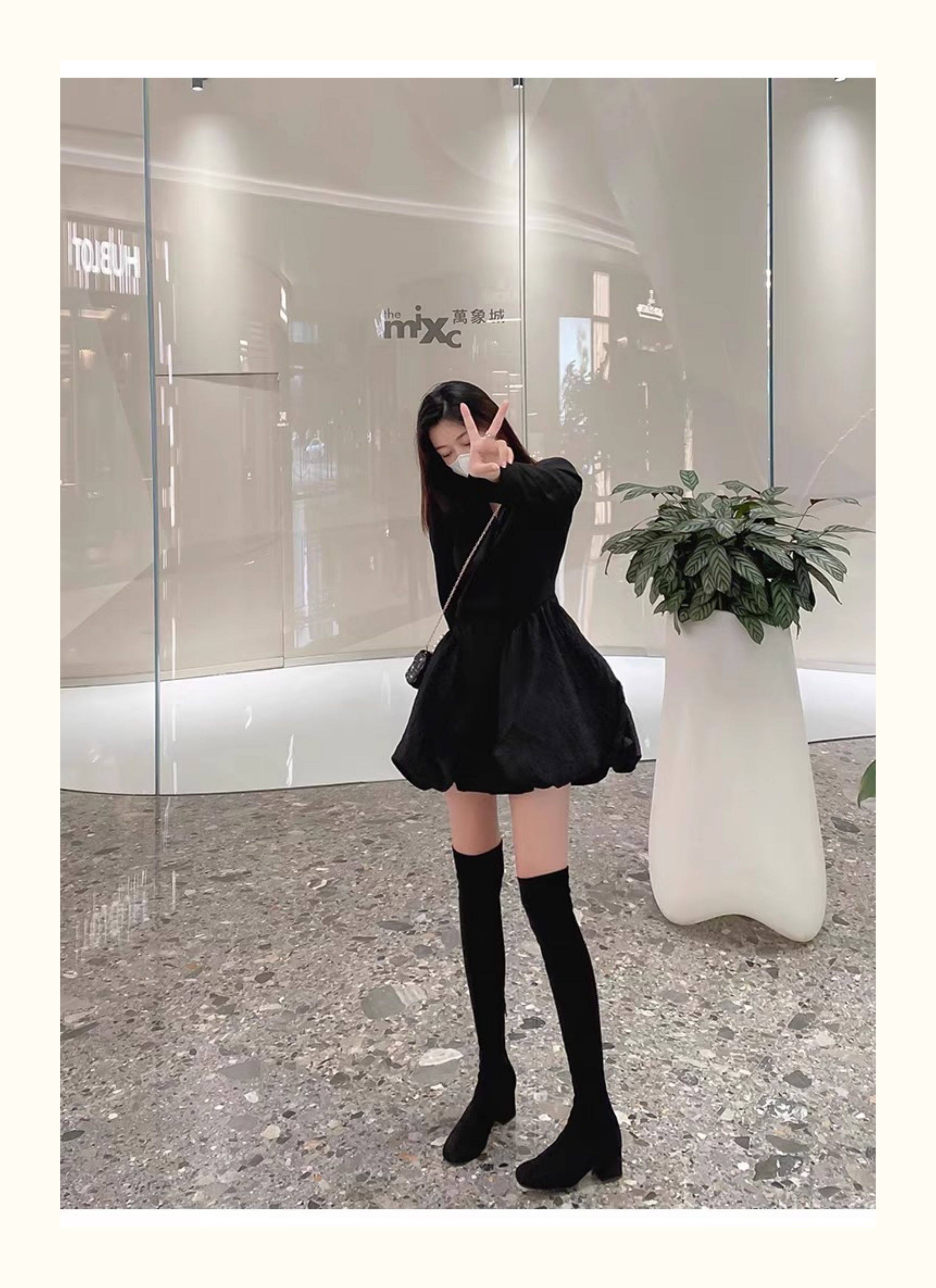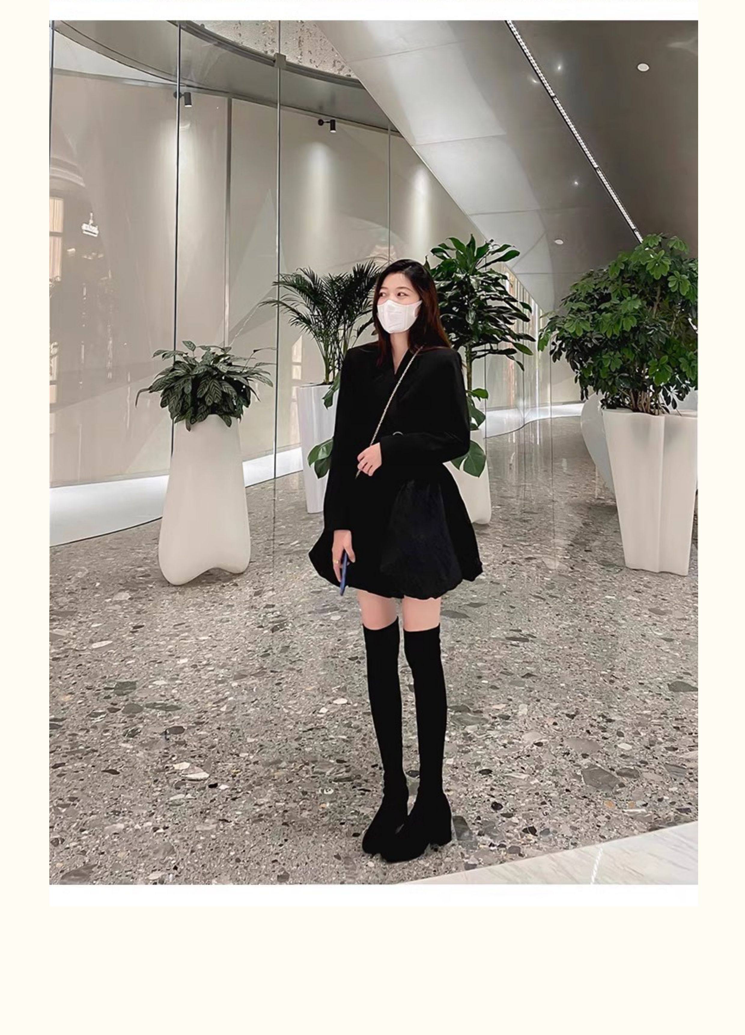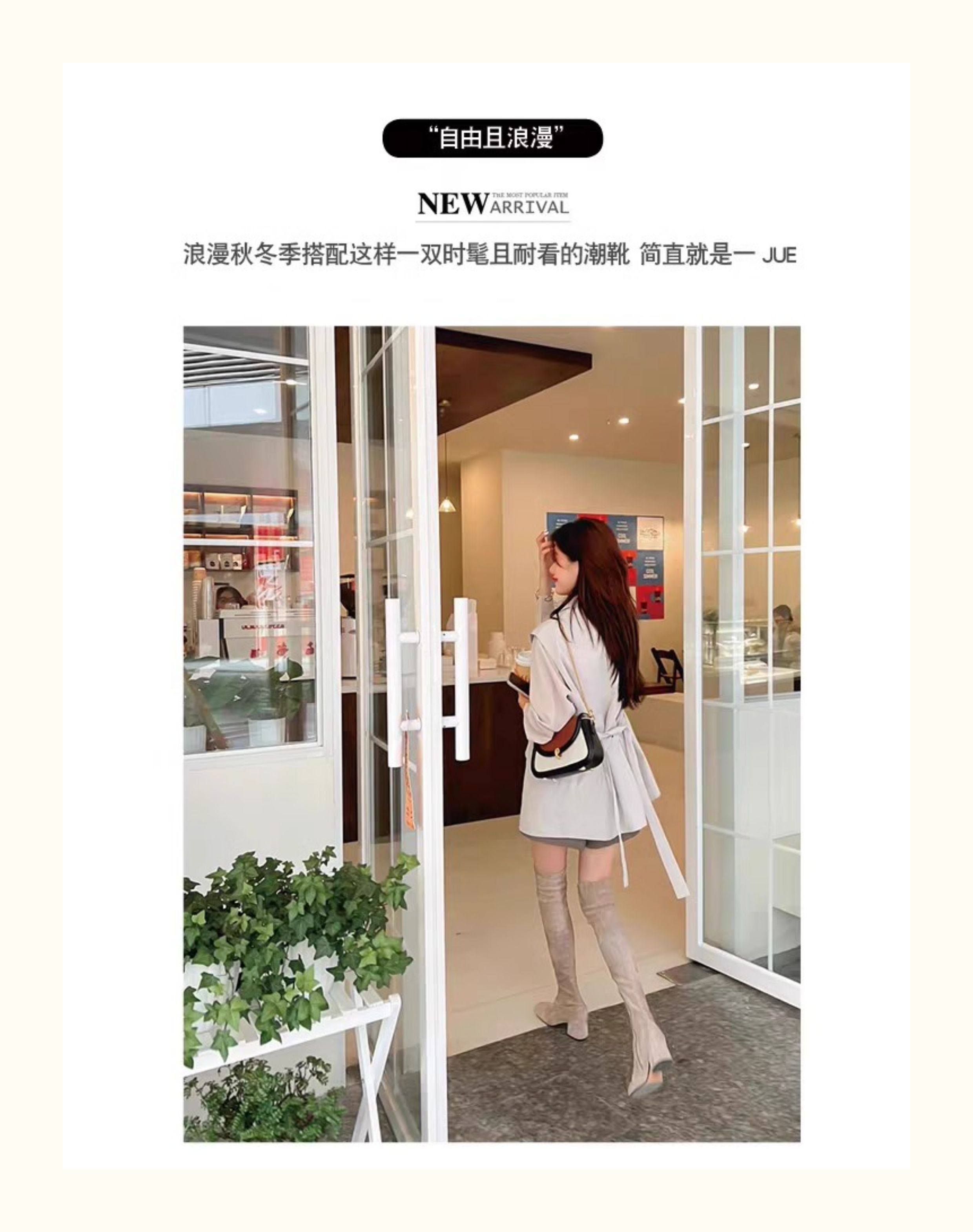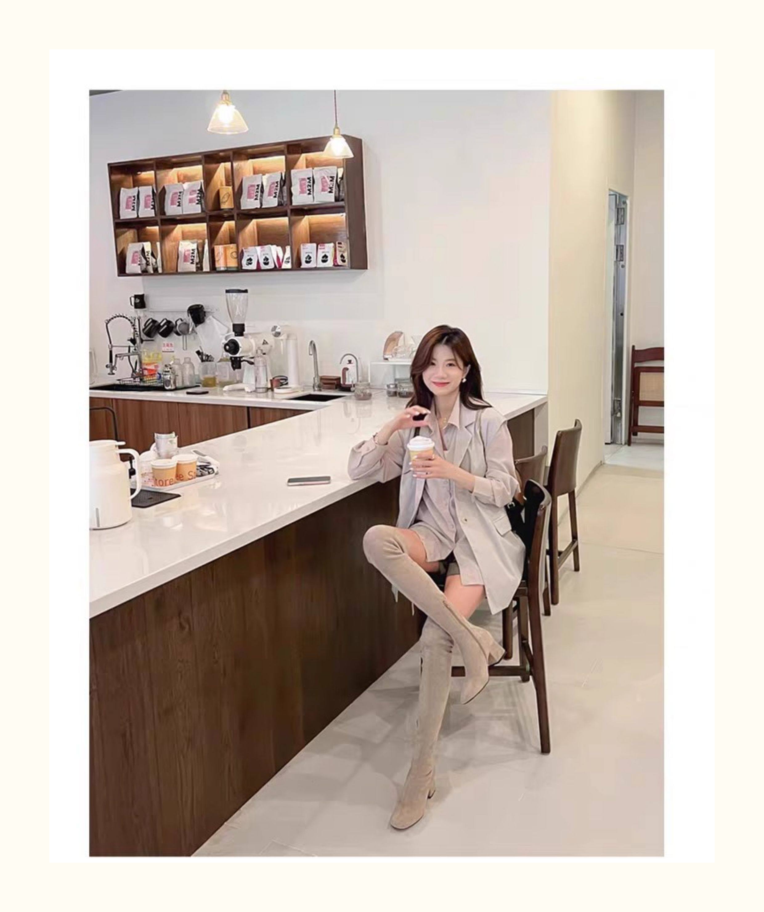 過膝靴女高跟彈力長筒靴秋冬季圓頭小個子絨面粗跟高筒瘦瘦長靴女