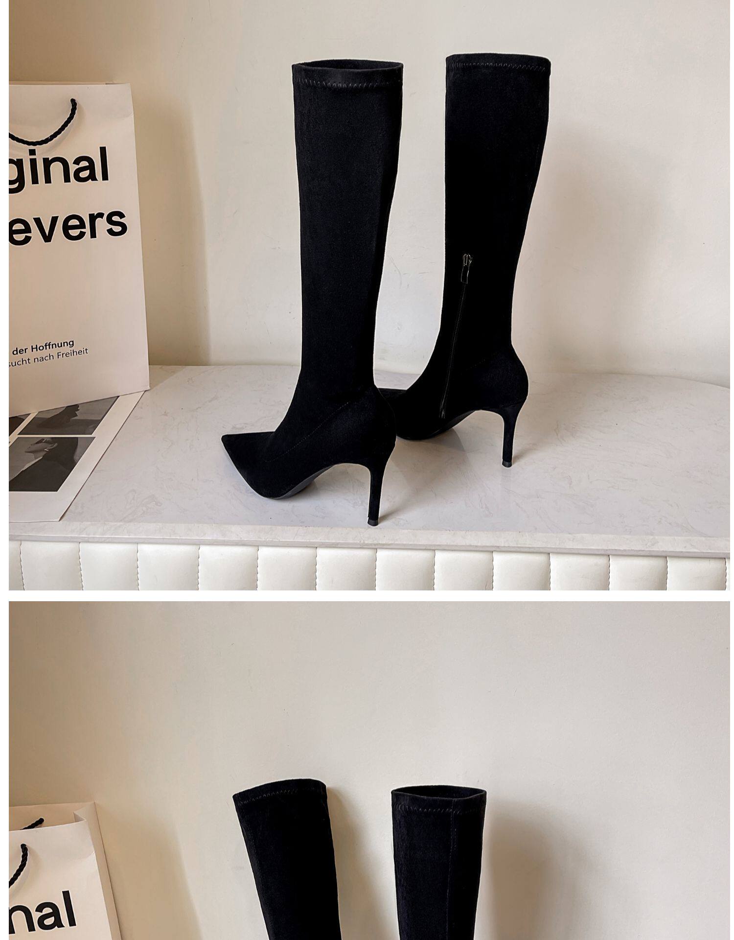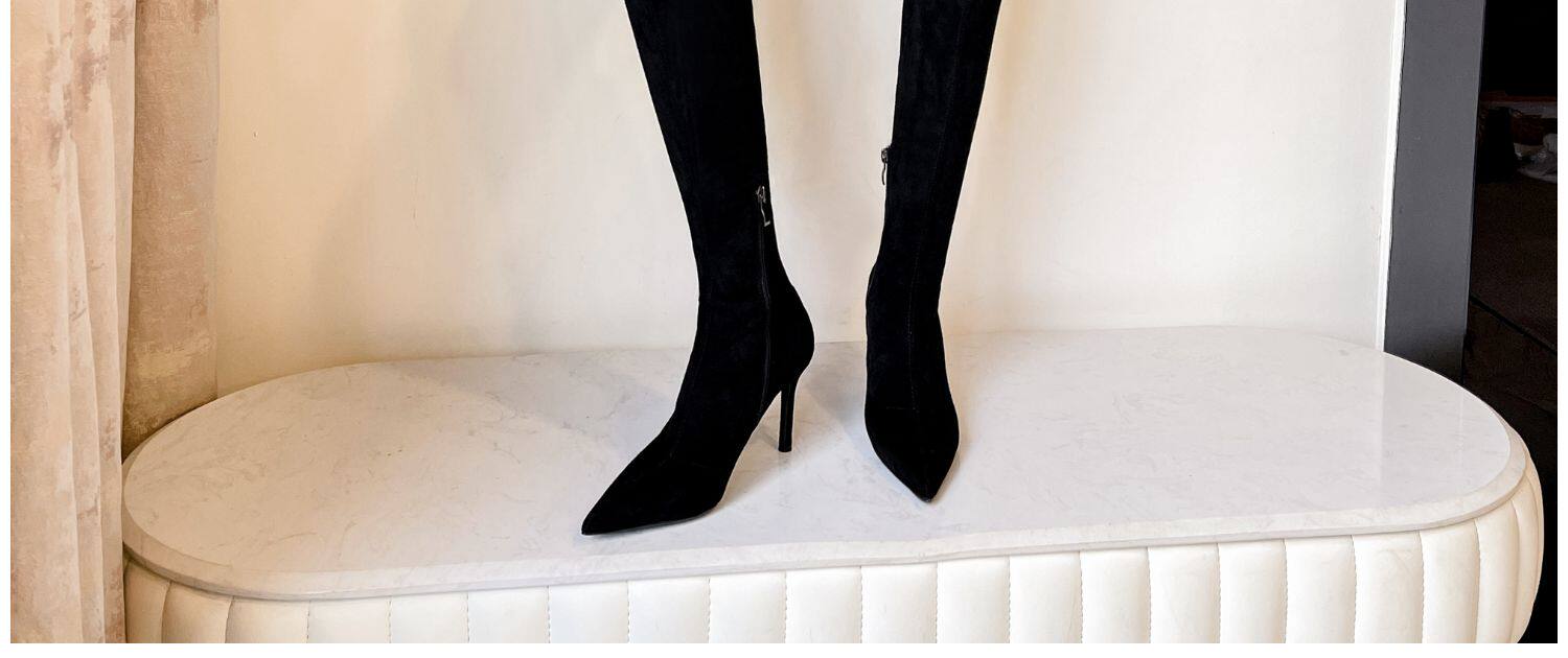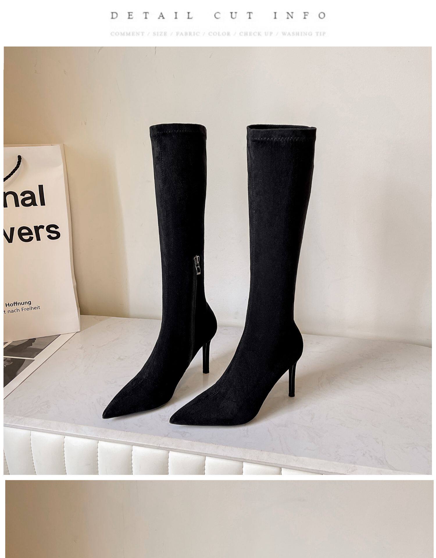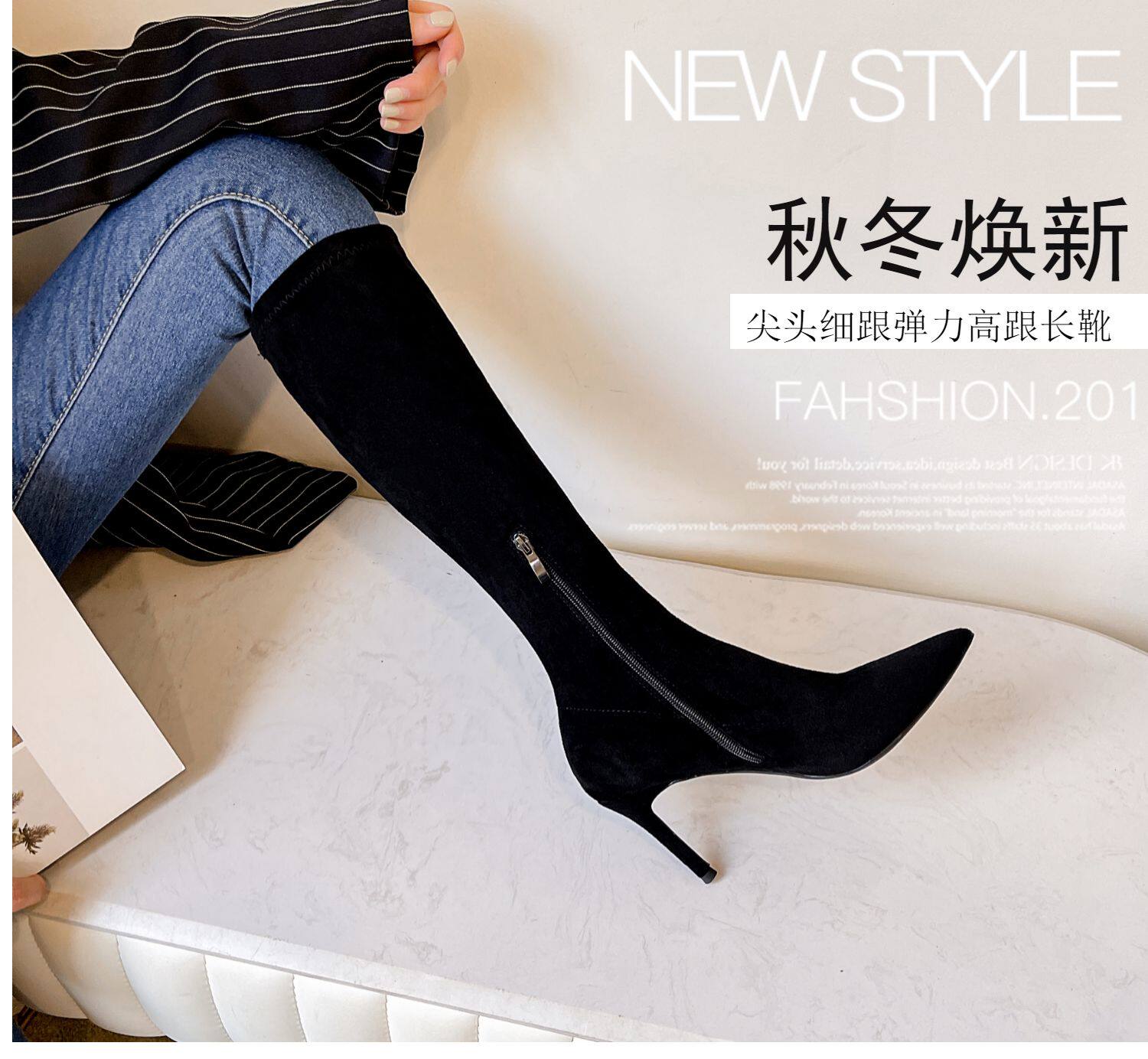 歐美2025秋冬季新款黑色顯瘦彈力靴尖頭高跟長靴女細跟瘦瘦靴子女