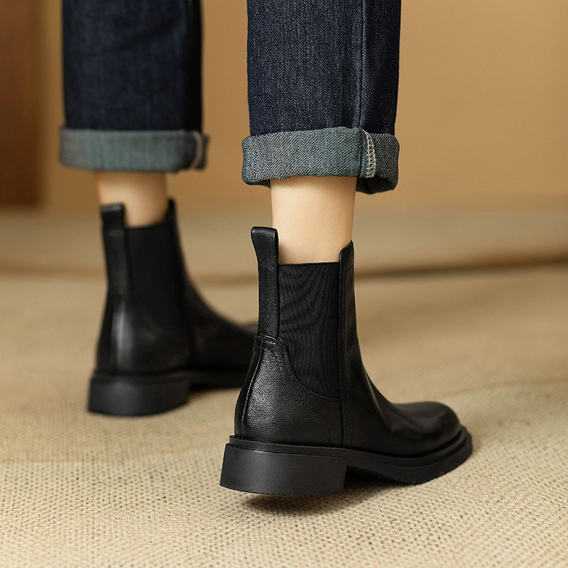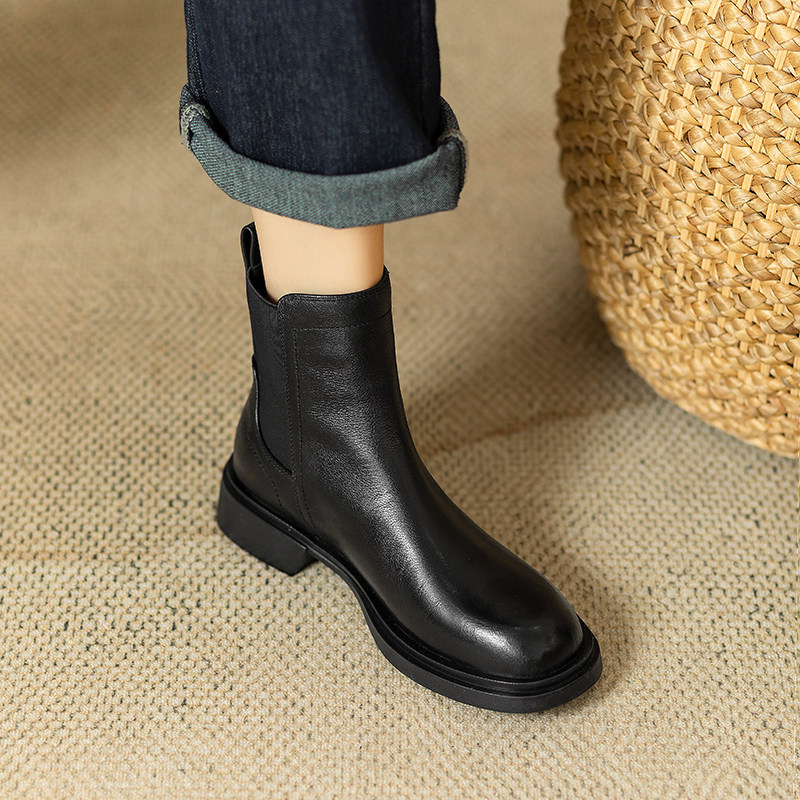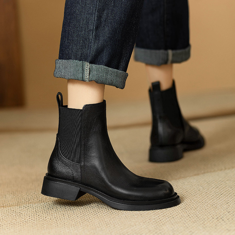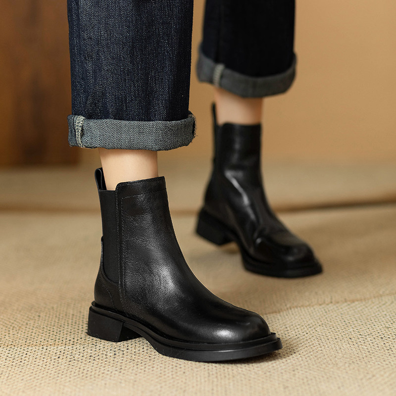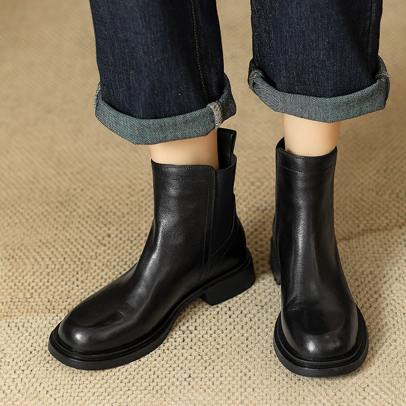 巨軟英倫風復古真皮圓頭馬丁靴女春秋單靴百搭舒適中跟切爾西短靴
