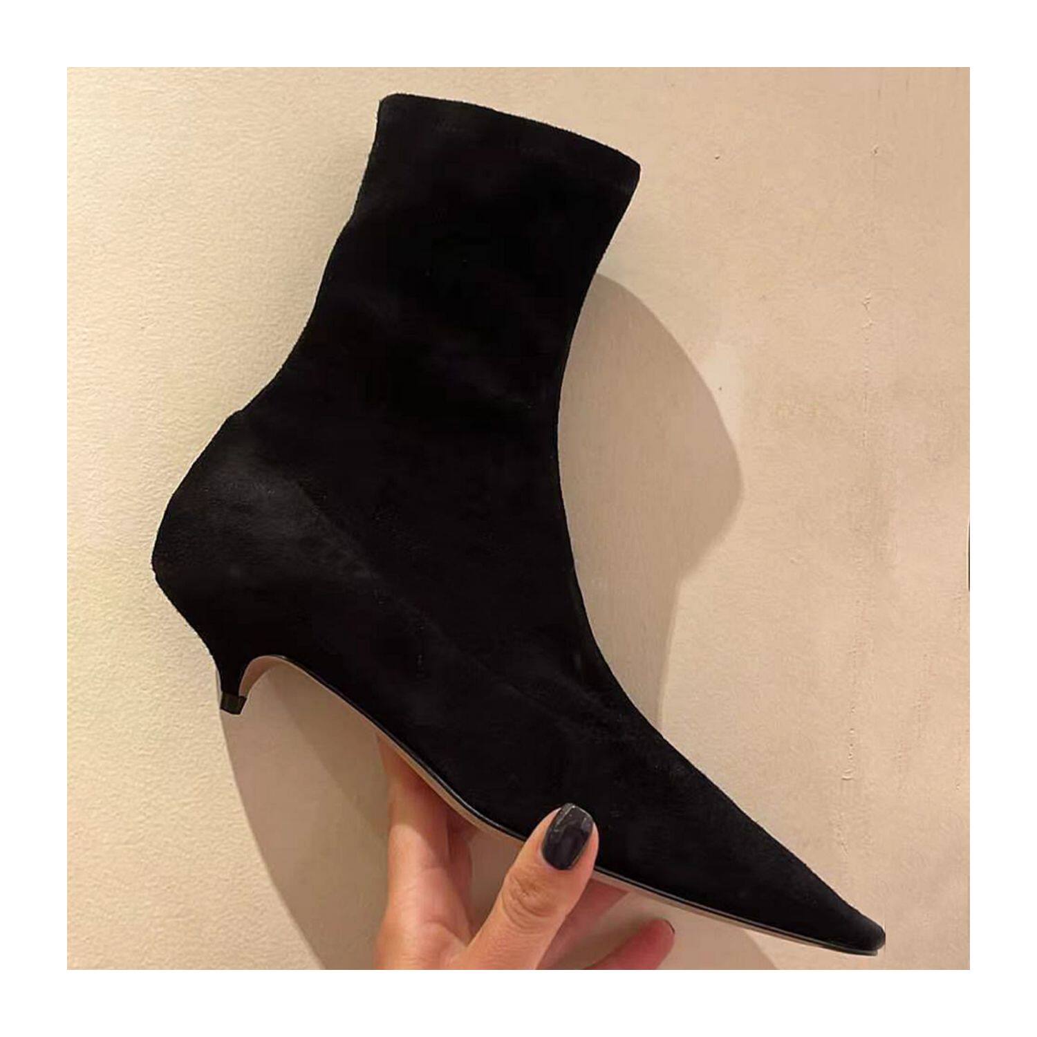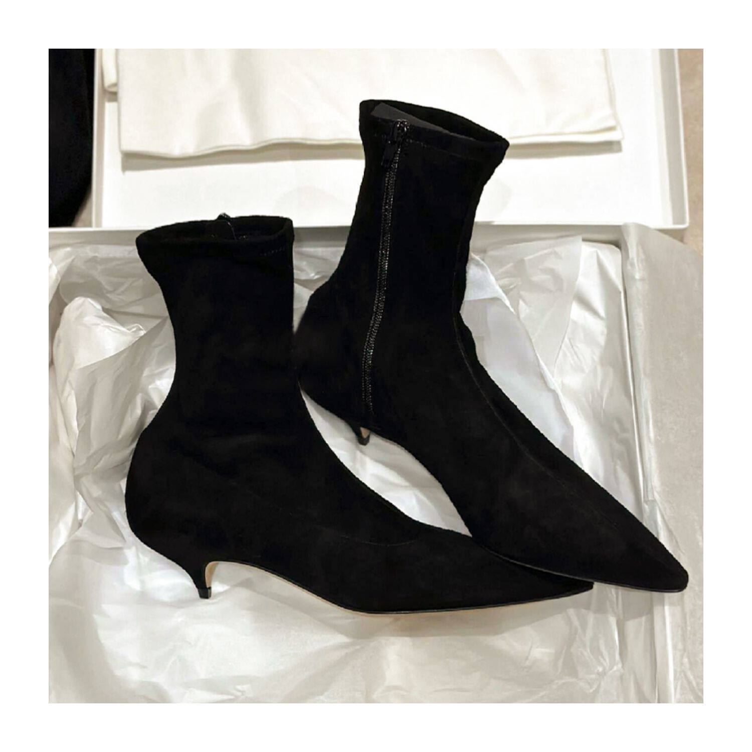 法式彈力瘦瘦靴尖頭側拉鍊2025年新款黑色絨面韓系小踝靴貓跟短靴