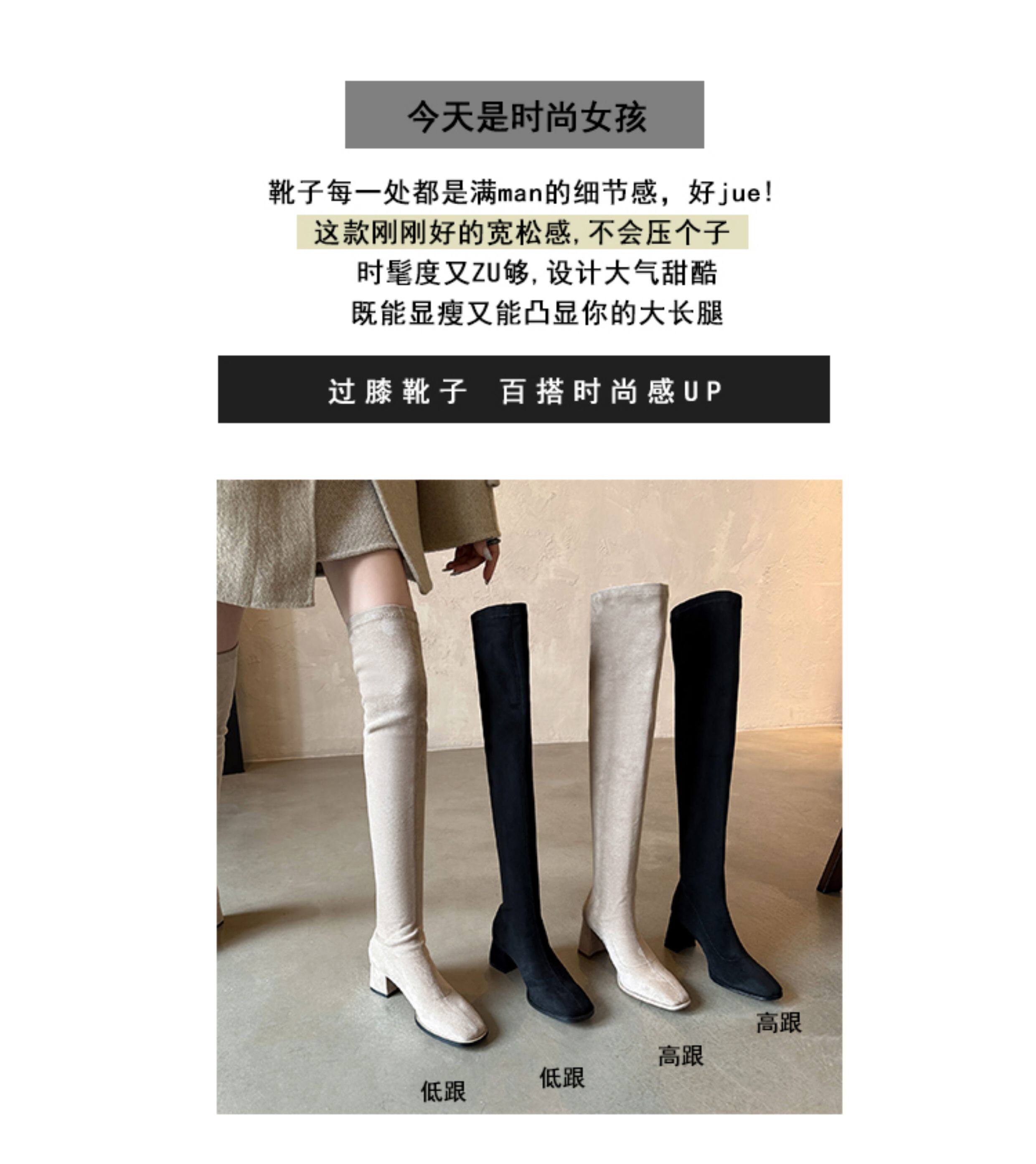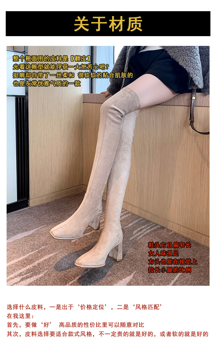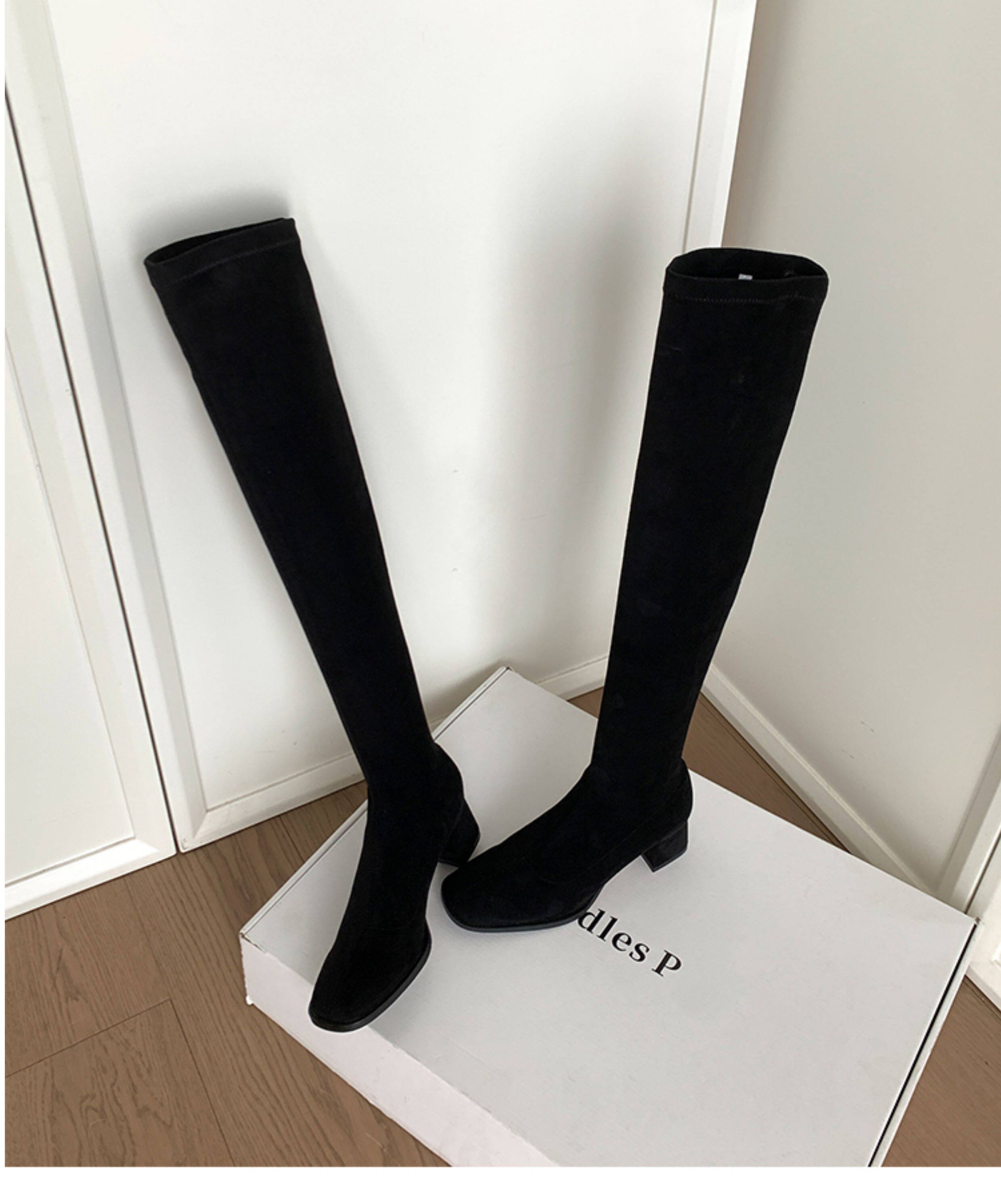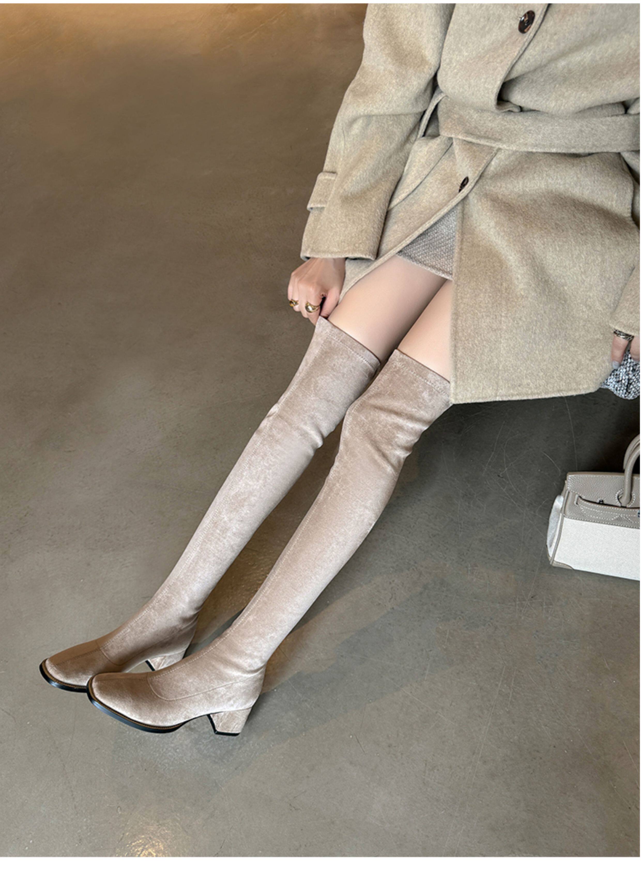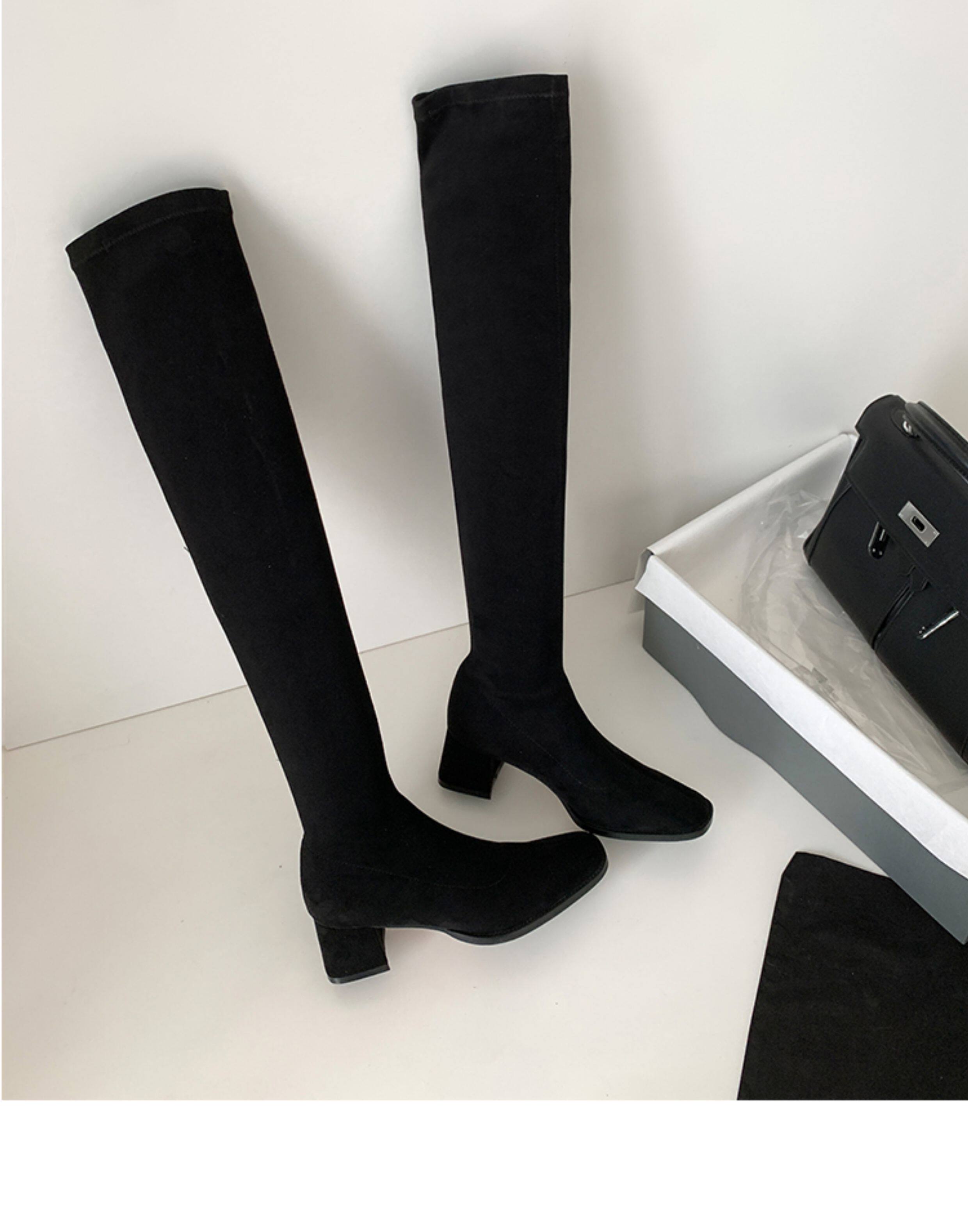 西魚許5050方頭粗跟瘦腿過膝長靴女高跟高筒靴秋冬顯瘦彈力長筒靴